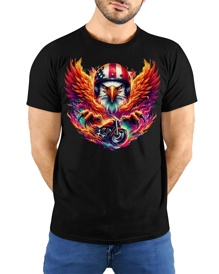 The American Eagle Biker Fire Wings Graphic T-Shirt is the ultimate statement piece for those who live for freedom, speed, and bold style. Featuring a fierce bald eagle with fiery wings, wearing a patriotic USA helmet, and riding a motorcycle, this tee combines iconic American symbols with biker spirit. Its dynamic flame design and vibrant colors make it stand out from every angle.