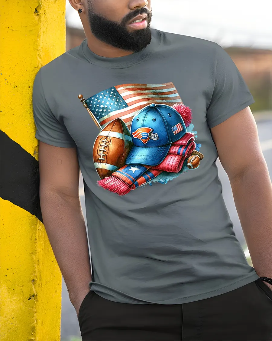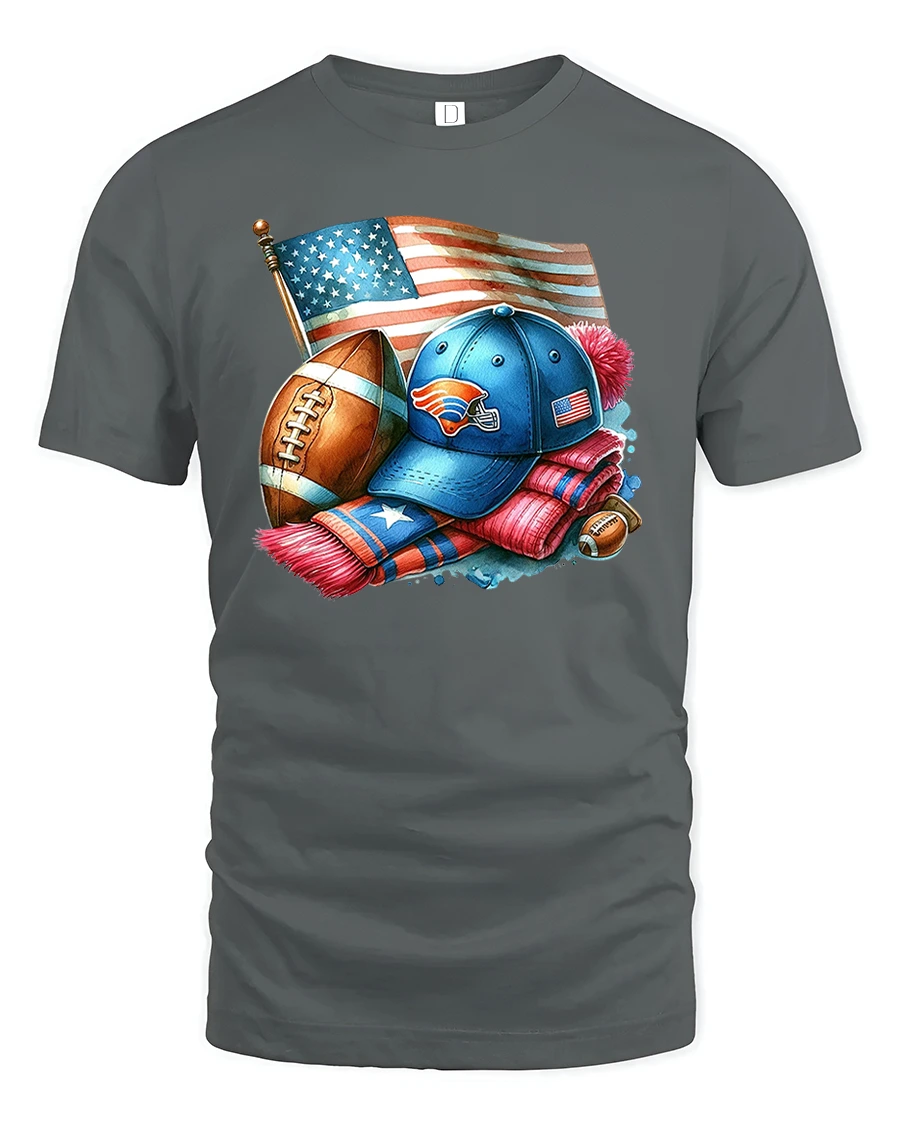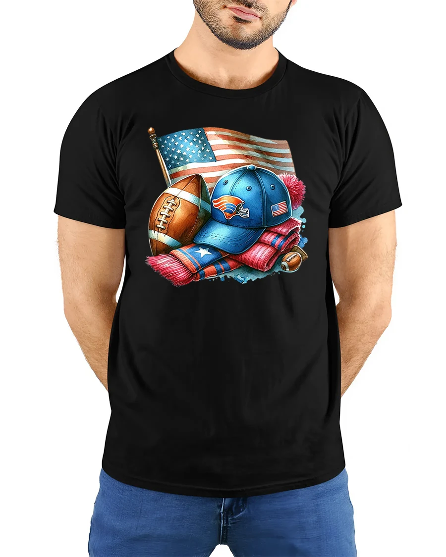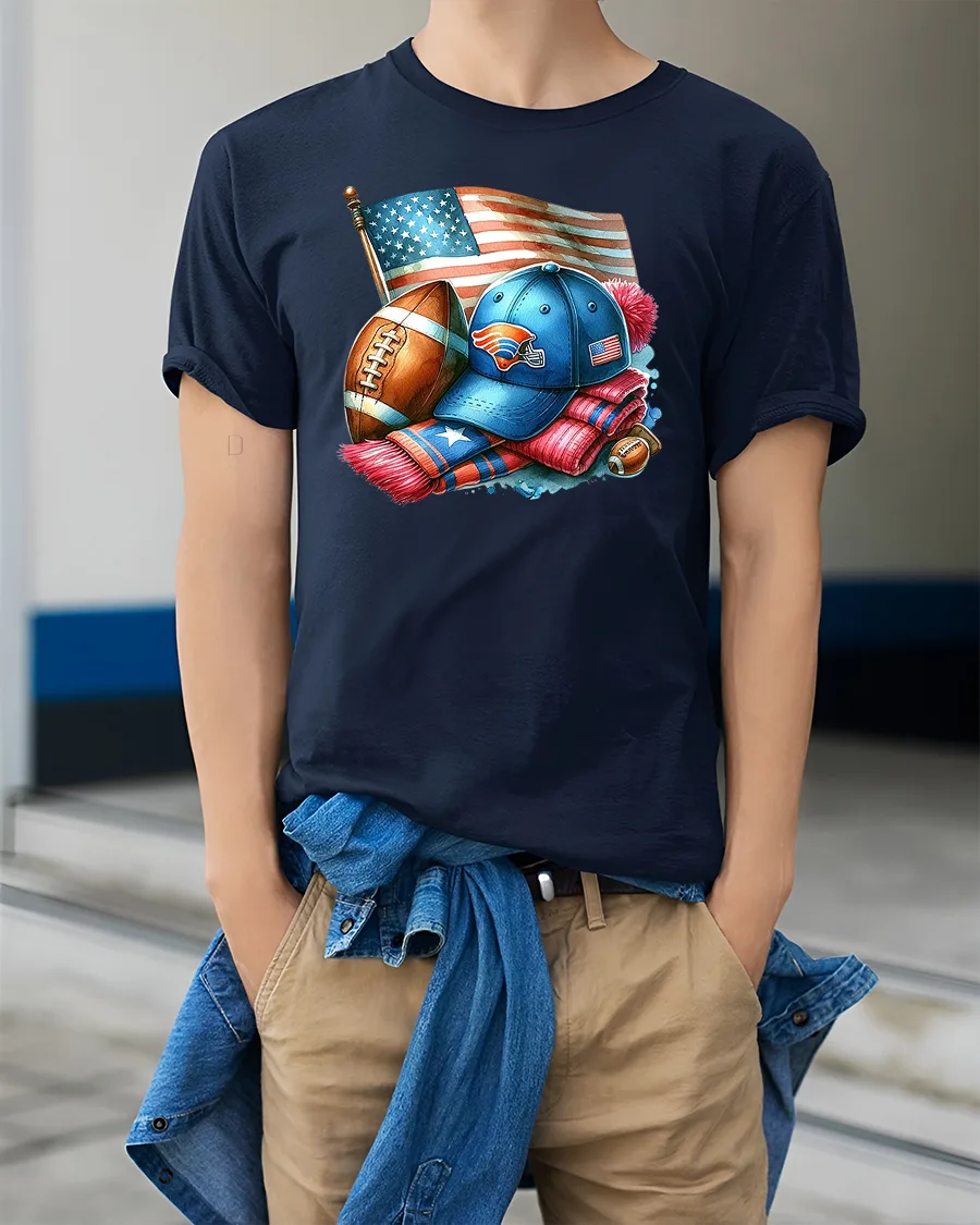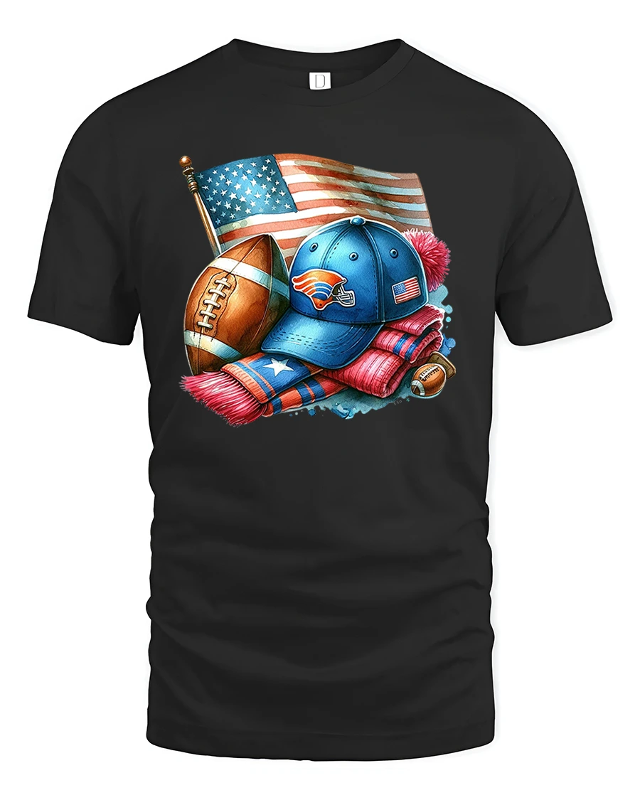 The American Football Fan USA Flag Patriotic Graphic Tee is the ultimate shirt for sports lovers who want to showcase both their team spirit and national pride. Featuring a bold design with a football, cap, scarf, and the American flag, this shirt captures the excitement of game day while celebrating the red, white, and blue.