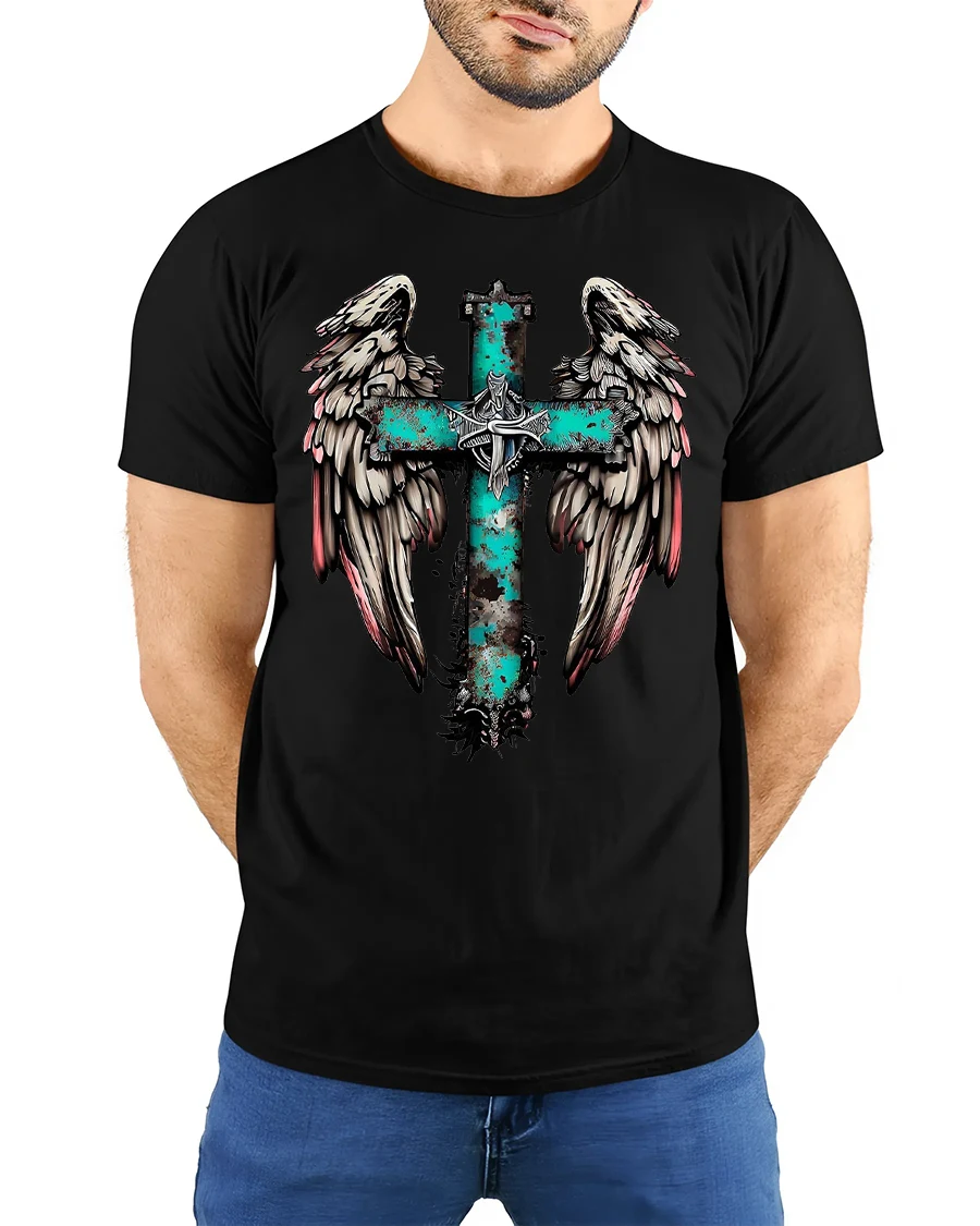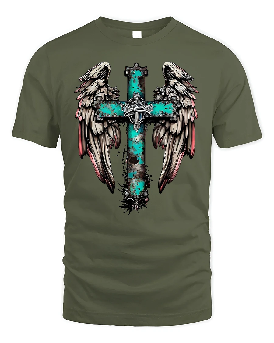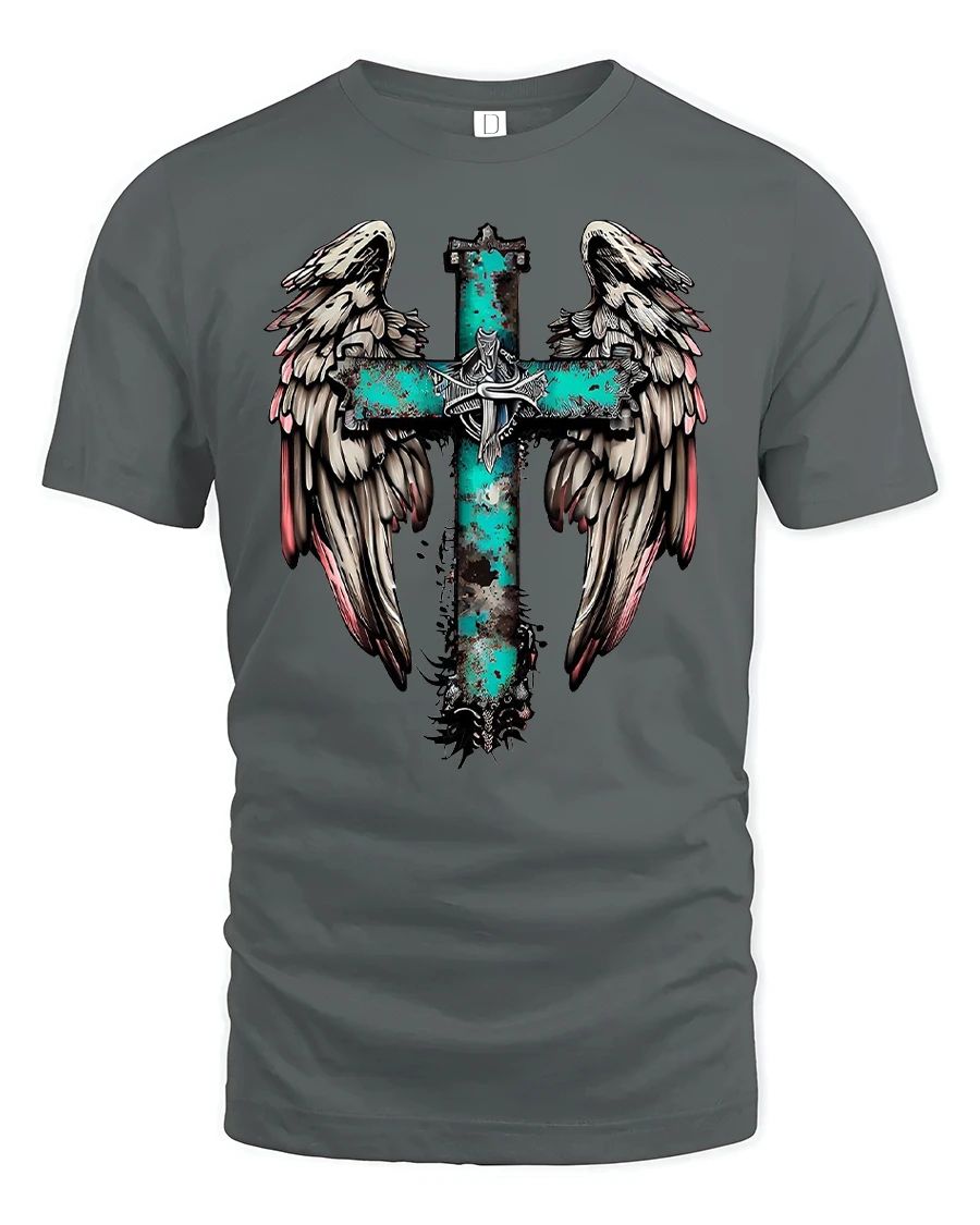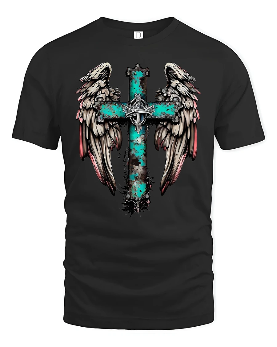 The Angel Cross Wings T-Shirt blends spirituality with bold gothic design, making it a standout piece for anyone who wants to showcase their faith and style. Featuring a distressed turquoise cross adorned with detailed angel wings, this graphic tee is both powerful and artistic, symbolizing strength, protection, and hope.