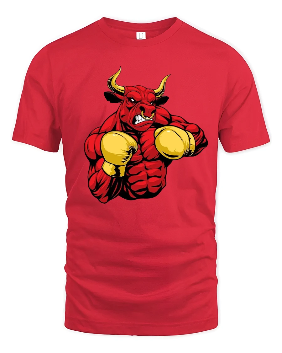 The muscular red bull wearing boxing gloves creates a bold visual that represents power determination and fearless energy.