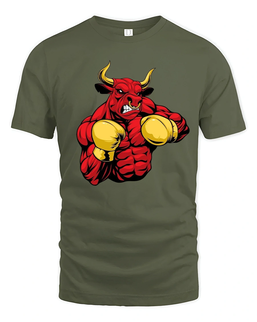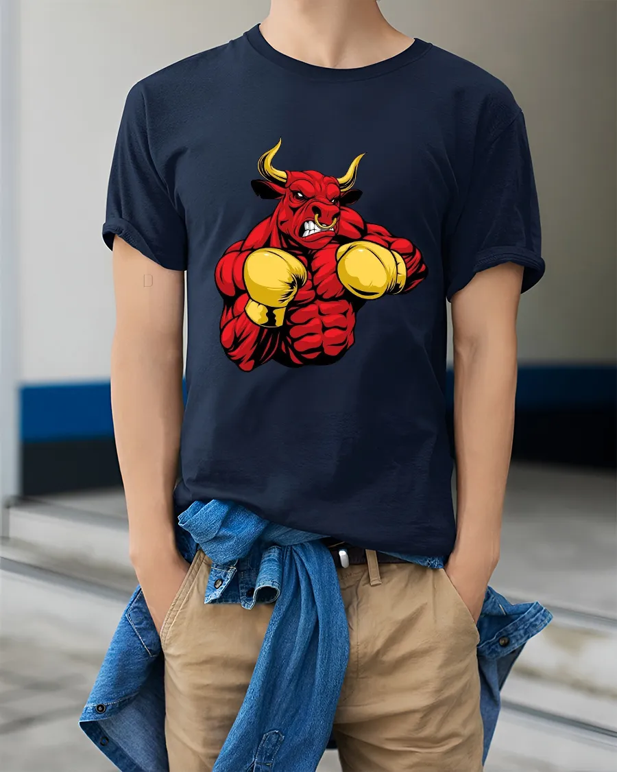 Angry Boxing Bull Tee With Powerful Muscle Cartoon Artwork delivers an explosive design full of strength attitude and humor.