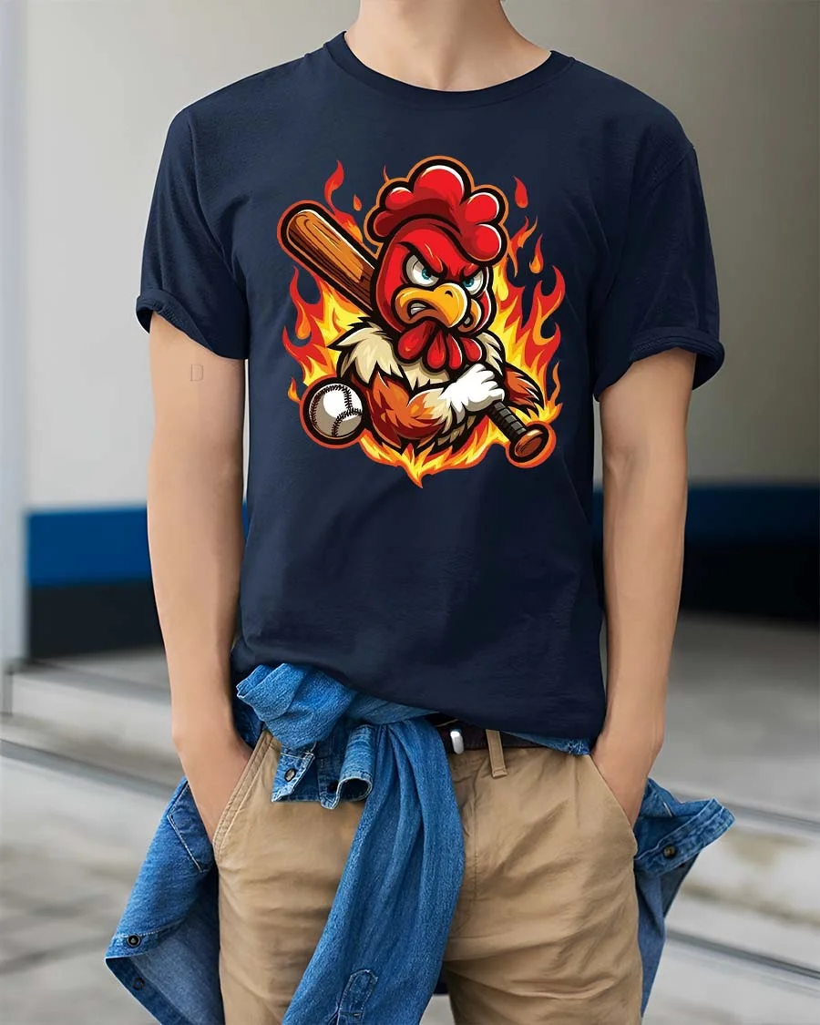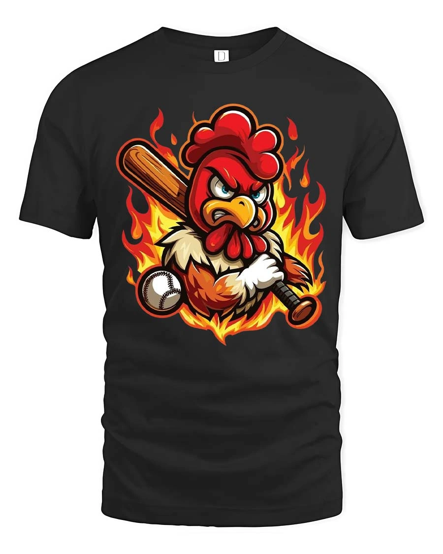 The fierce chicken batter adds a playful twist to traditional sports graphics, making the shirt entertaining while still capturing the excitement and attitude of competitive baseball moments.