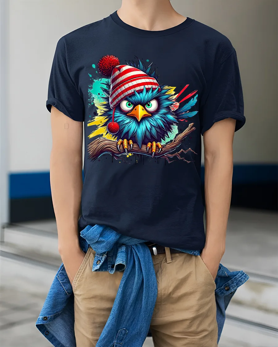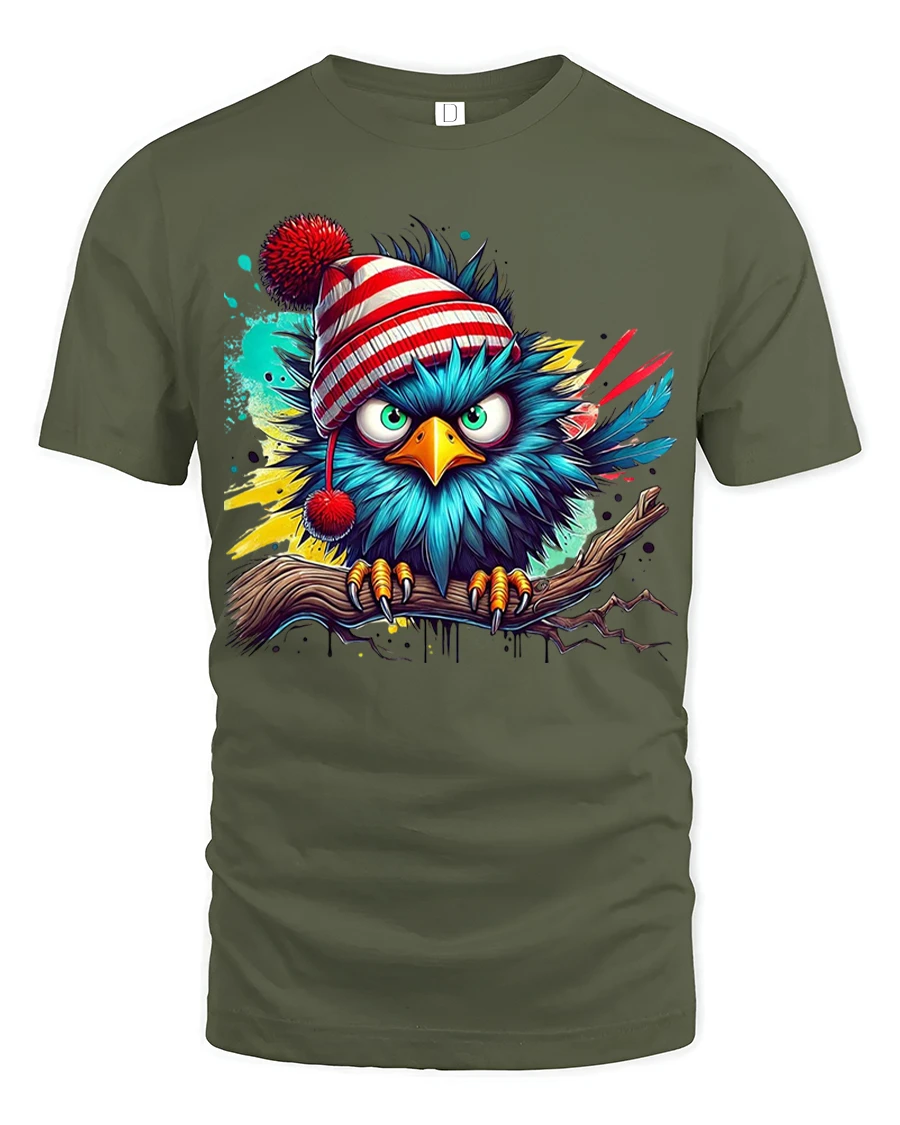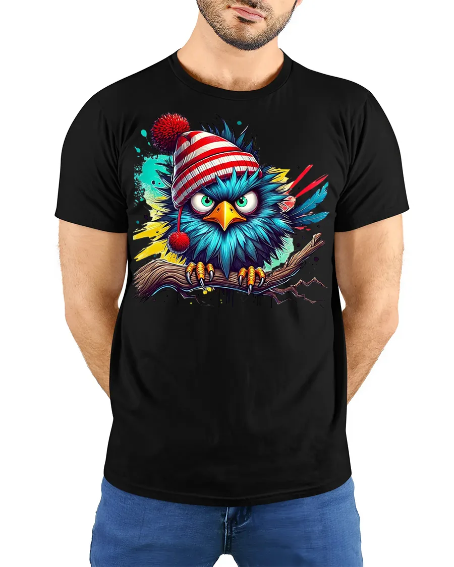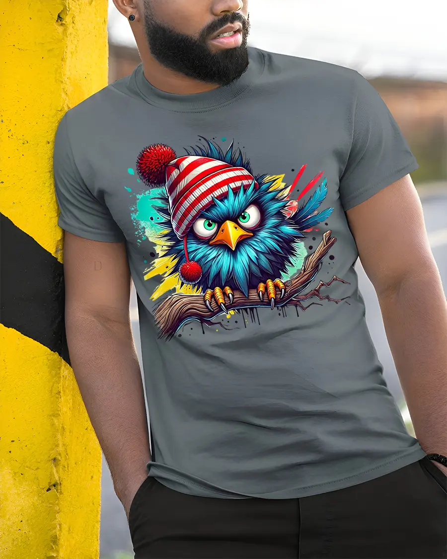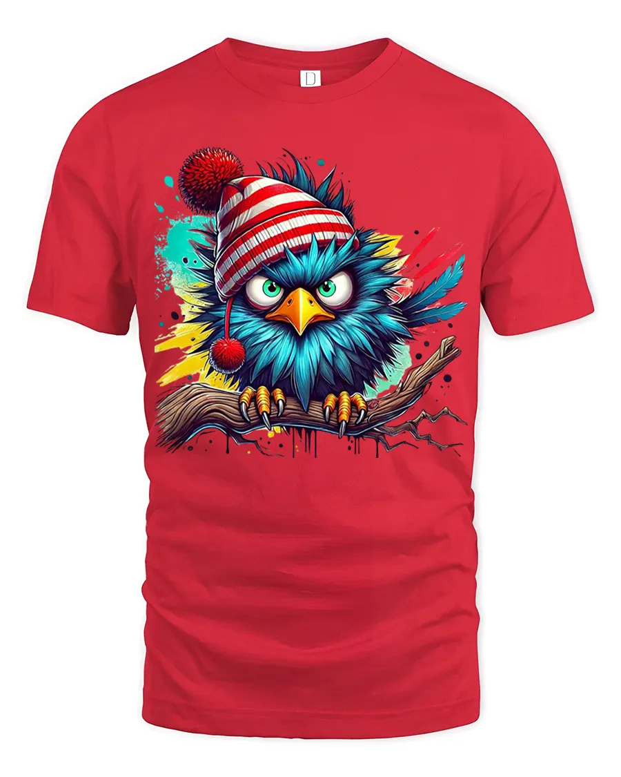 This Angry Winter Bird in Beanie Color Splash Funny Graphic Tee delivers bold personality, vibrant color, and hilarious attitude in one striking design. Featuring a bright blue bird perched on a branch, wearing a red-striped winter beanie with an unmistakably grumpy expression, this artwork blends humor with eye-catching street-art style. The dynamic paint-splash background adds energy and flair, making this tee a standout choice for anyone who loves expressive and funny animal designs.