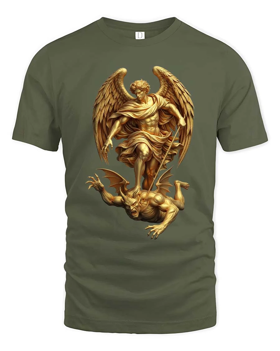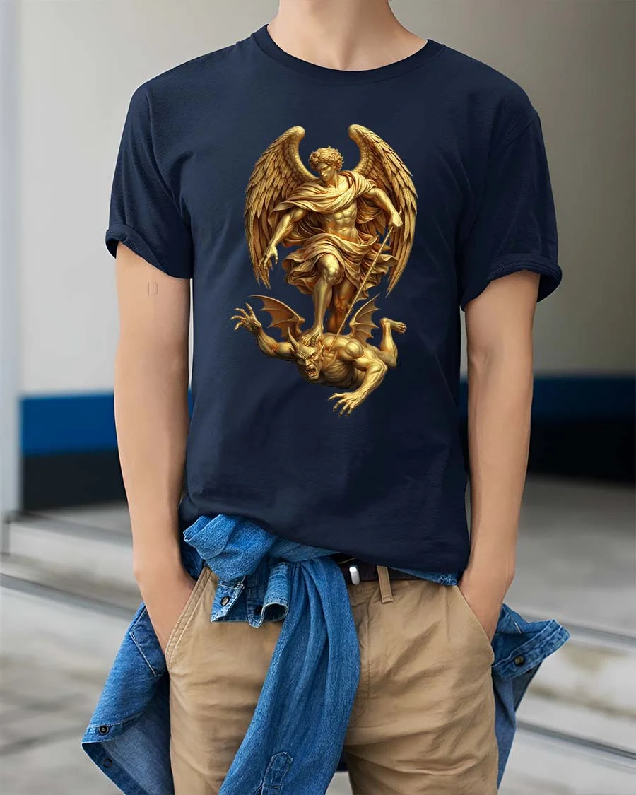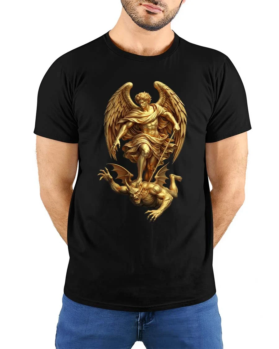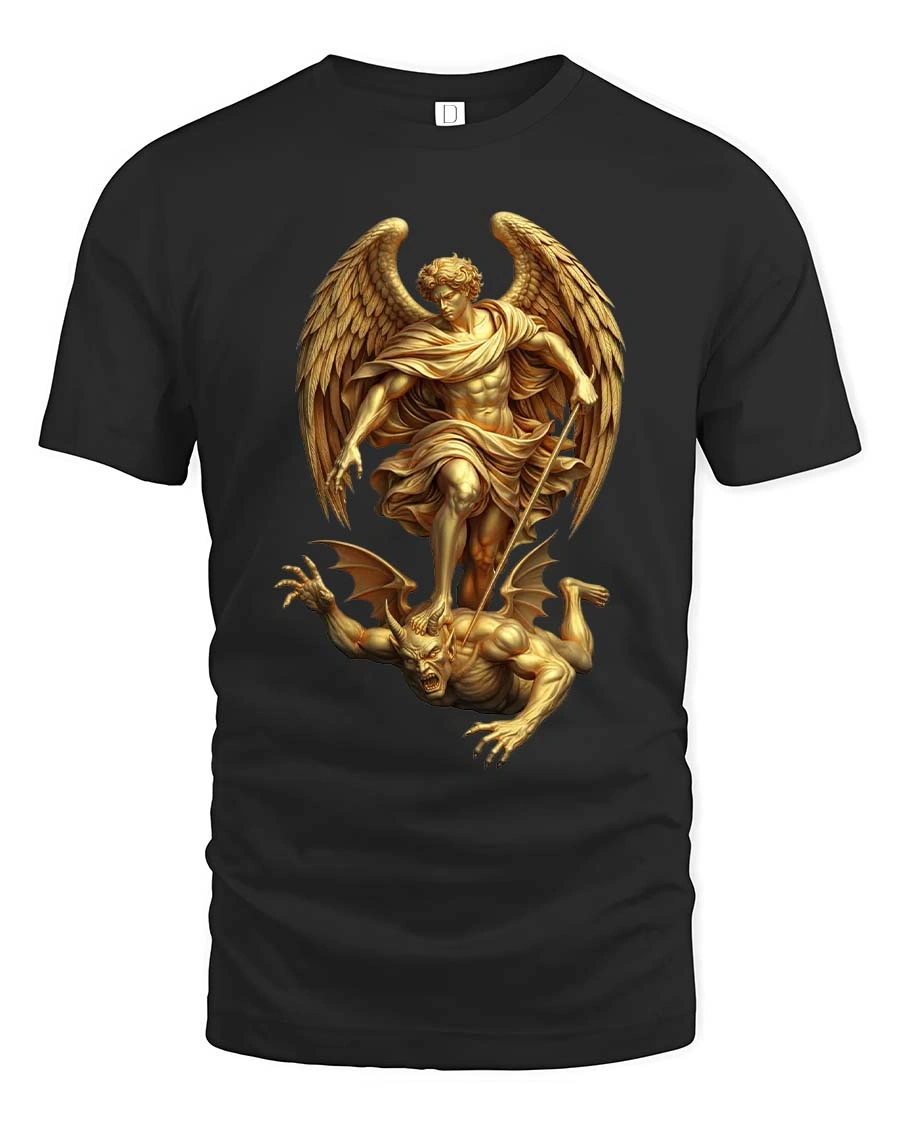 This Archangel Warrior Defeating Demon Mythology Graphic T Shirt features a powerful and dramatic illustration inspired by classic mythological and celestial artwork.