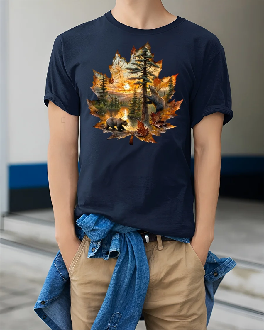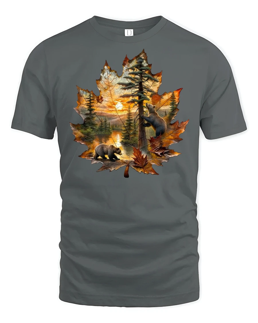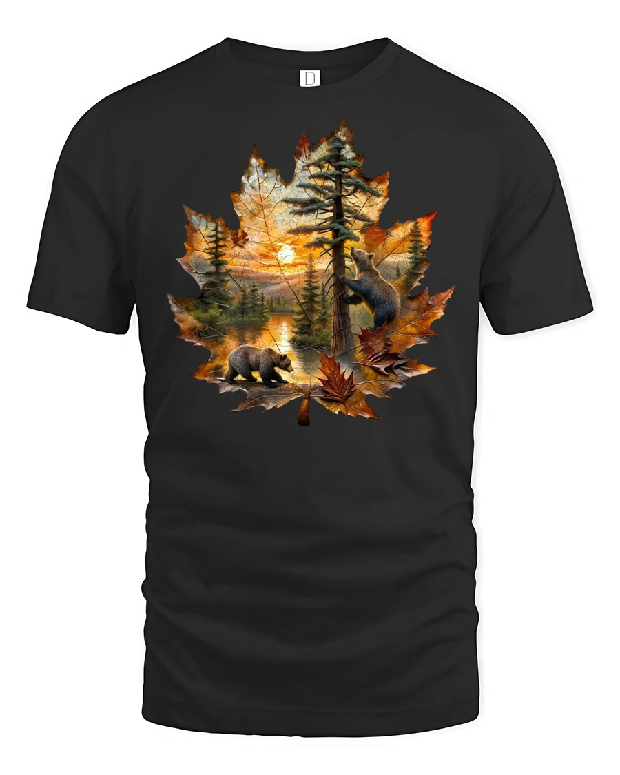 Autumn Forest Bears in Maple Leaf Nature Graphic Tee is a stunning design that combines wildlife, rustic charm, and the beauty of fall. Featuring a scenic maple leaf filled with a forest sunset, playful bears, and autumn foliage, this t-shirt is perfect for nature lovers, outdoor adventurers, and anyone who enjoys the cozy spirit of the season.