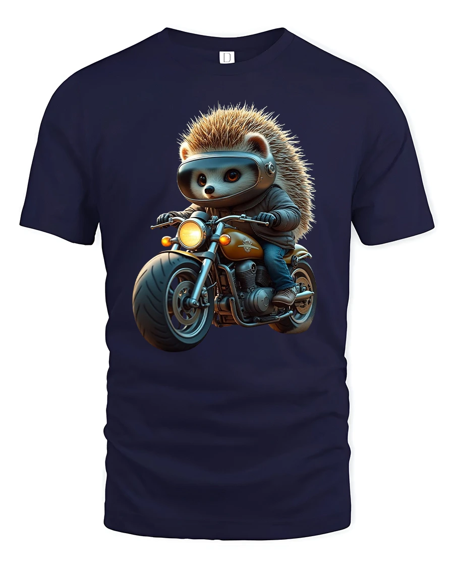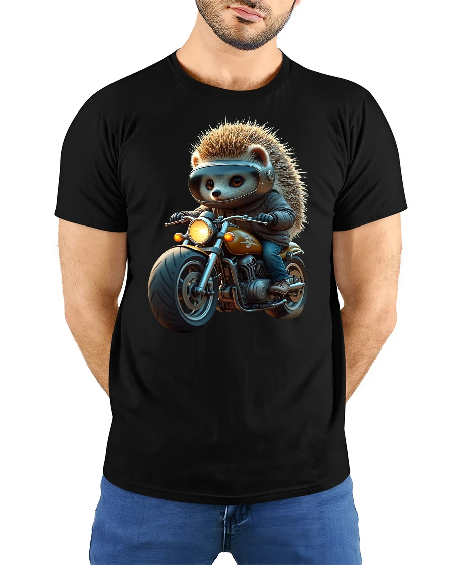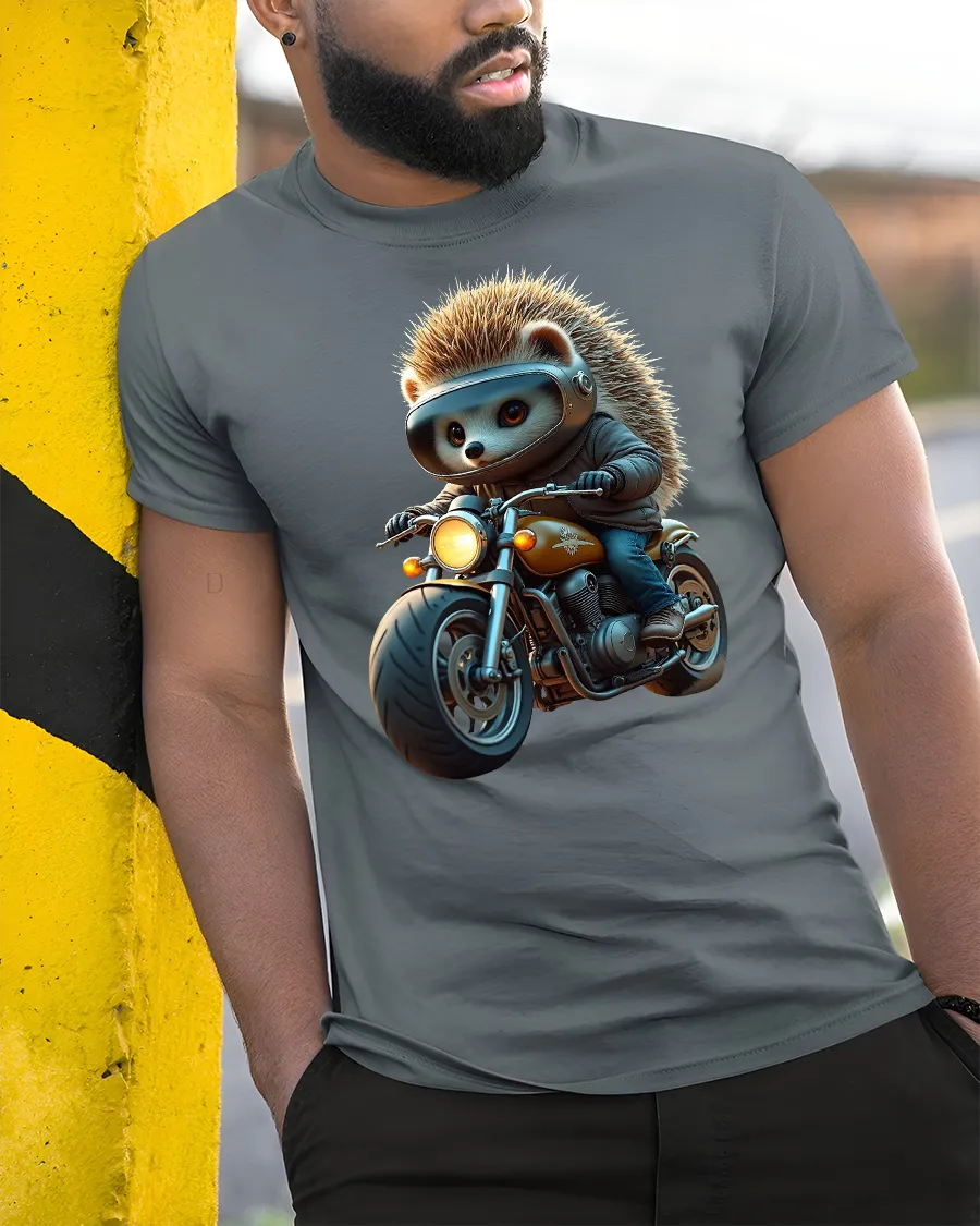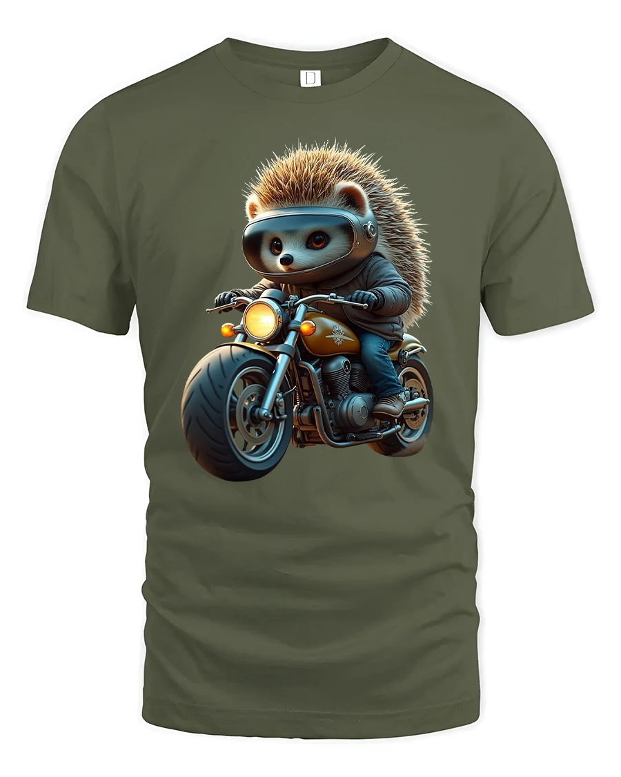 Featuring a fearless hedgehog wearing a helmet and riding a powerful motorbike, this tee brings humor, adventure, and creativity to your wardrobe.