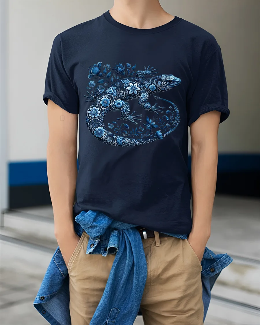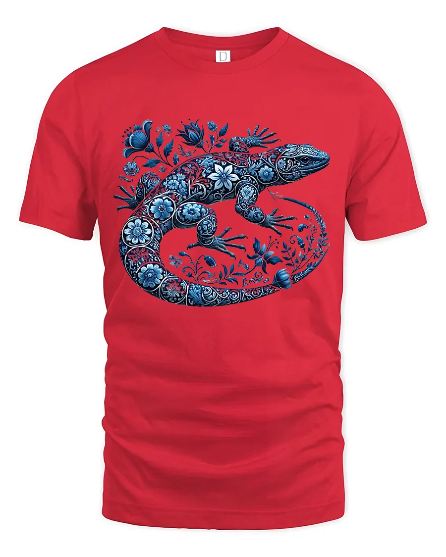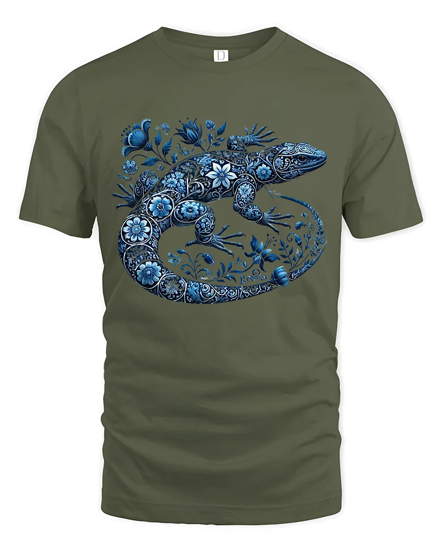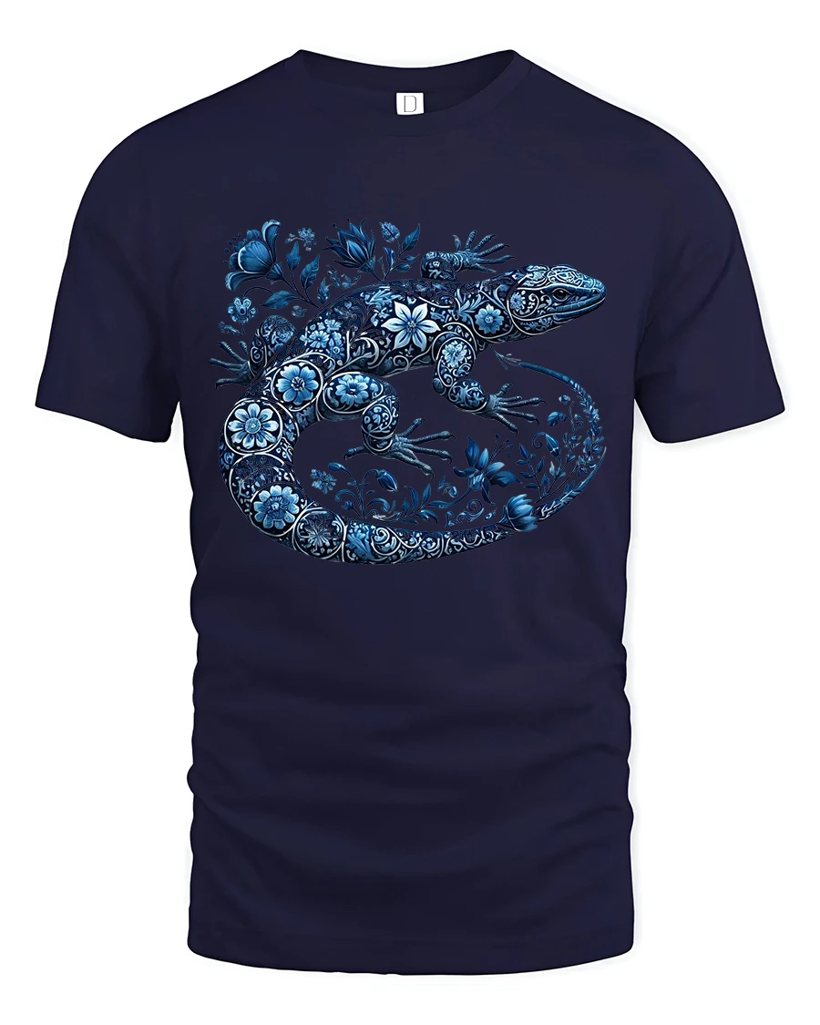 Blue Floral Lizard Art Nature Inspired Graphic Tee Shirt blends wildlife beauty with elegant botanical design to create a truly eye catching statement piece. Featuring a detailed blue lizard decorated with intricate floral patterns this artwork delivers a harmonious balance of nature art and modern illustration. The rich blue tones and ornamental details give the design a refined artistic feel while still remaining bold and expressive.