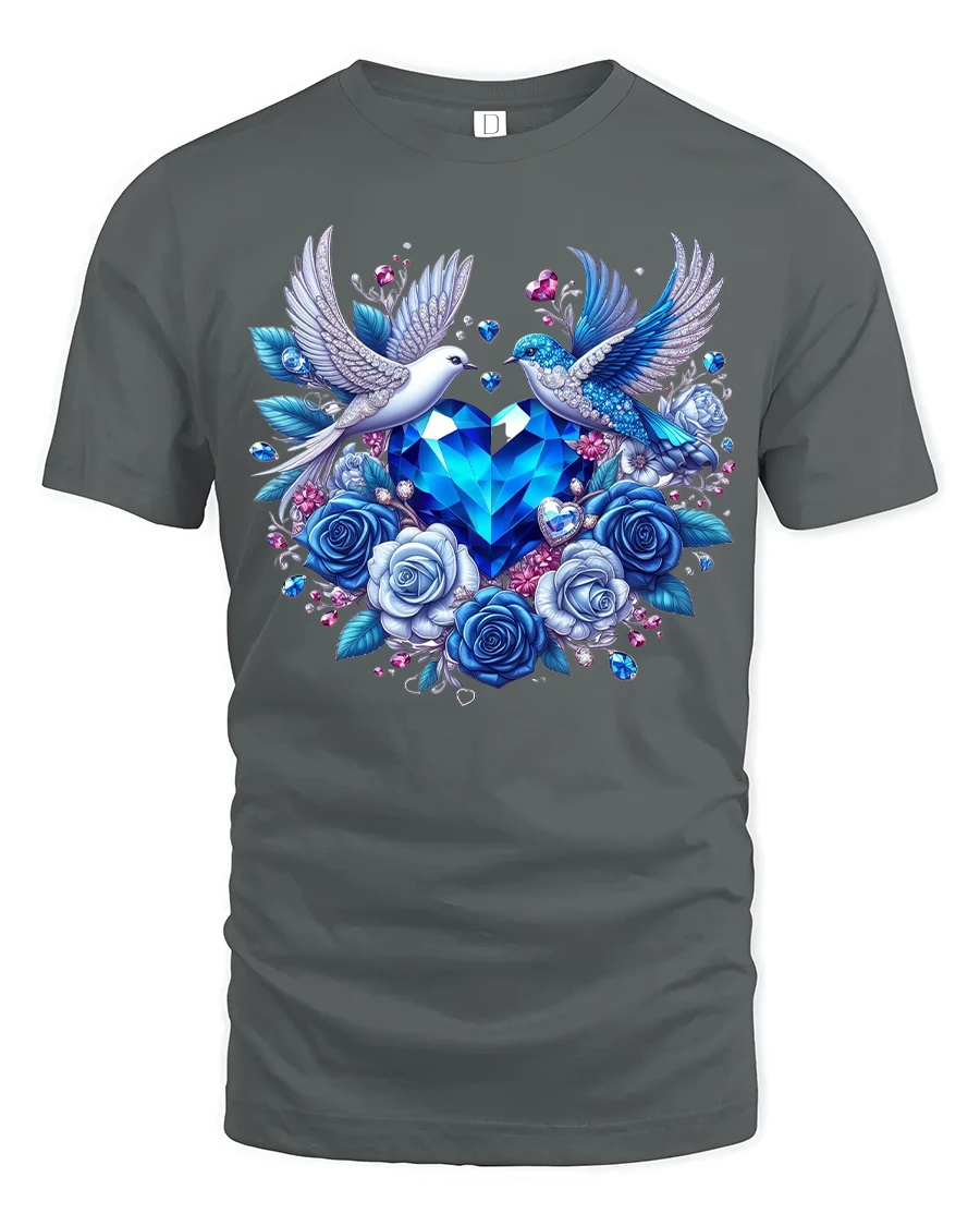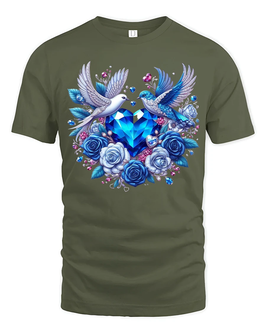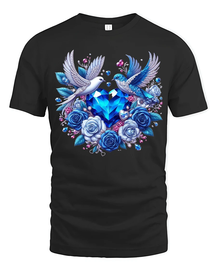 Blue Gem Heart Doves Tee with Elegant Floral Romantic Art brings a stunning blend of beauty, symbolism and sparkle into one captivating design. The artwork features two graceful doves surrounding a radiant blue gemstone heart, framed by detailed roses and shimmering floral accents. The brilliant shades of blue, the sparkling highlights and the delicate touches of pink create a unique and enchanting visual that stands out with elegance and charm.