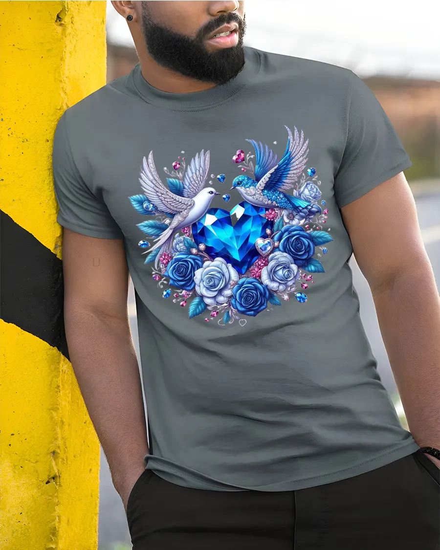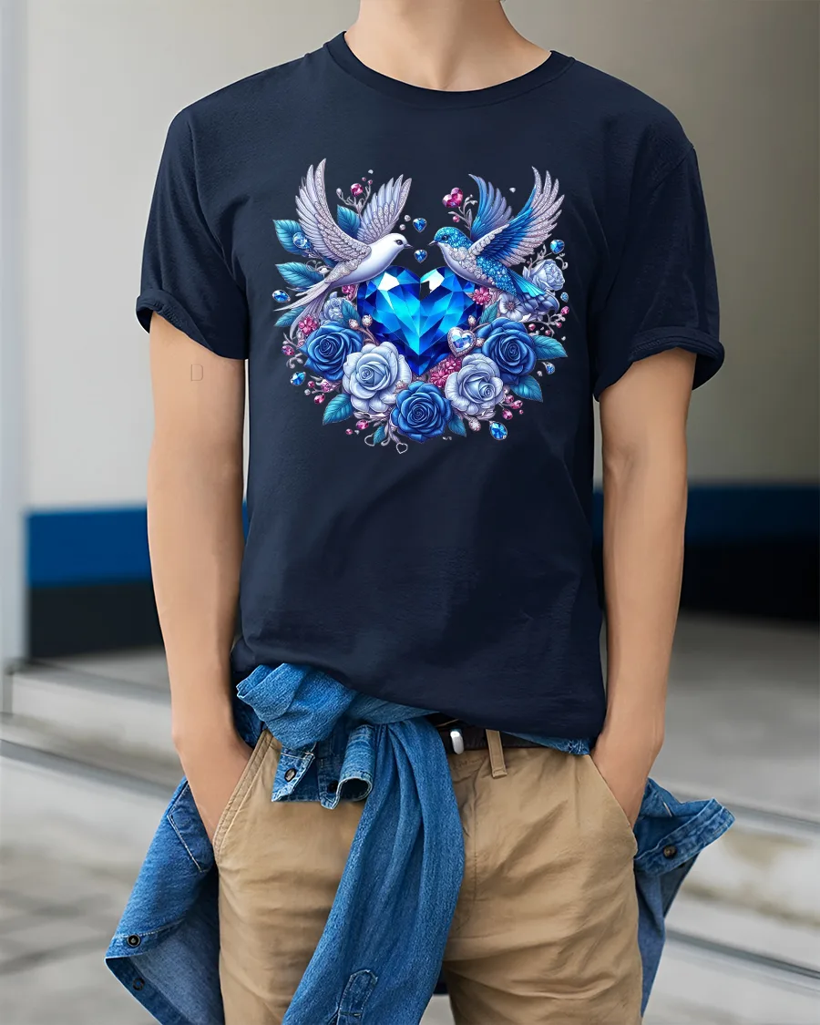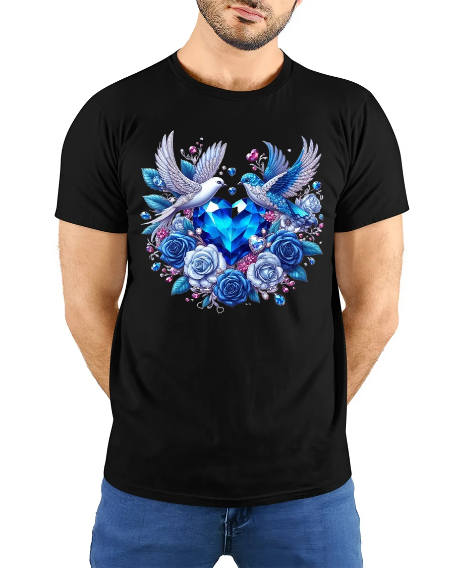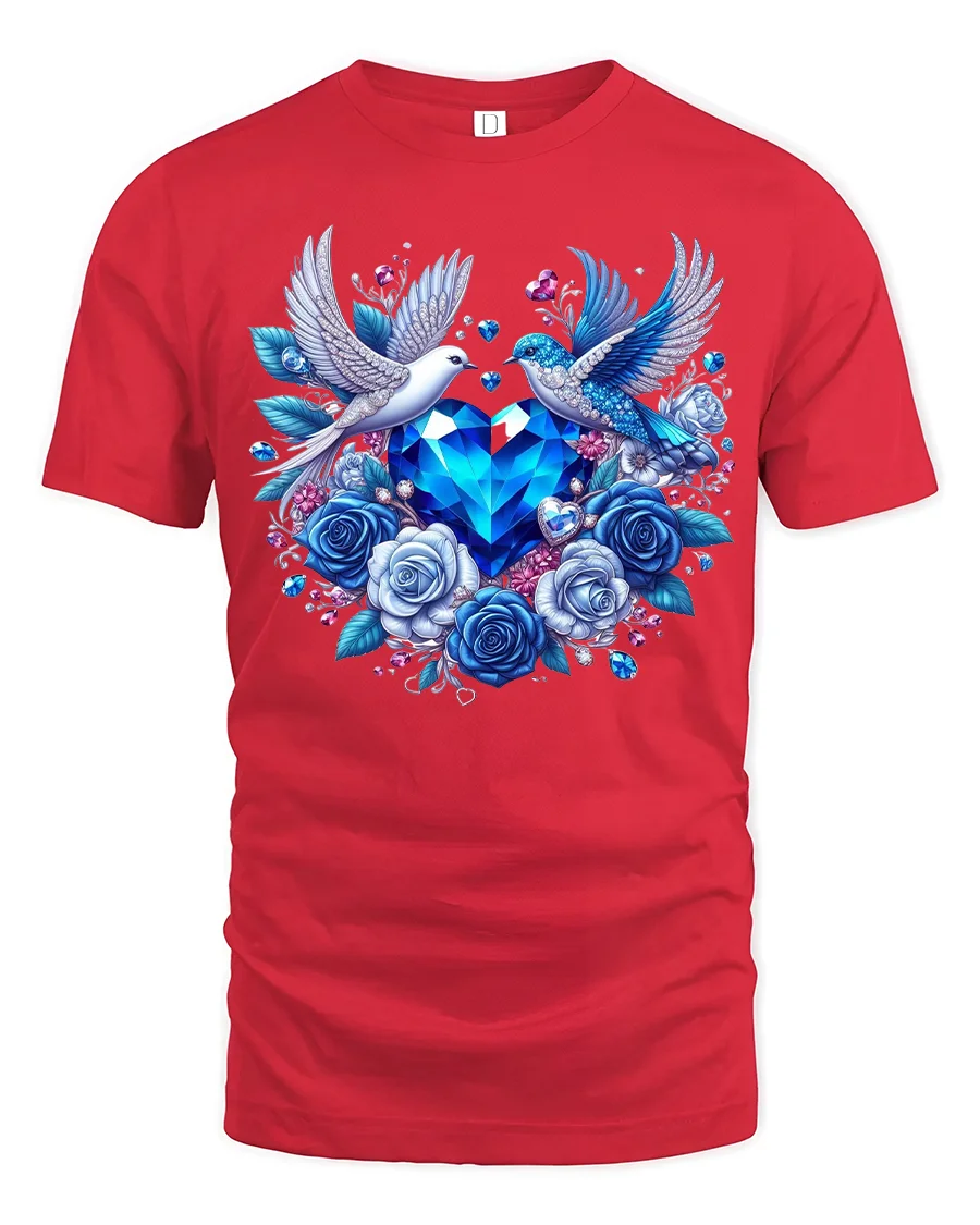 Blue Gem Heart Doves Tee with Elegant Floral Romantic Art brings a stunning blend of beauty, symbolism and sparkle into one captivating design. The artwork features two graceful doves surrounding a radiant blue gemstone heart, framed by detailed roses and shimmering floral accents. The brilliant shades of blue, the sparkling highlights and the delicate touches of pink create a unique and enchanting visual that stands out with elegance and charm.