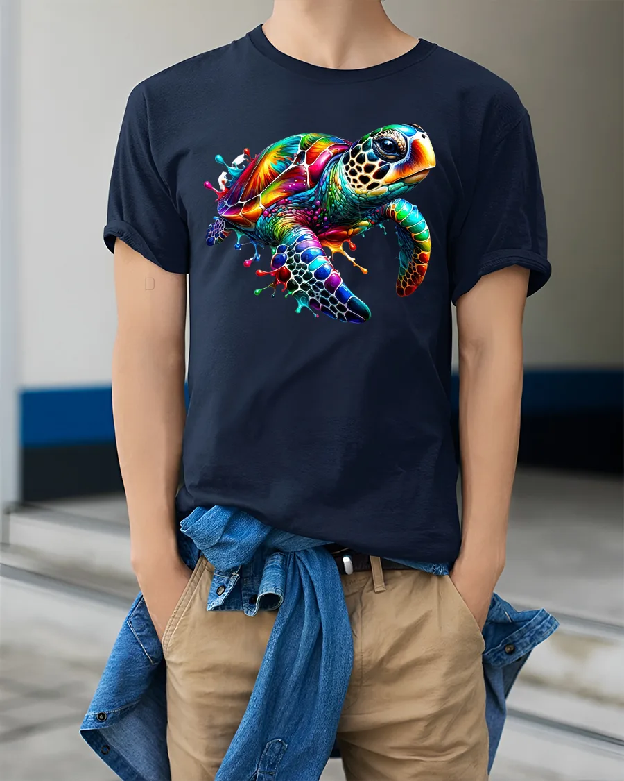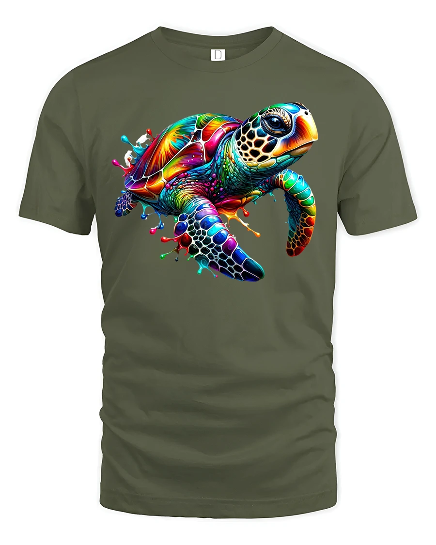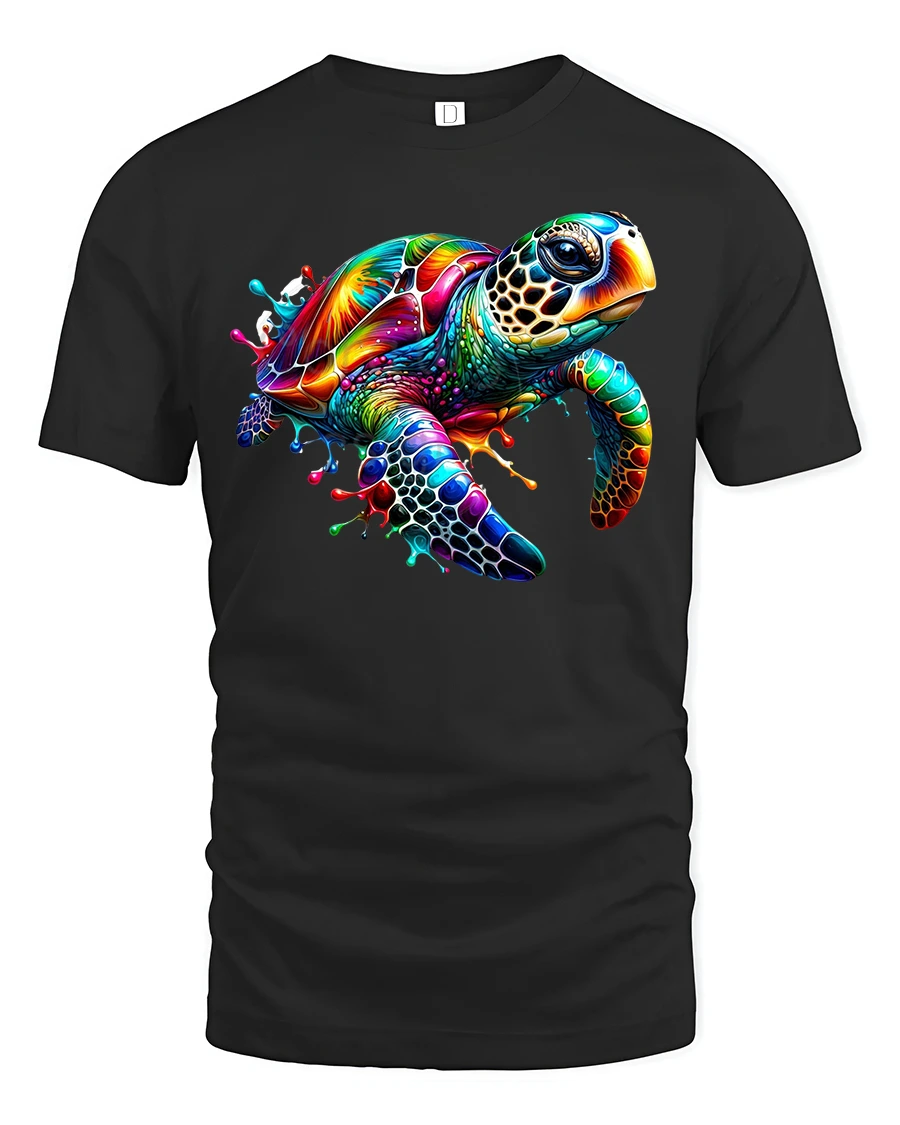This vibrant design features a sea turtle swimming through a burst of rainbow colors, blending nature and creativity perfectly.