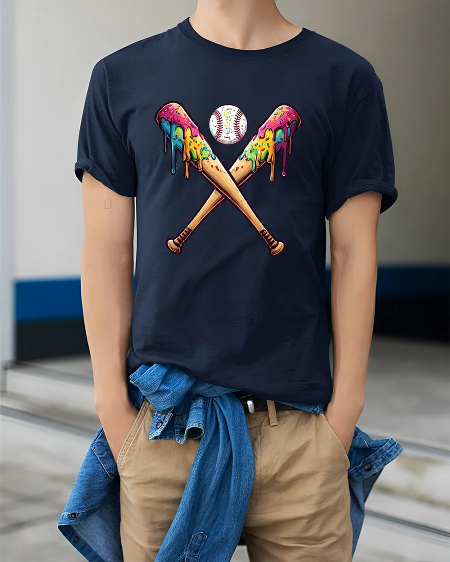 The artwork features crossed baseball bats with vibrant dripping paint and a classic baseball at the center creating a playful eye catching look.