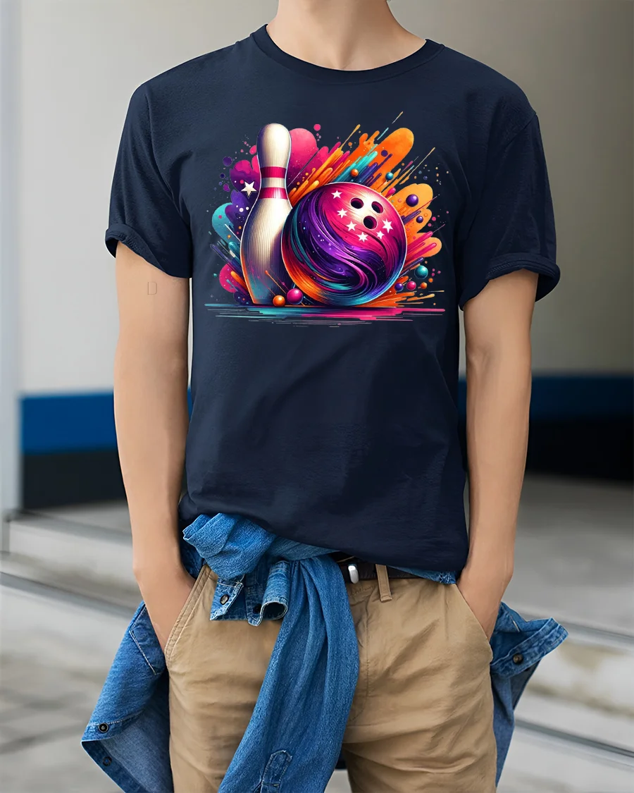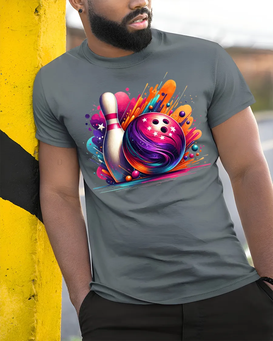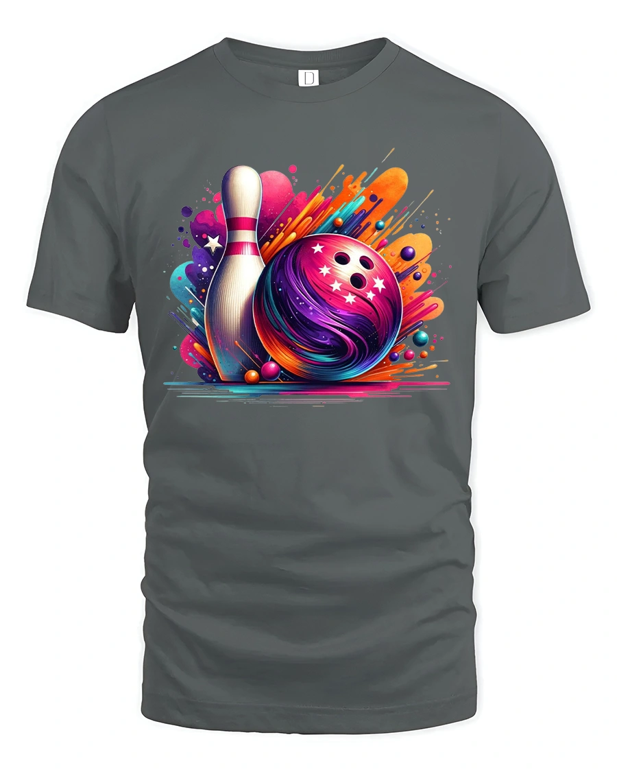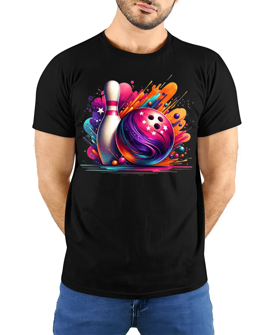 Colorful Bowling Ball Graphic Tee With Vibrant Splash Art Style brings motion excitement and creativity into a bold sports inspired design.