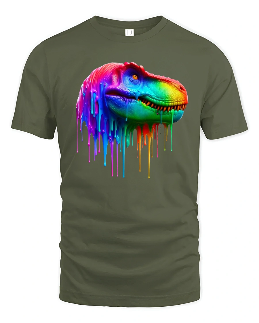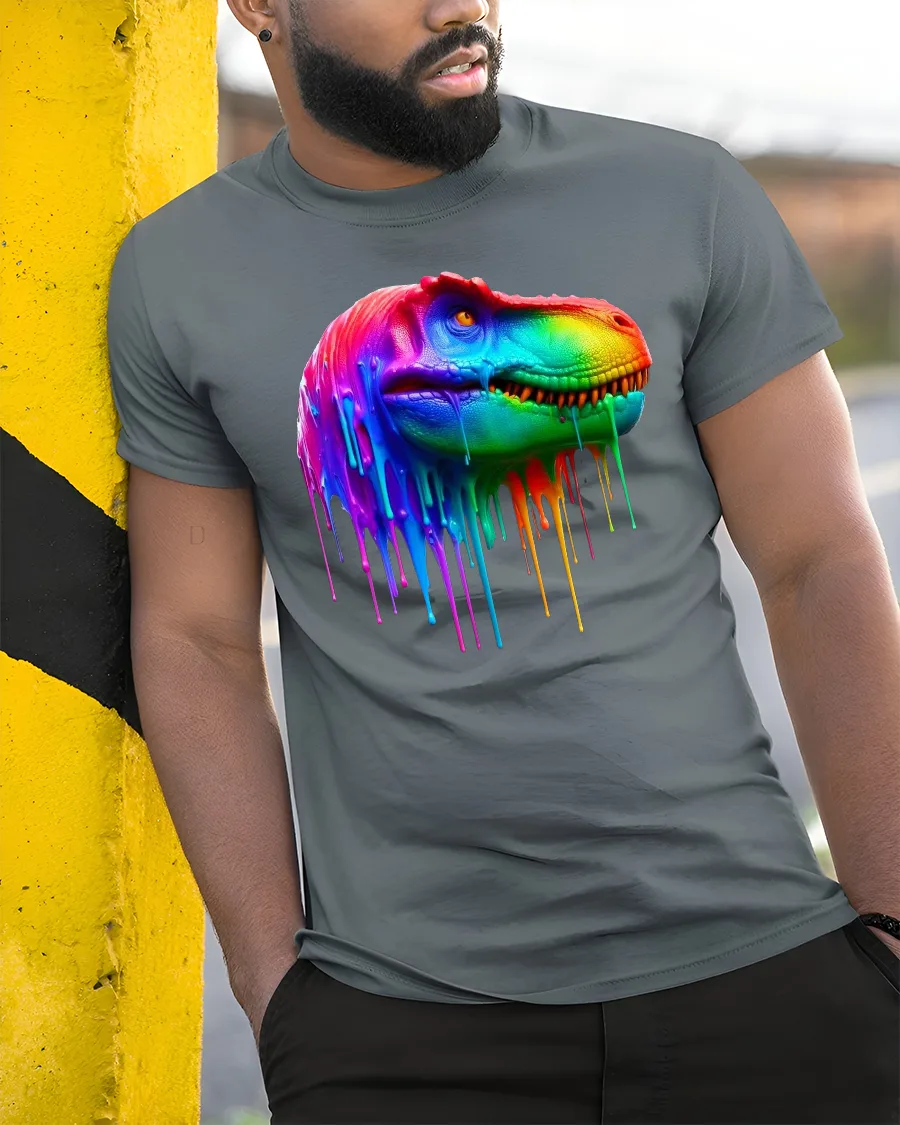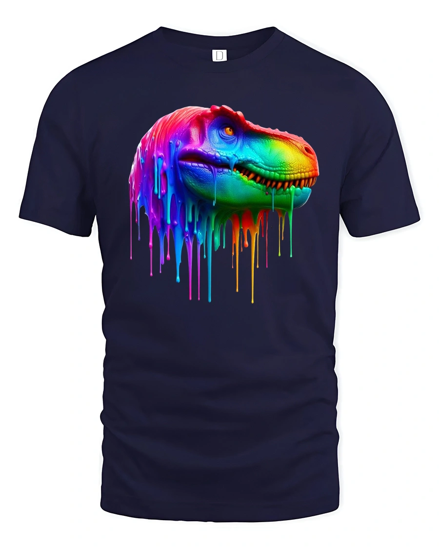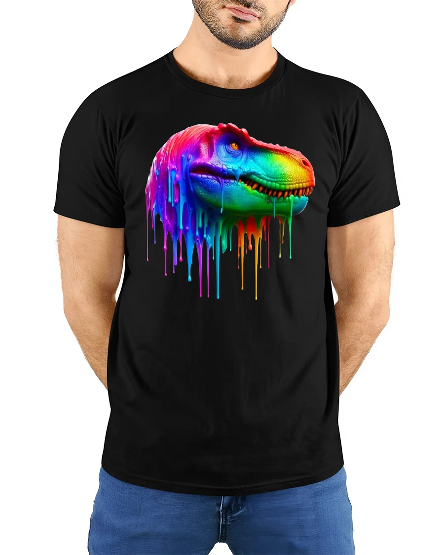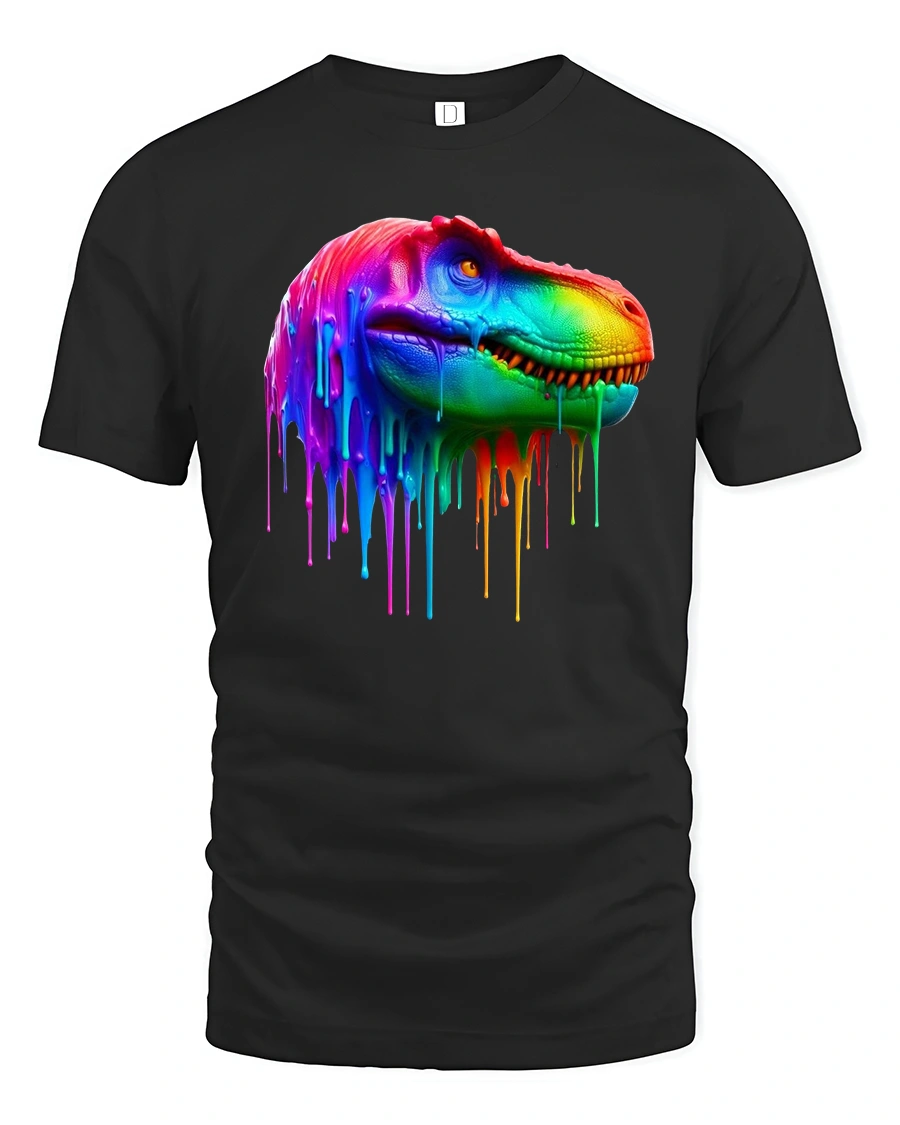 Colorful Dinosaur Head Dripping Paint Graphic T-Shirt is a bold and eye-catching design that blends prehistoric power with modern streetwear style. Featuring a T-Rex head illustrated in rainbow tones with dripping paint effects, this tee stands out as wearable art. The vibrant colors and unique design make it perfect for those who love dinosaurs, bold fashion statements, or psychedelic-inspired artwork.