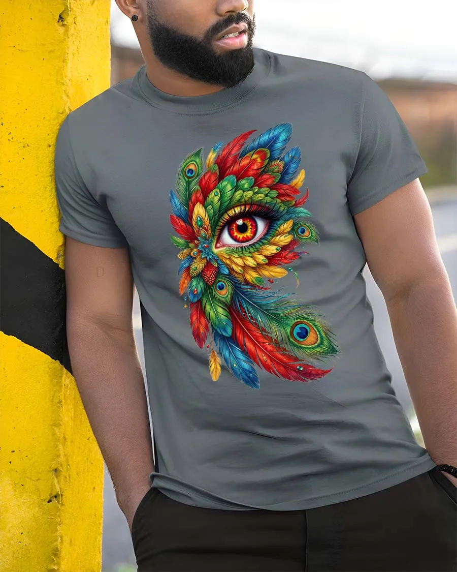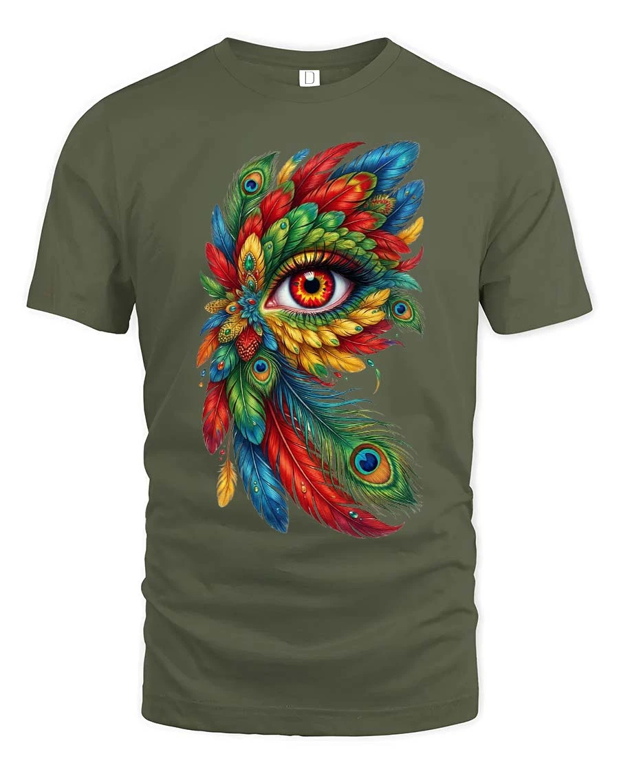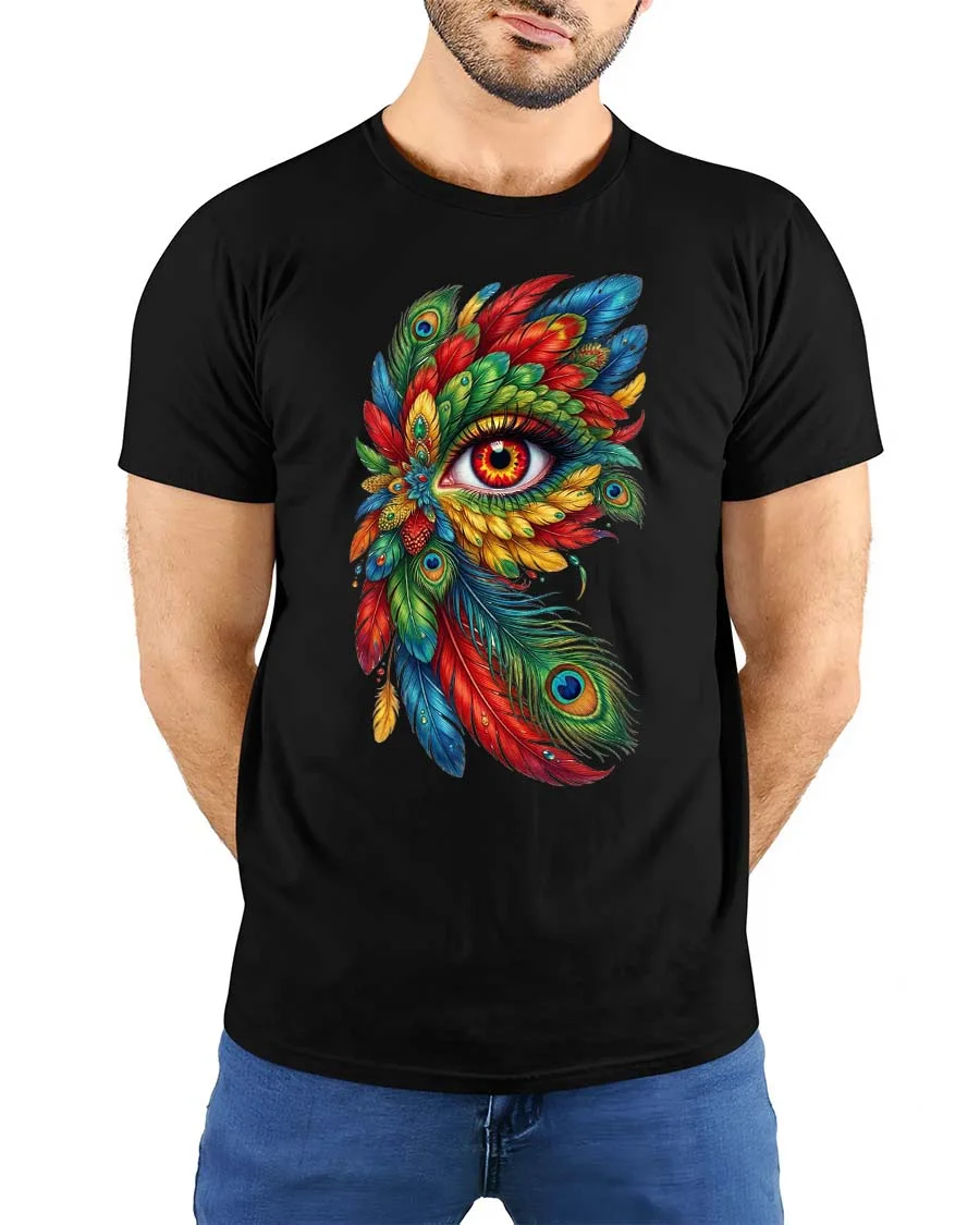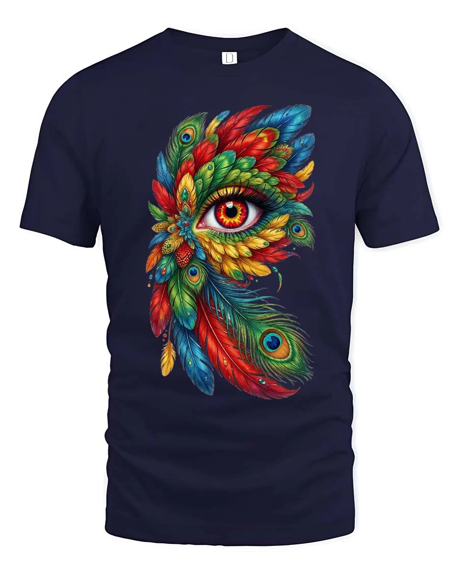 Colorful Feather Eye T Shirt Artistic Boho Fantasy Design showcases a mesmerizing blend of vibrant feathers and symbolic eye imagery in a bold artistic style.