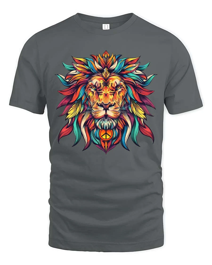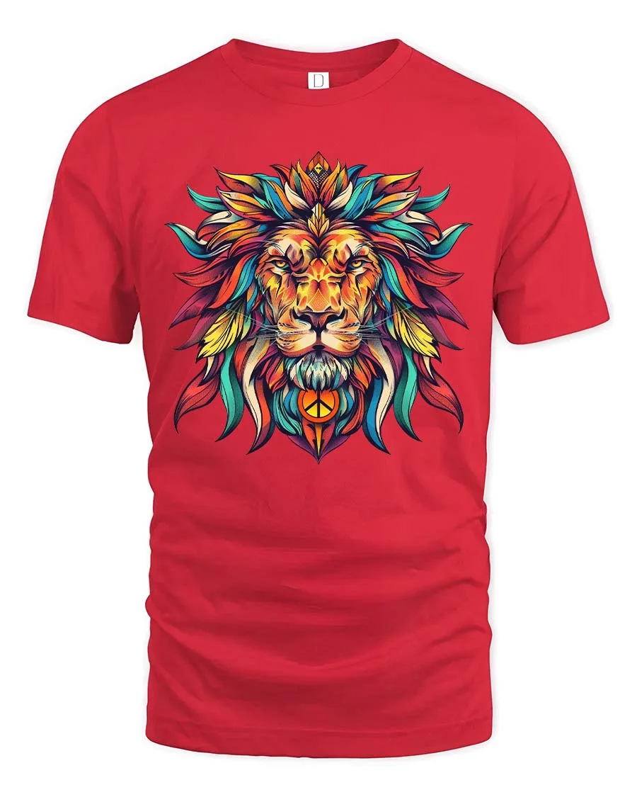Colorful Lion Head Peace Symbol T Shirt Vibrant Artistic Graphic Tee showcases a powerful blend of strength and creativity through bold visual expression.