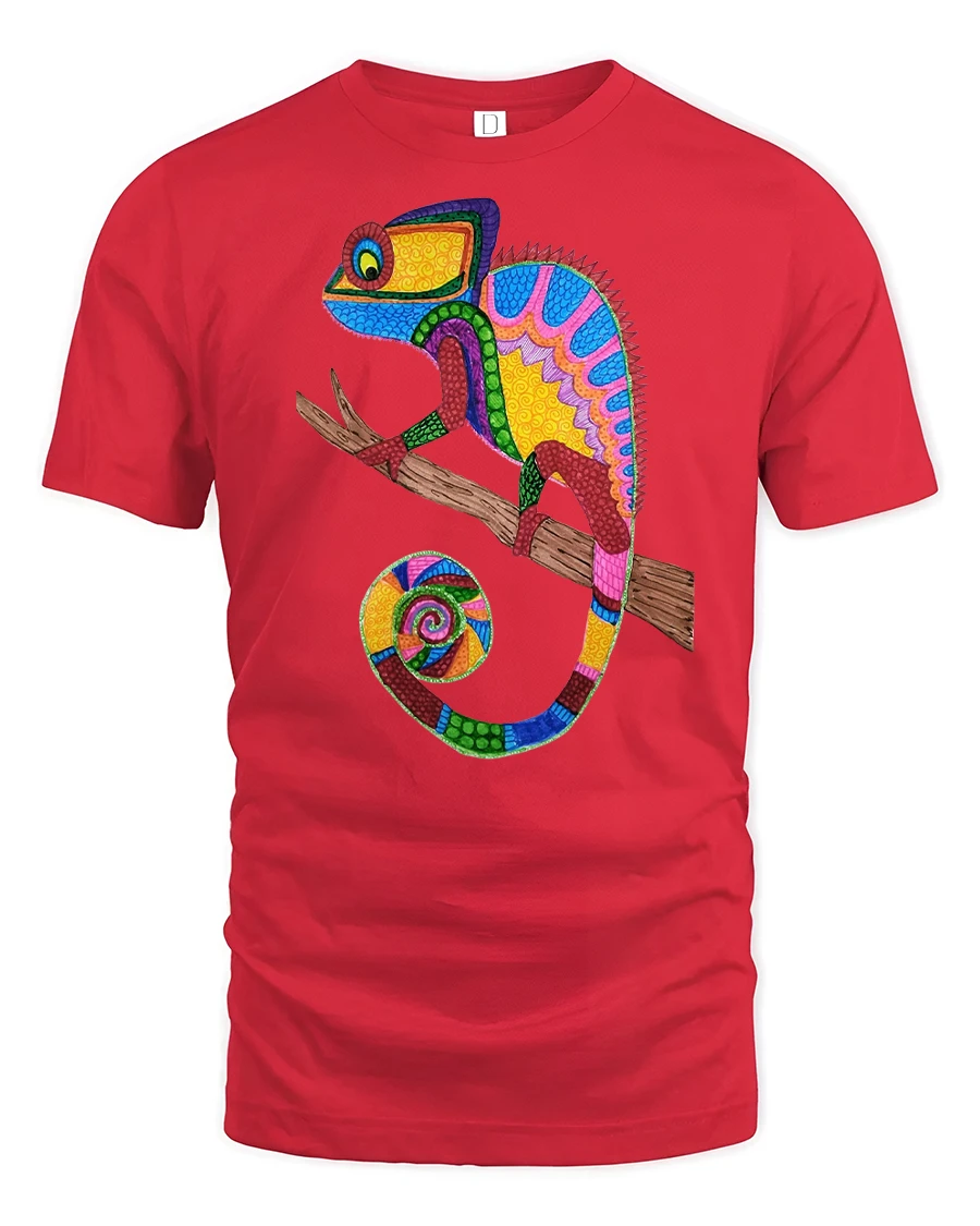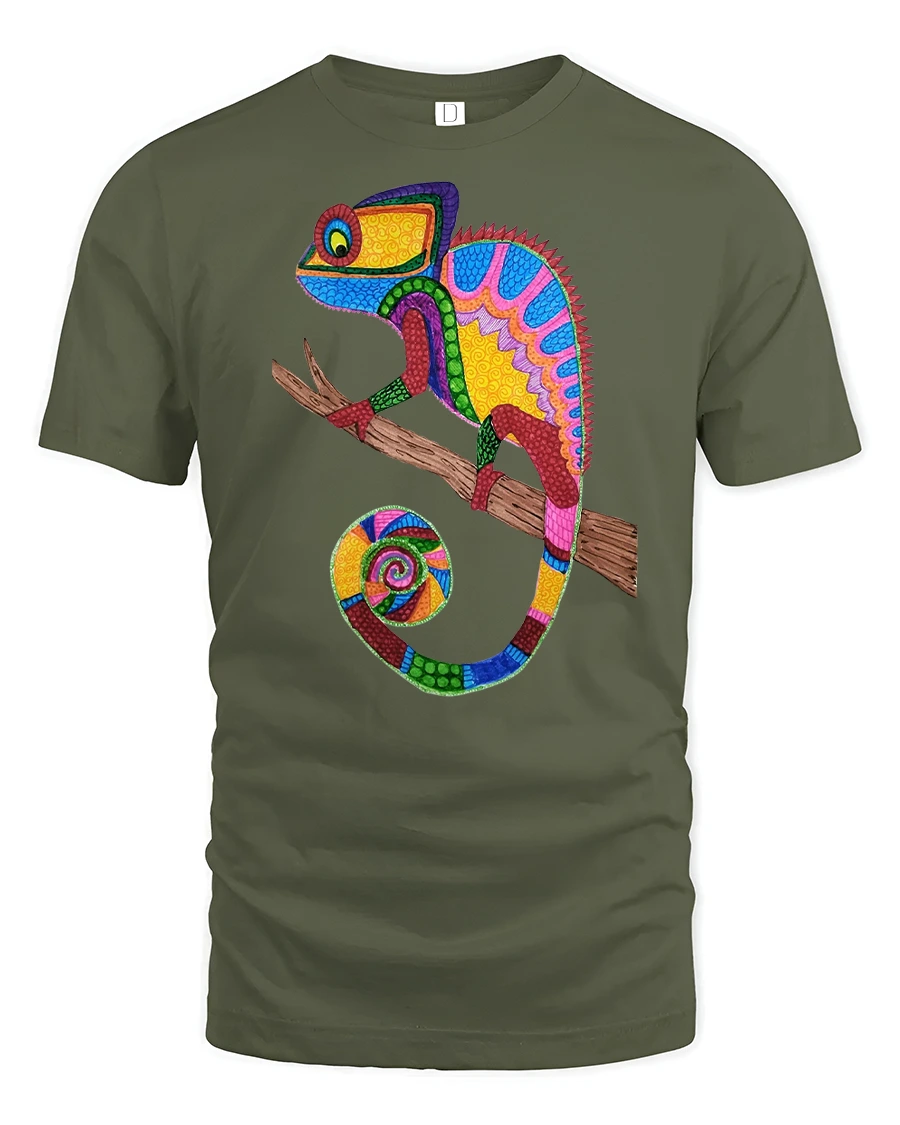 The Colorful Mosaic Chameleon Art Illustration Graphic Tee Shirt showcases a bold and artistic interpretation of a chameleon in vibrant color patterns.