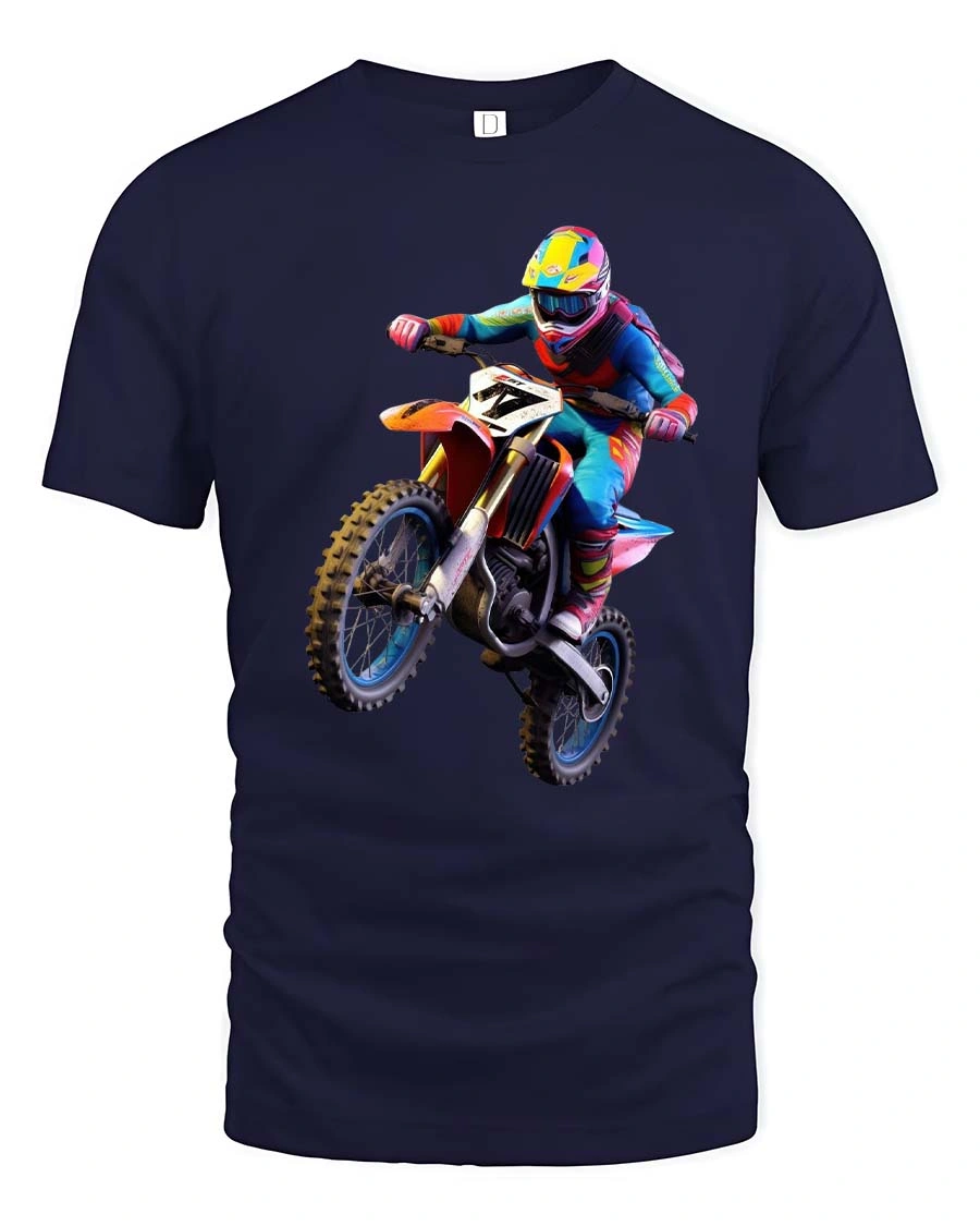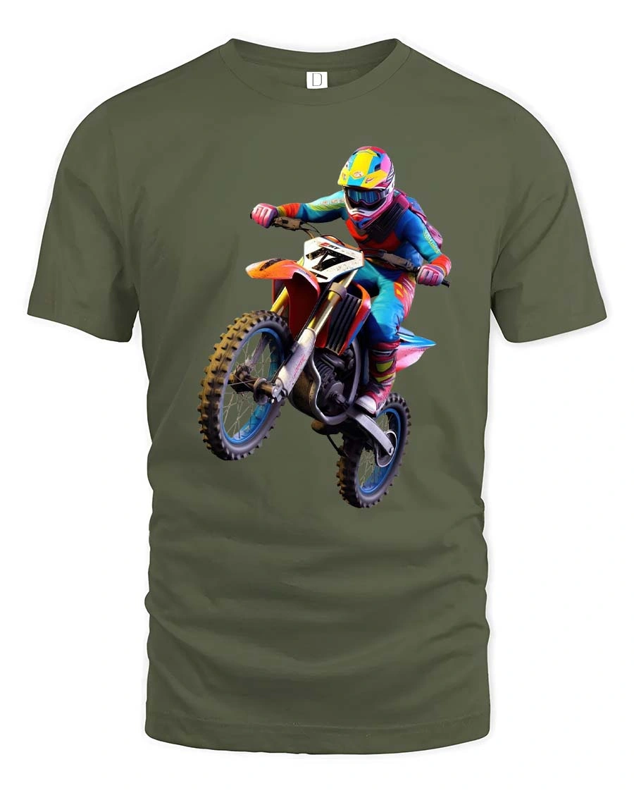 Colorful Motocross Rider Dirt Bike Jump Action Graphic Tee captures the excitement and adrenaline of off-road motorcycle racing with a dynamic action design. The artwork features a motocross rider launching into the air on a dirt bike, frozen in a powerful mid-jump moment that showcases speed, skill, and fearless riding energy.