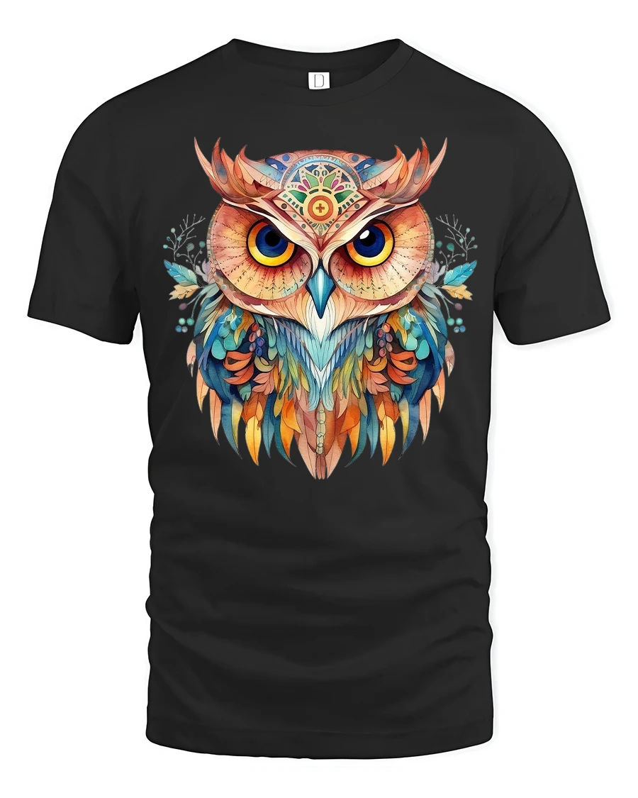 Colorful Owl Graphic T Shirt represents wisdom creativity and appreciation for expressive art.