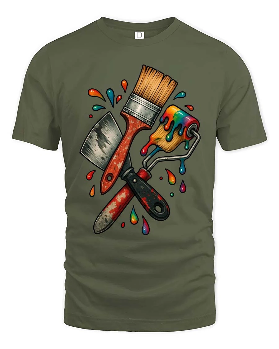 This Colorful Painter Tools Brush Roller Knife Graphic T Shirt features a creative illustration of classic painting tools including a brush, roller, and putty knife surrounded by bright paint splashes.