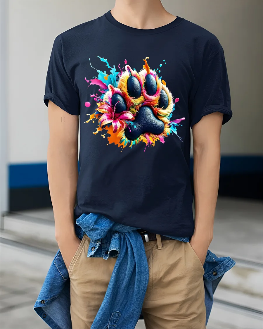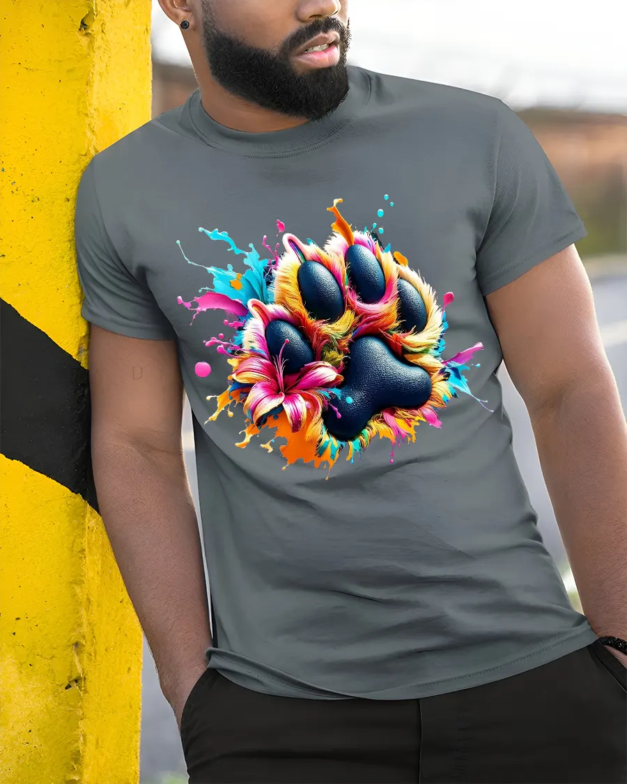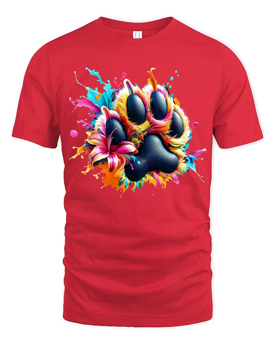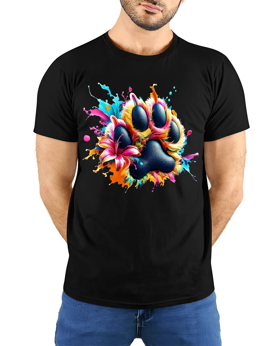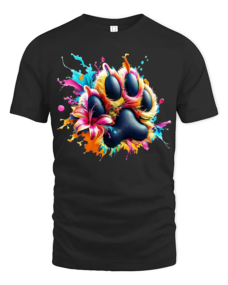 The Colorful Paw Print Art Tee Vibrant Paint Splash Animal Design is perfect for those who love pets art and colorful expression.