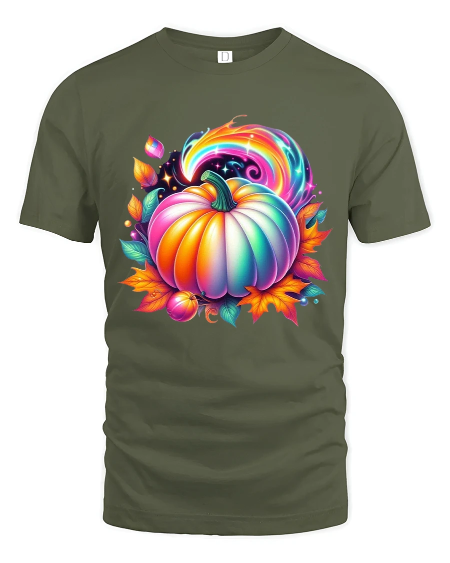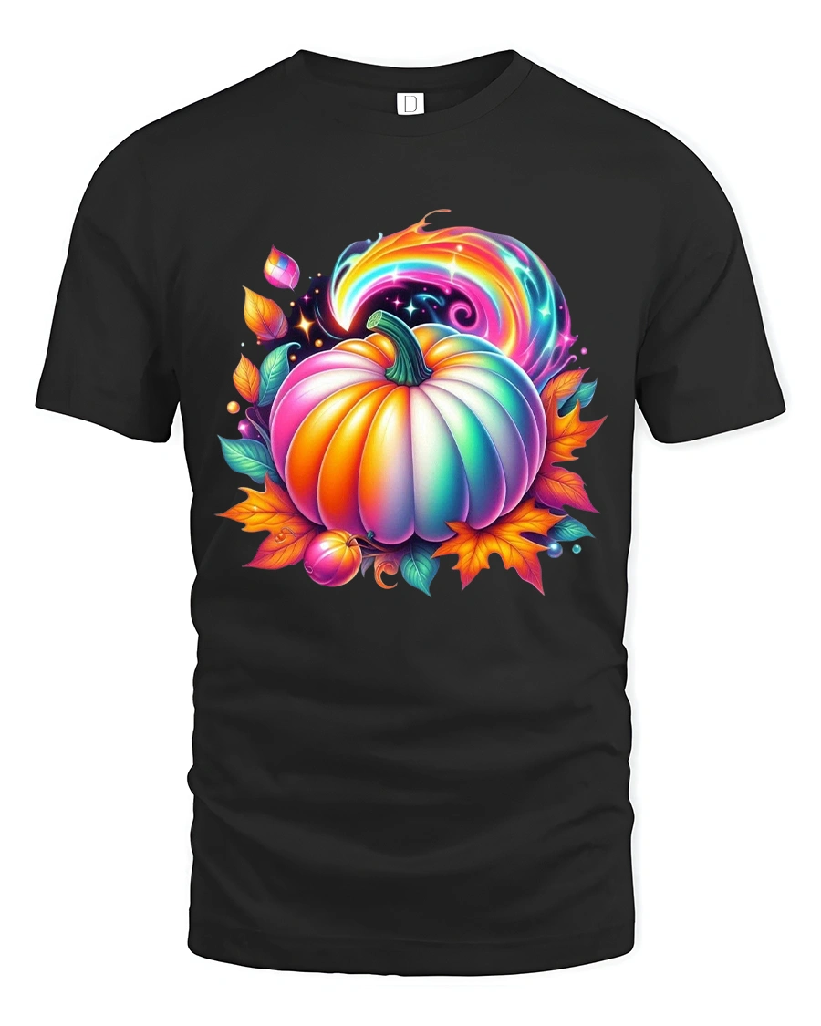 Colorful Pumpkin Magic Fall Leaves Graphic T-Shirt brings a burst of color and creativity to your fall wardrobe. Featuring a beautifully designed pumpkin glowing in rainbow hues, surrounded by golden autumn leaves and a swirl of magical energy, this tee is perfect for those who love bright and cheerful fall fashion.