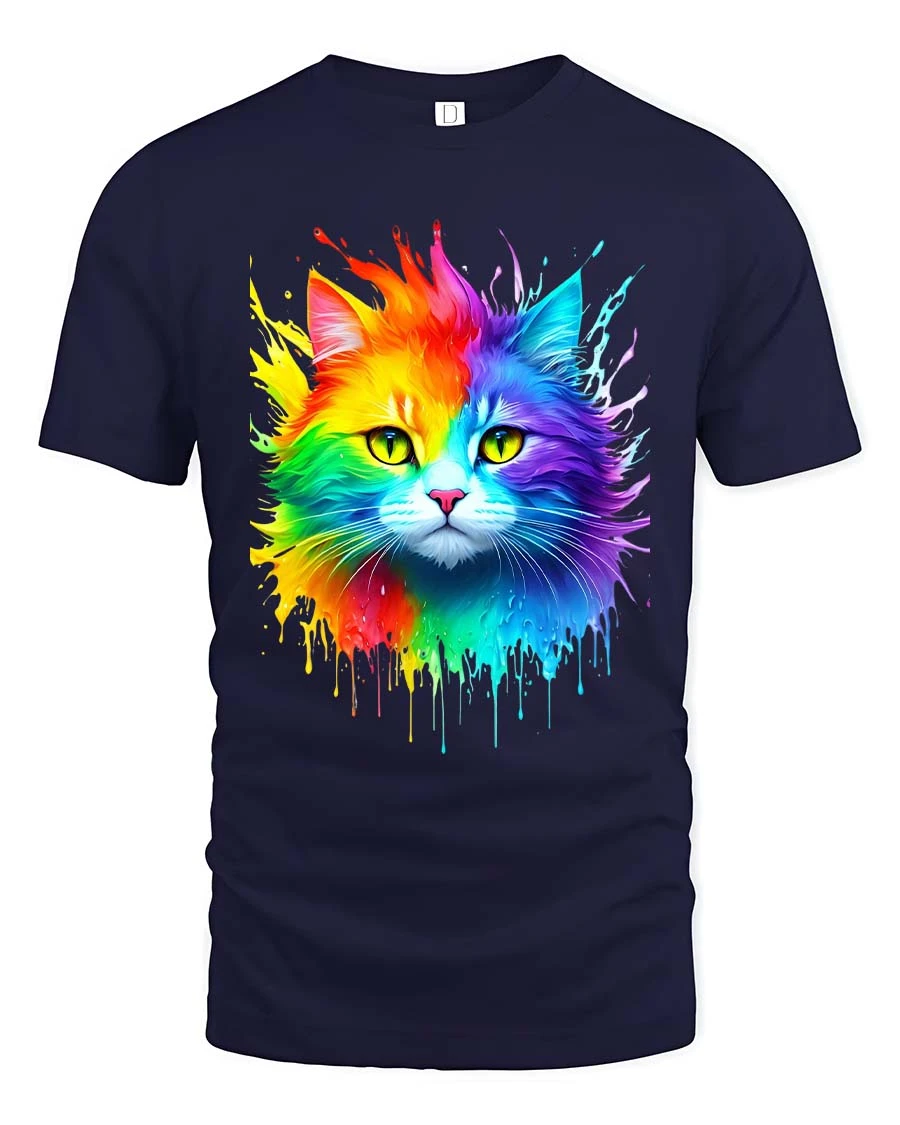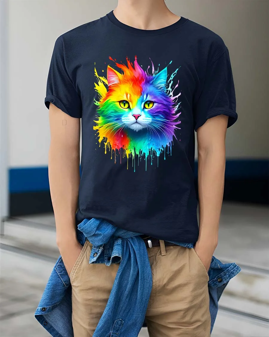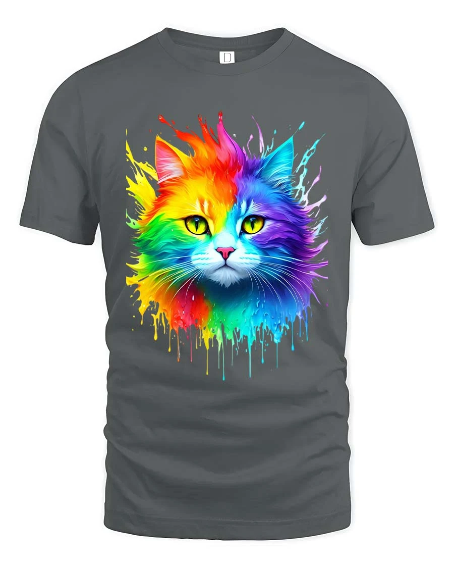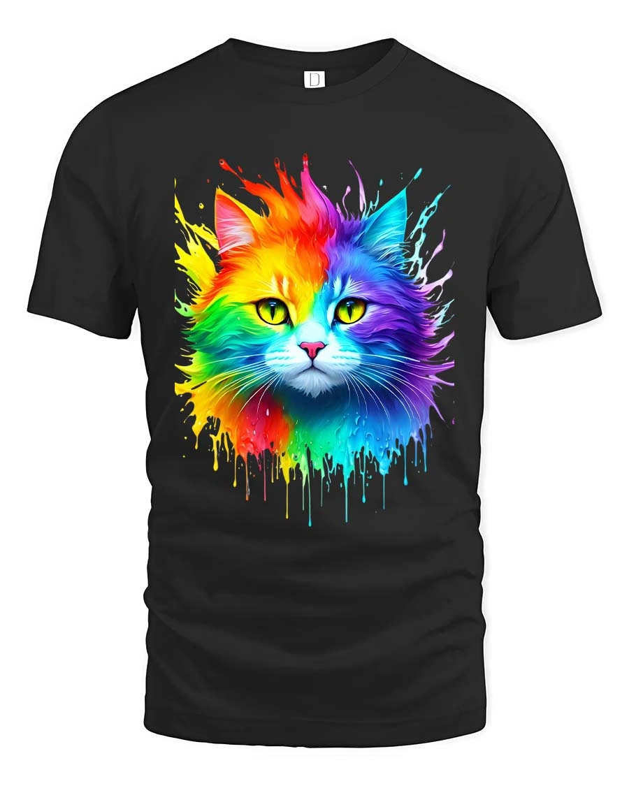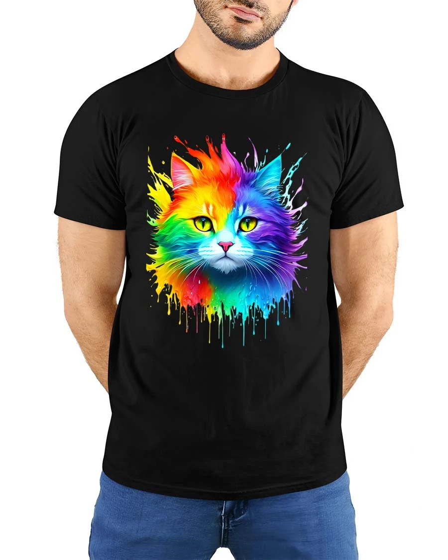 Featuring a vivid cat face bursting with rainbow colors and paint splash effects, this graphic tee captures attention with its bright and artistic expression.