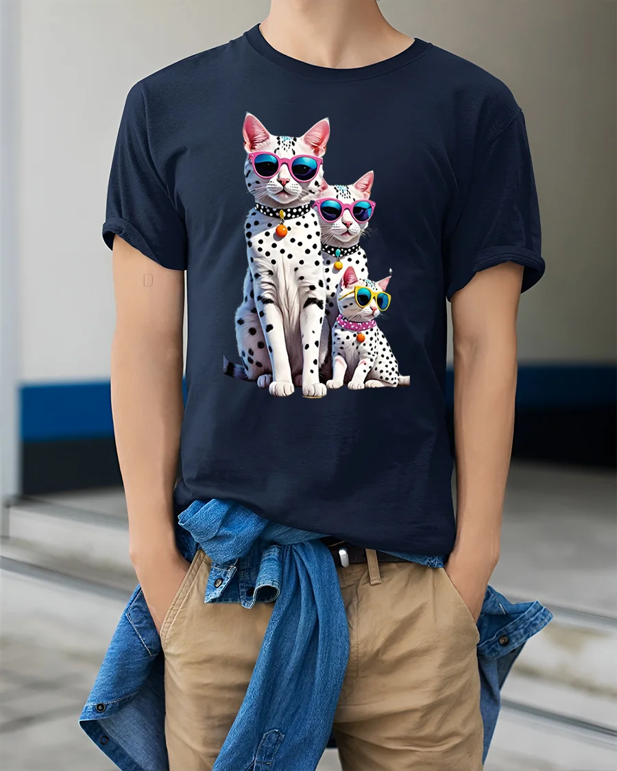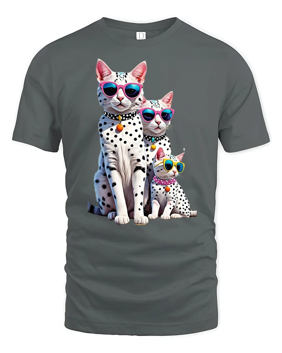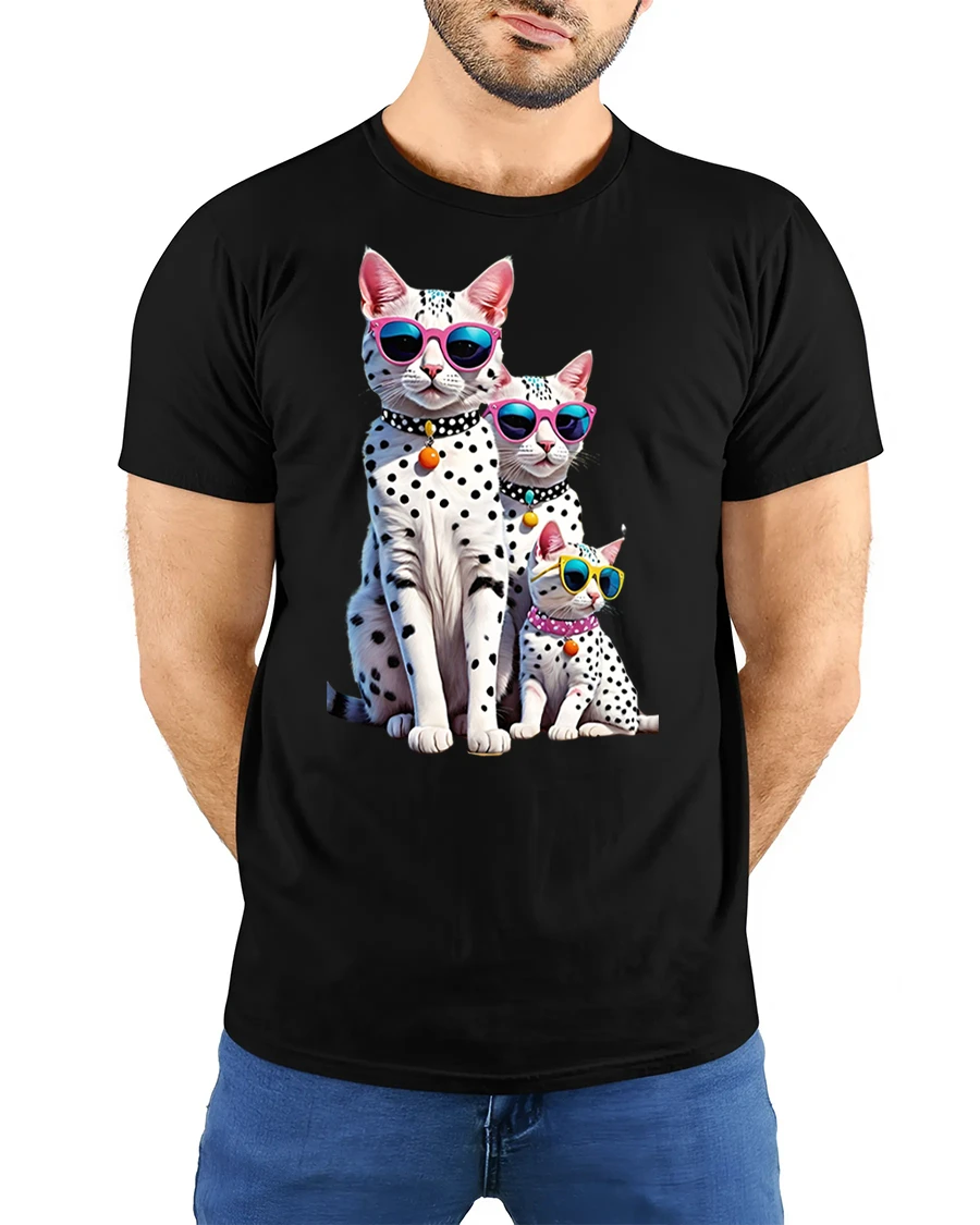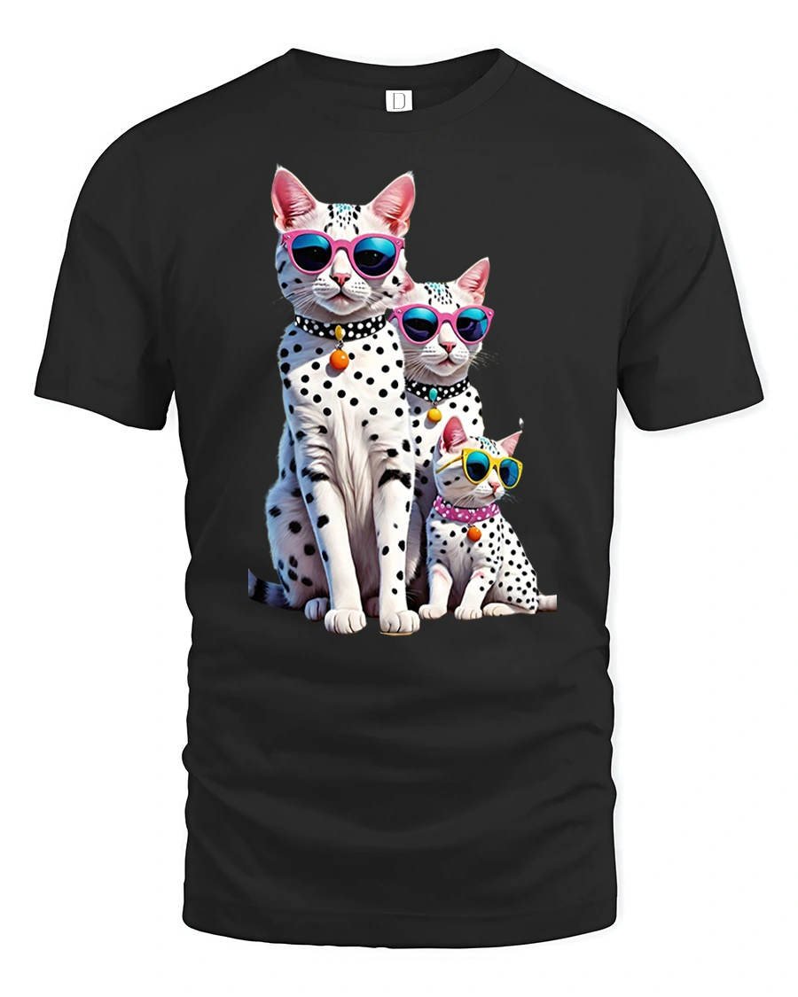 The Cool Cat Family Tee with Sunglasses and Fun Spotted Design delivers a perfect mix of humor, personality, and stylish artwork. Featuring three adorable spotted cats wearing colorful sunglasses, this tee stands out with its bright, bold attitude and irresistible charm. Each cat is designed with detailed expressions and playful accessories, creating an eye-catching graphic that brings fun energy to any outfit.