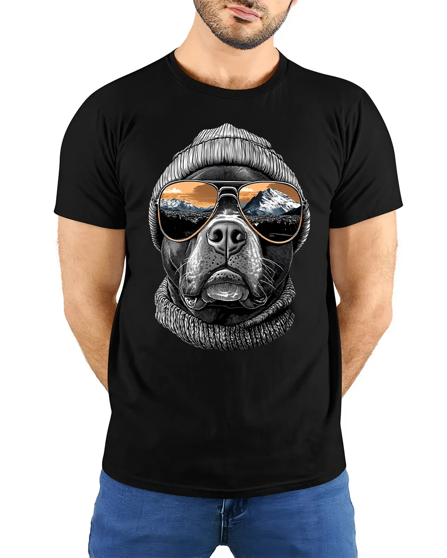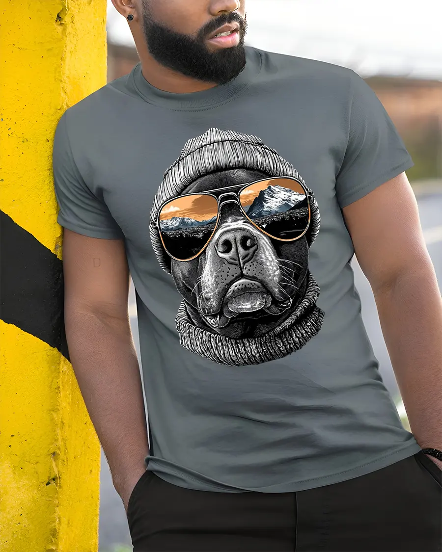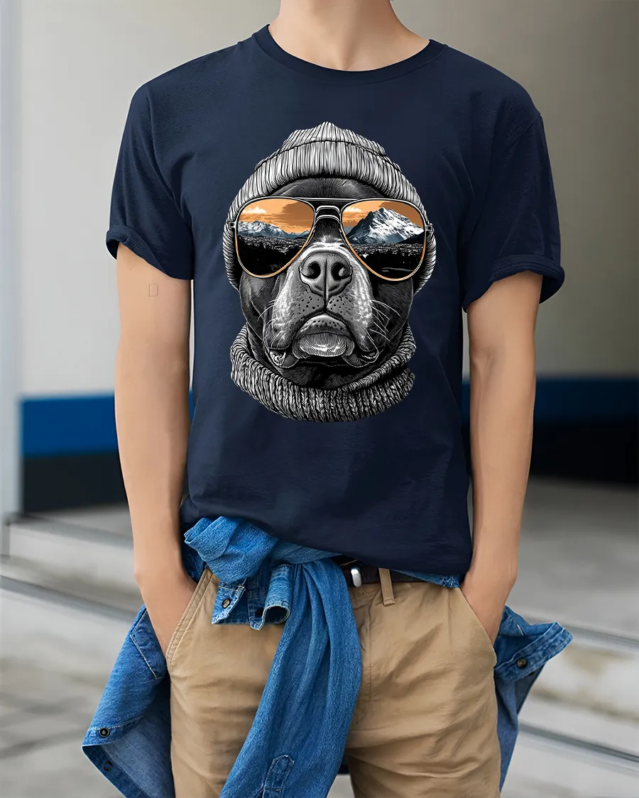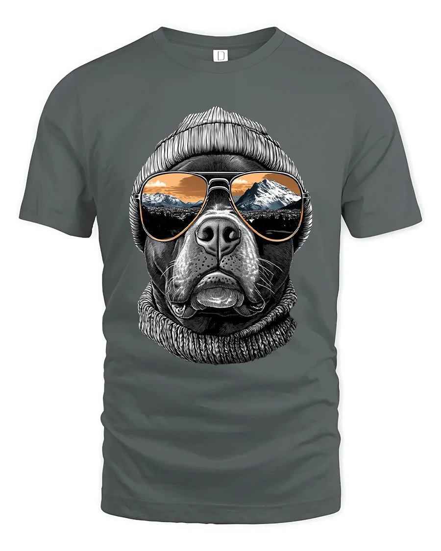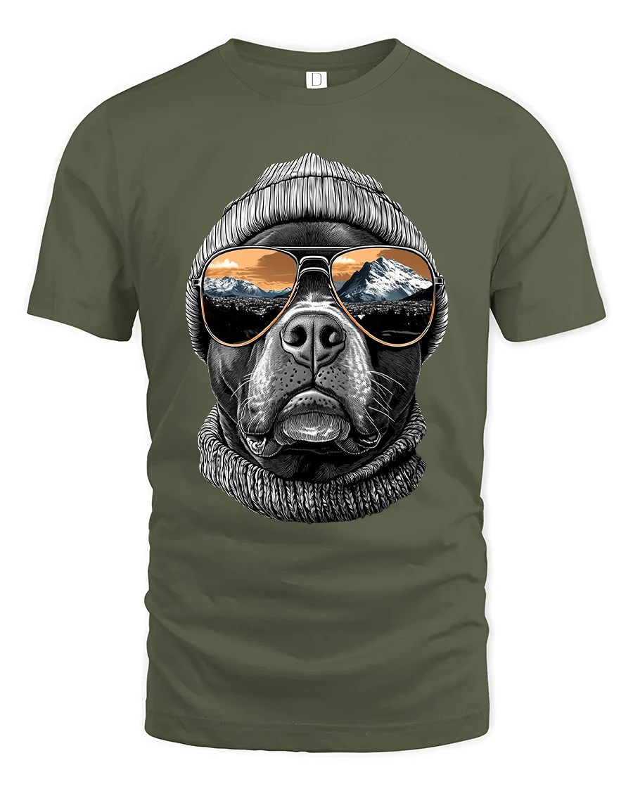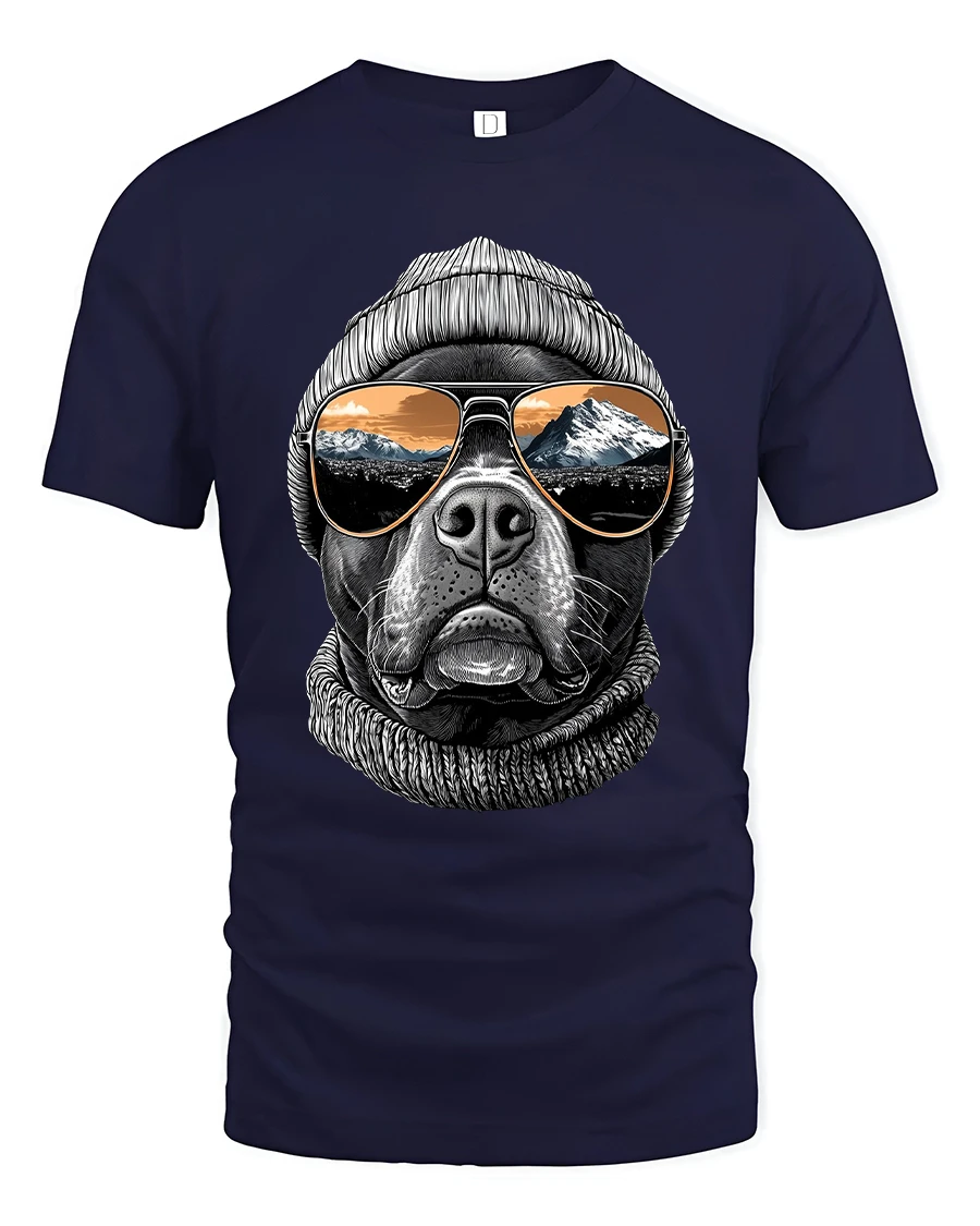 The Cool Dog Beanie Sunglasses Mountain View Graphic Tshirt Tee blends relaxed style with outdoor inspiration in a unique artistic design.
