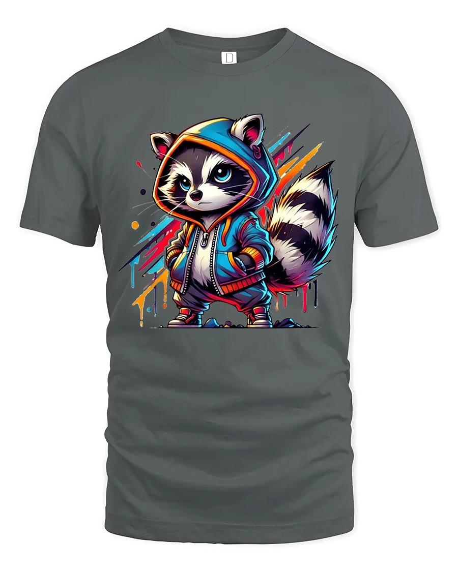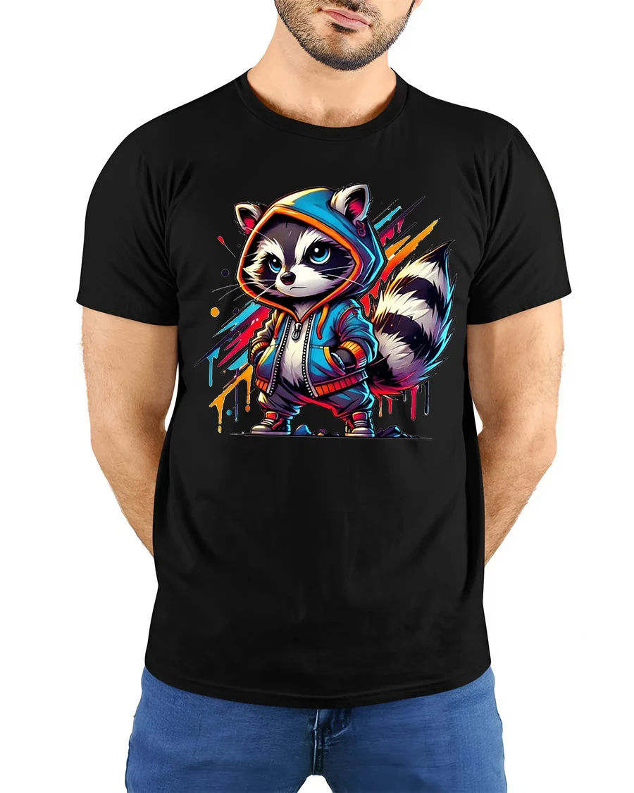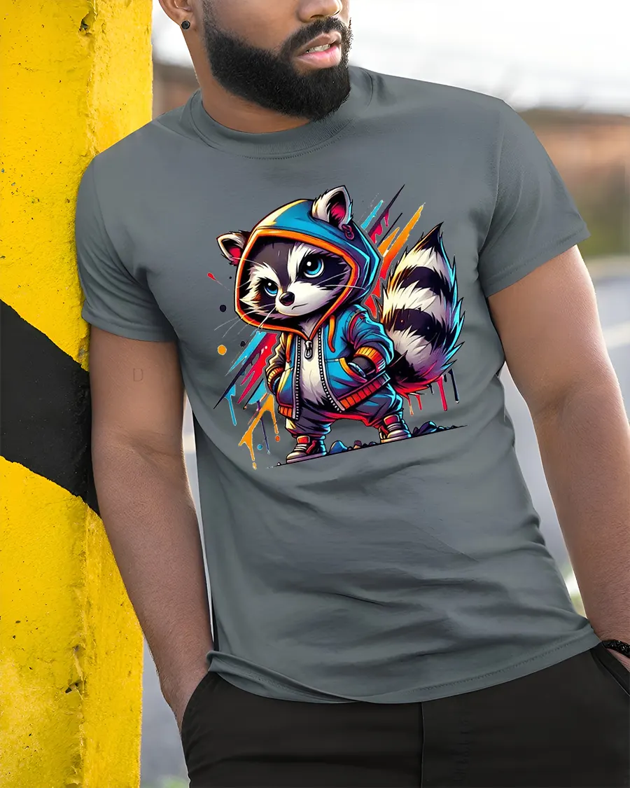 The cartoon raccoon design adds humor charm and expressive style to everyday wear.