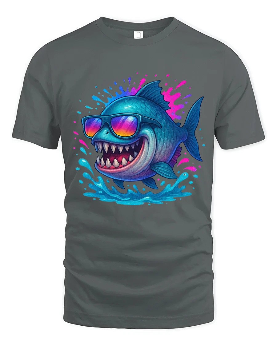 Featuring a grinning shark rocking stylish sunglasses with vibrant water splash effects this artwork delivers fun confidence and carefree vibes.