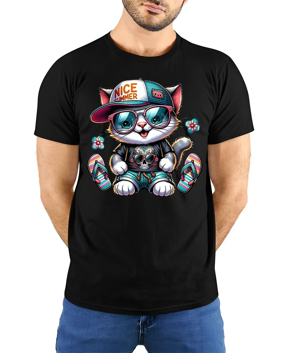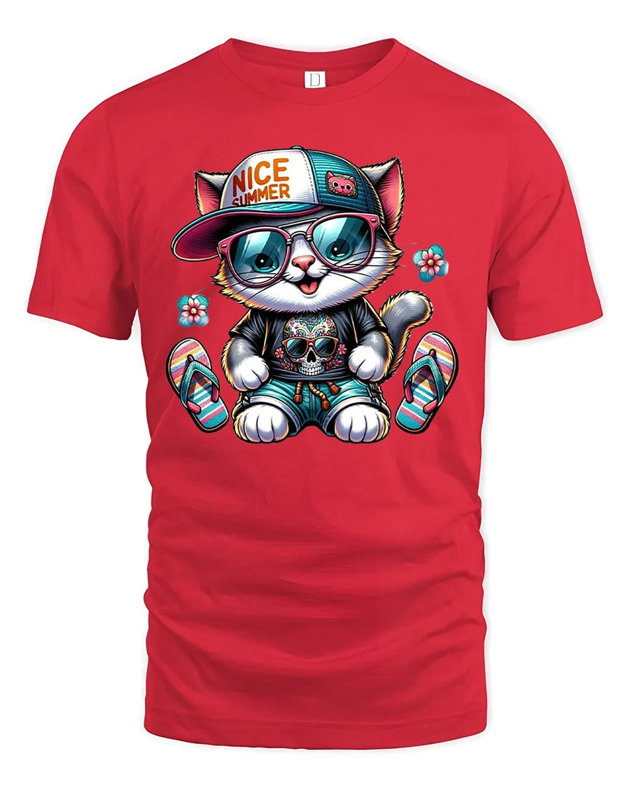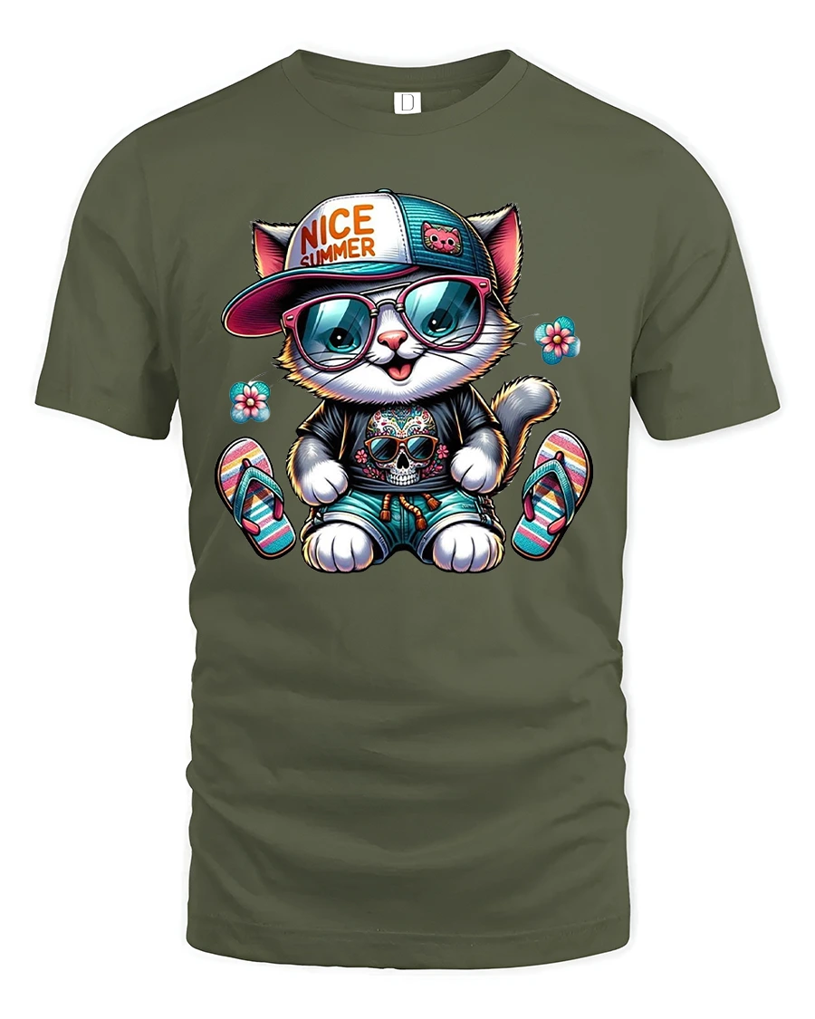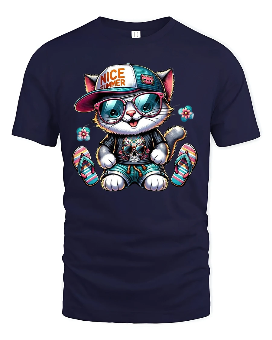 Featuring an adorable cat in shades, flip-flops, and a cap that says “Nice Summer,” this tee captures the playful, carefree spirit of beach life.