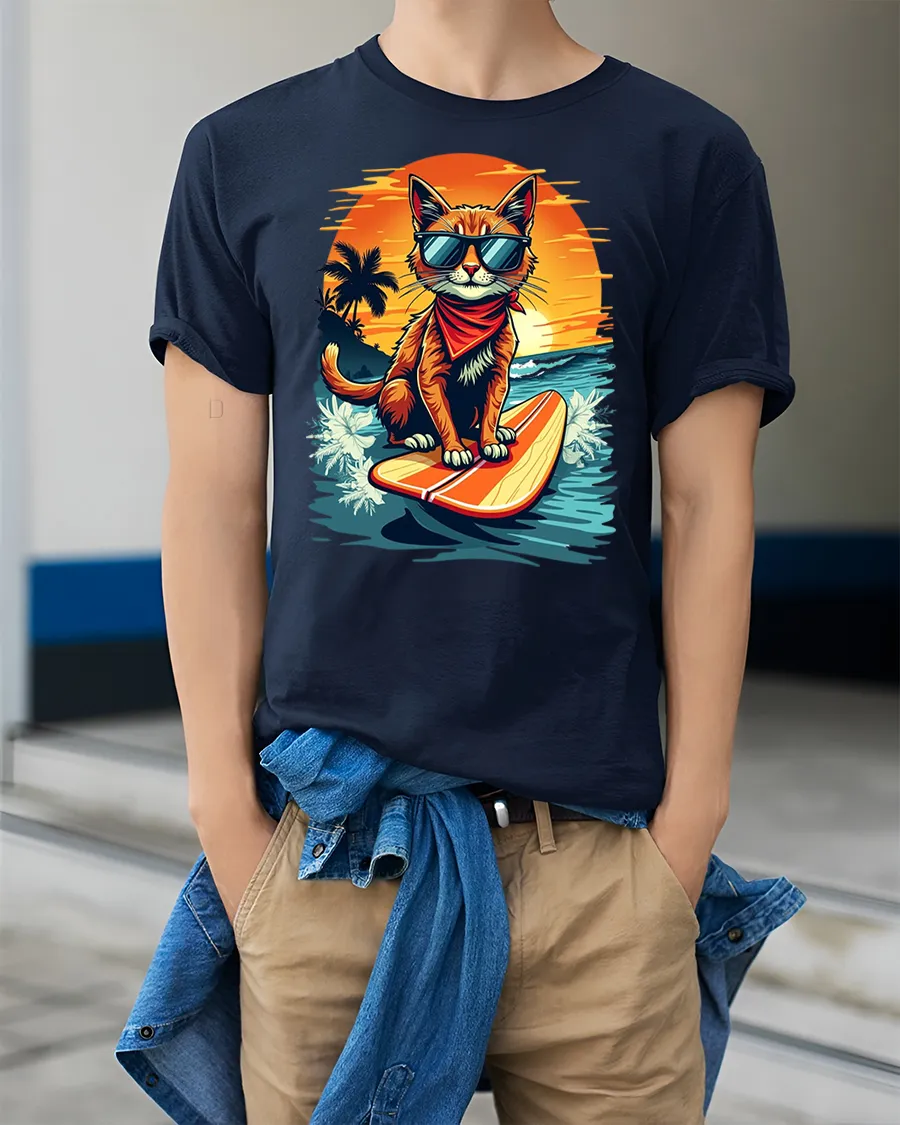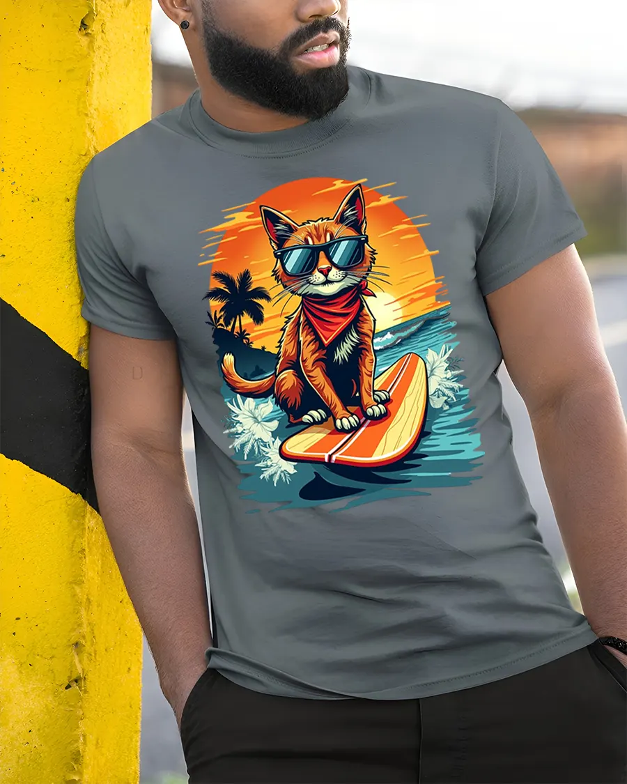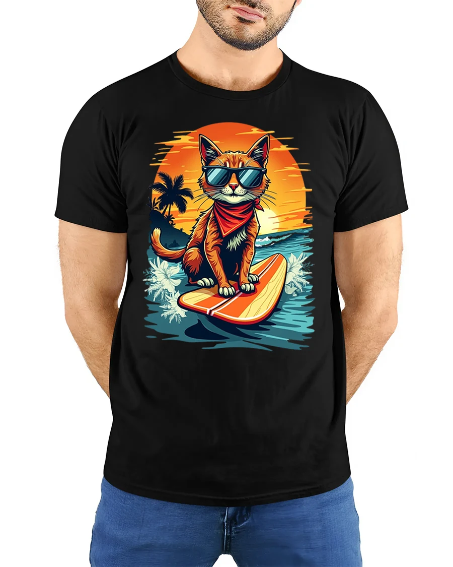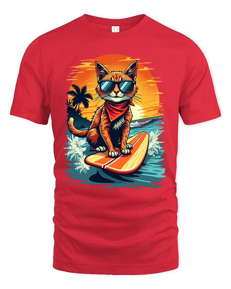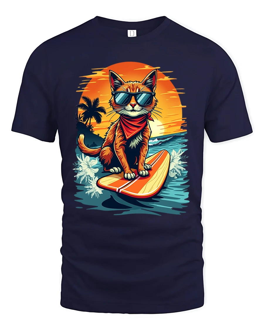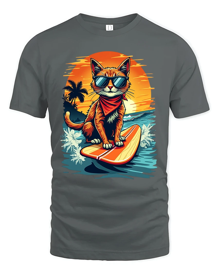 Cool Surfing Fox Graphic Tee Sunset Beach Animal Art Tshirt captures the spirit of summer fun and carefree style.