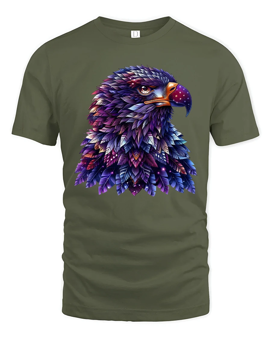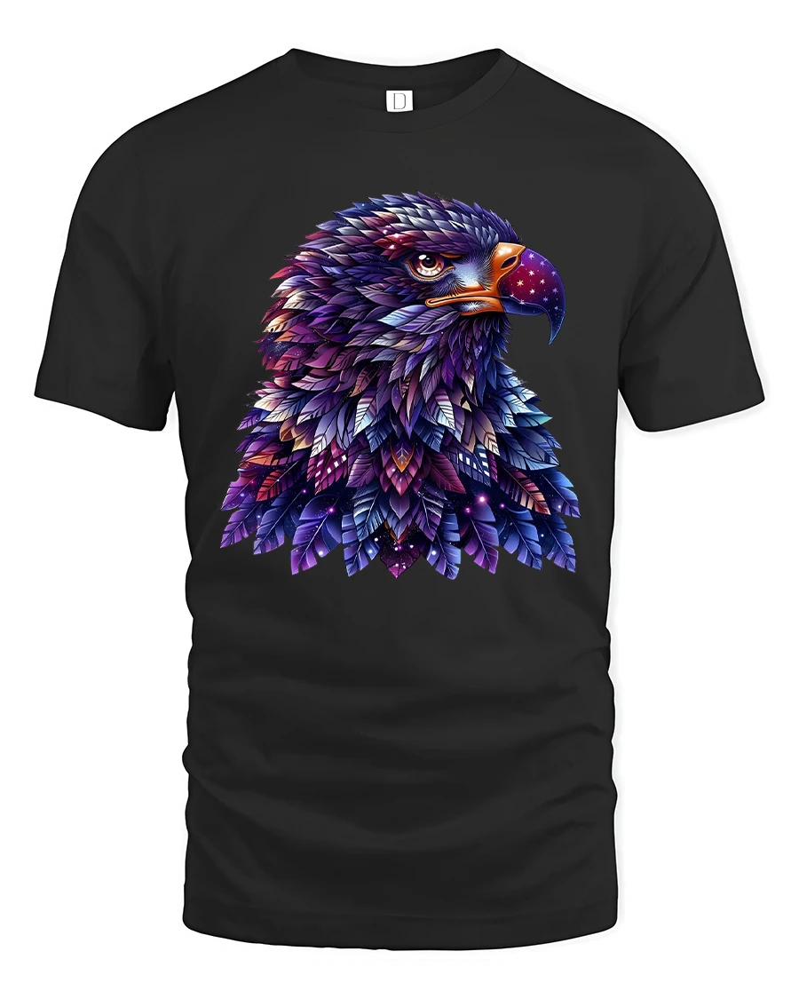 This tee features a detailed eagle portrait made of layered feathers filled with galaxy colors stars and cosmic textures.