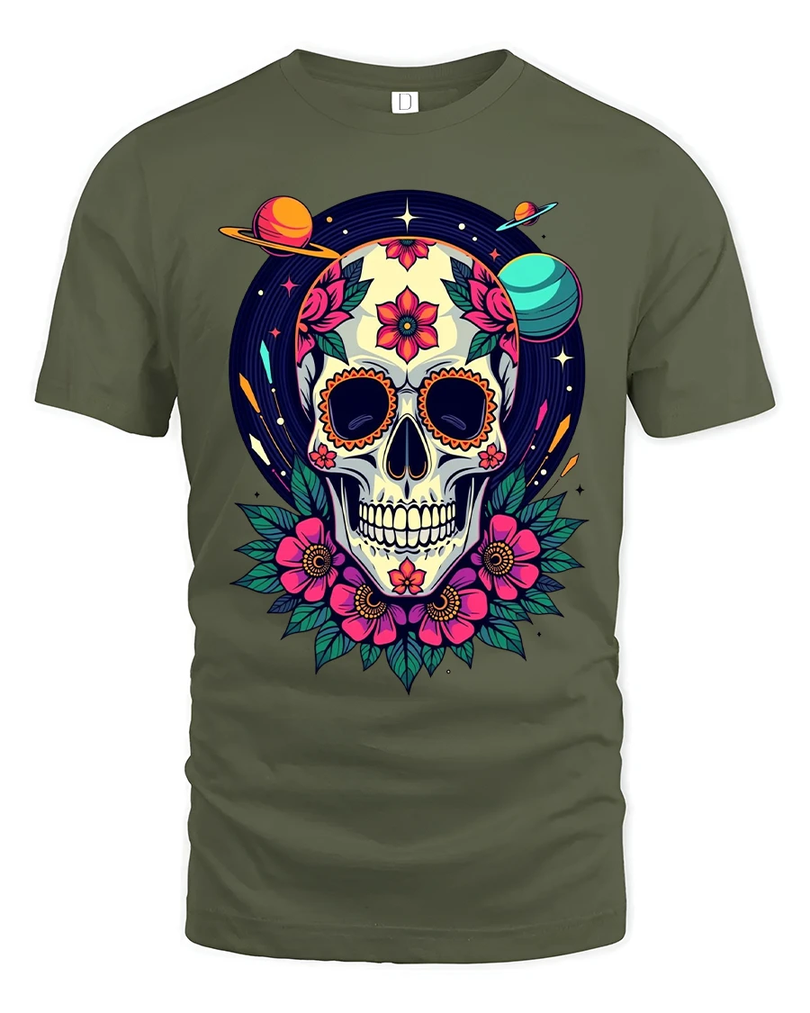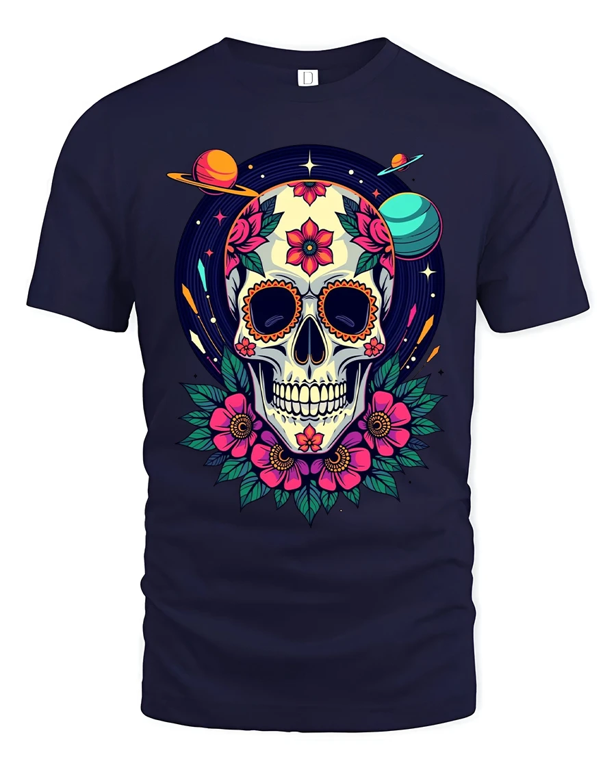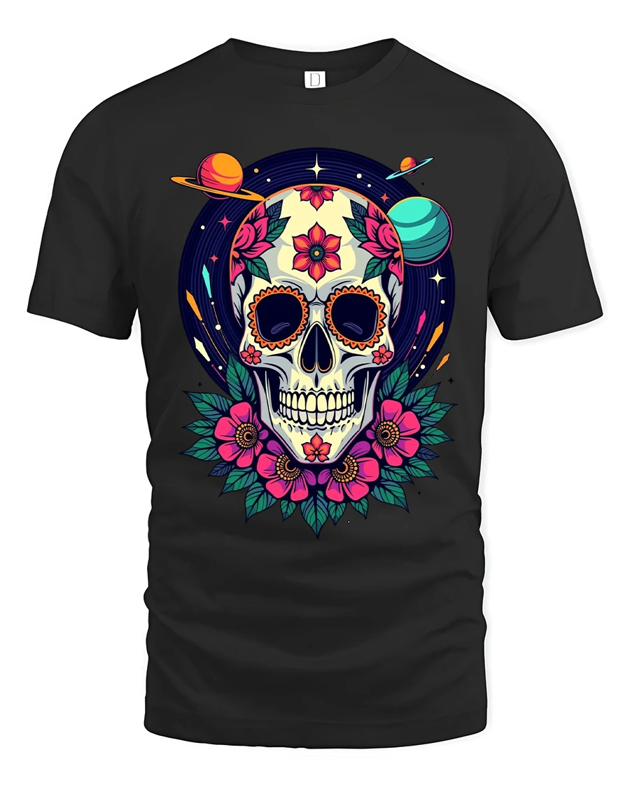 Cosmic Floral Skull Space Art Vibrant Graphic Summer TShirt Tee brings together bold creativity and celestial imagination in one striking design. The artwork features a beautifully detailed skull adorned with bright flowers, surrounded by swirling planets and a glowing cosmic backdrop. This blend of floral beauty and outer space elements creates a unique graphic that instantly stands out and adds personality to any outfit.