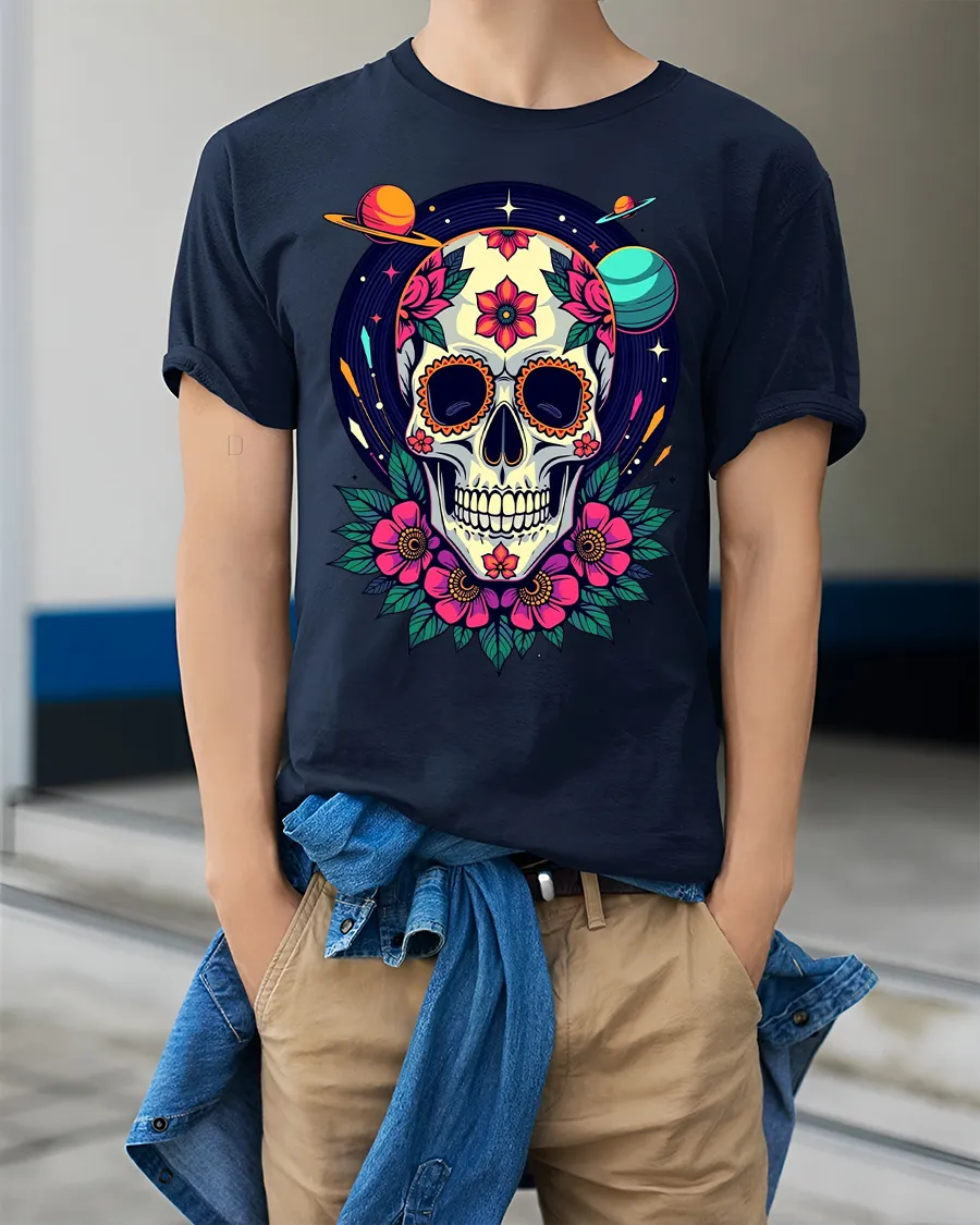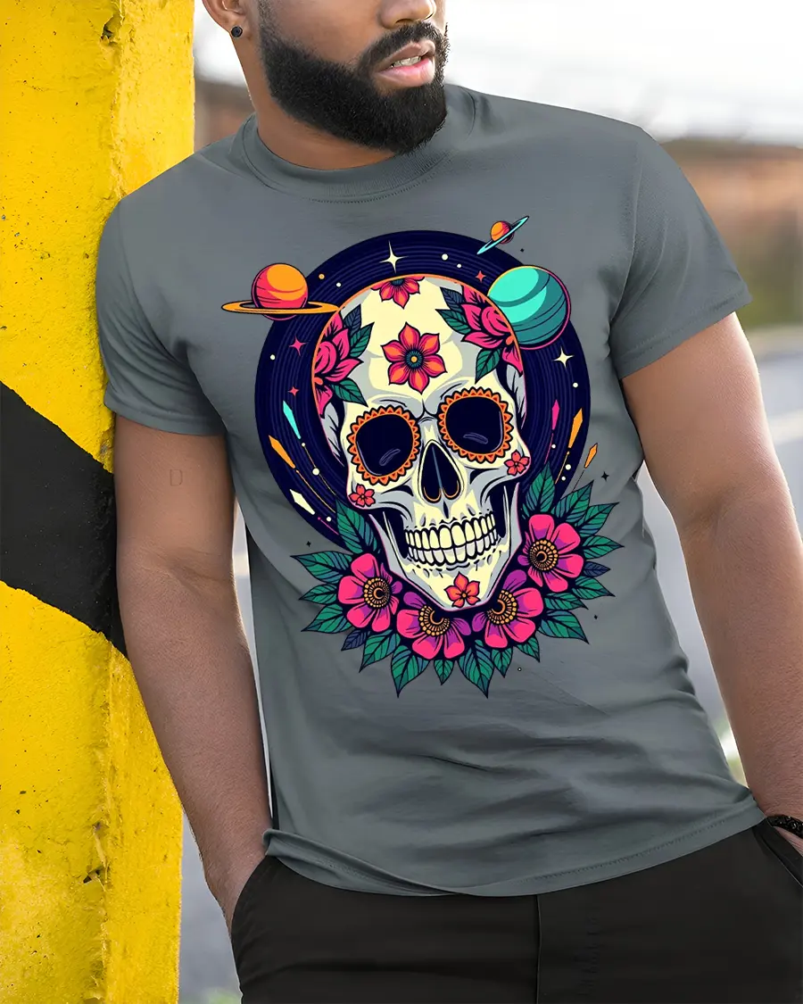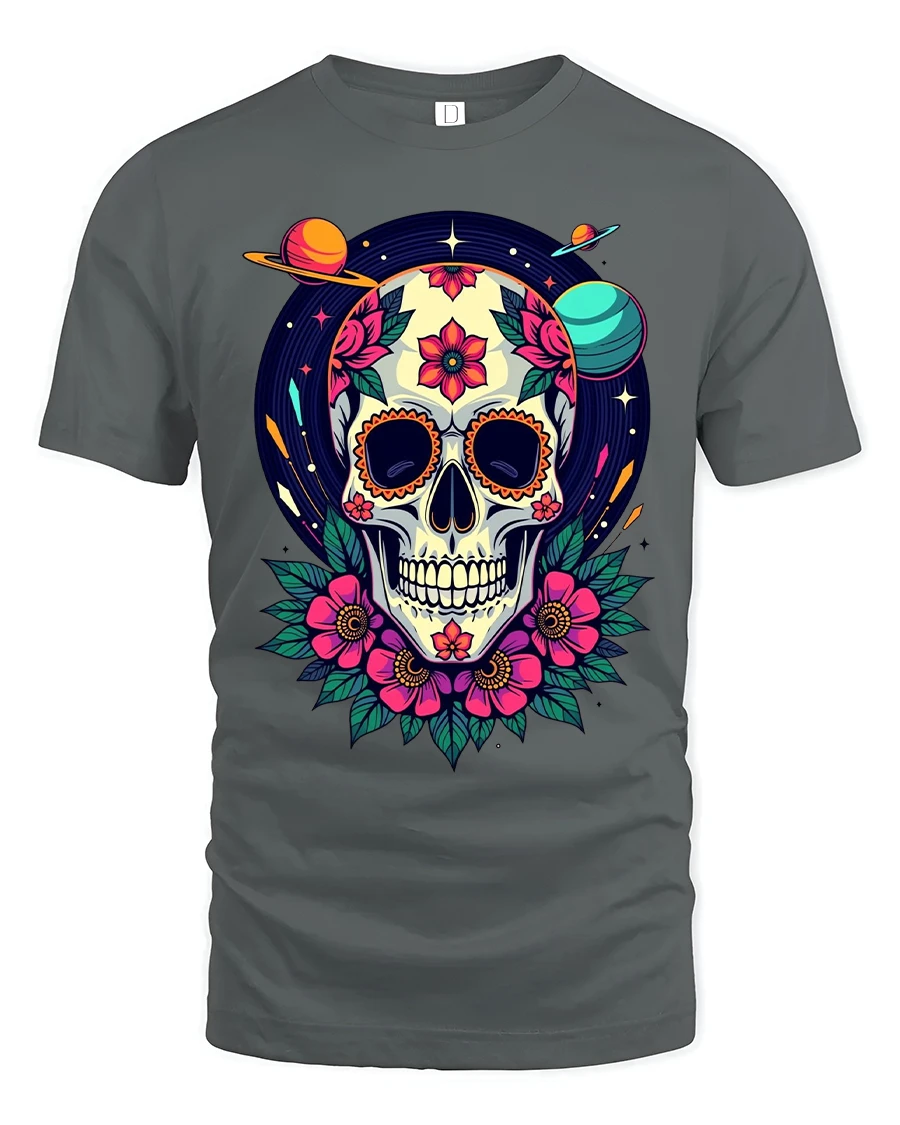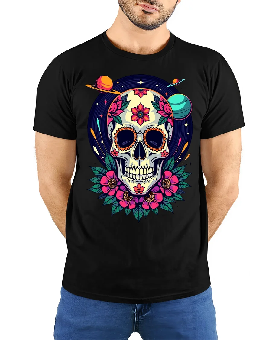 Cosmic Floral Skull Space Art Vibrant Graphic Summer TShirt Tee brings together bold creativity and celestial imagination in one striking design. The artwork features a beautifully detailed skull adorned with bright flowers, surrounded by swirling planets and a glowing cosmic backdrop. This blend of floral beauty and outer space elements creates a unique graphic that instantly stands out and adds personality to any outfit.