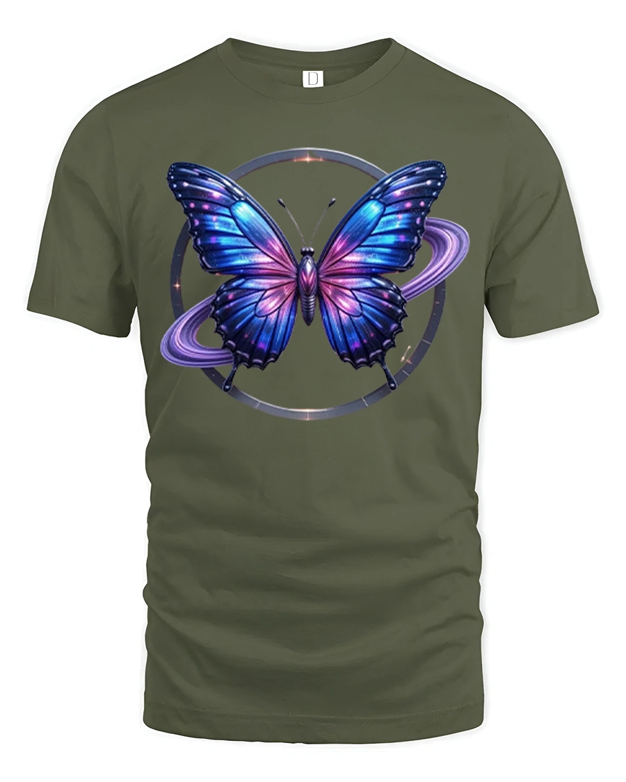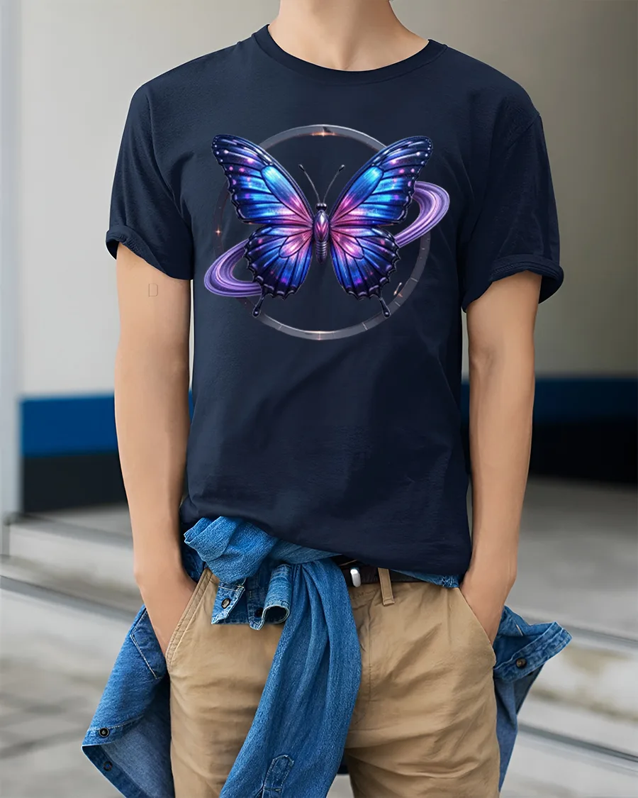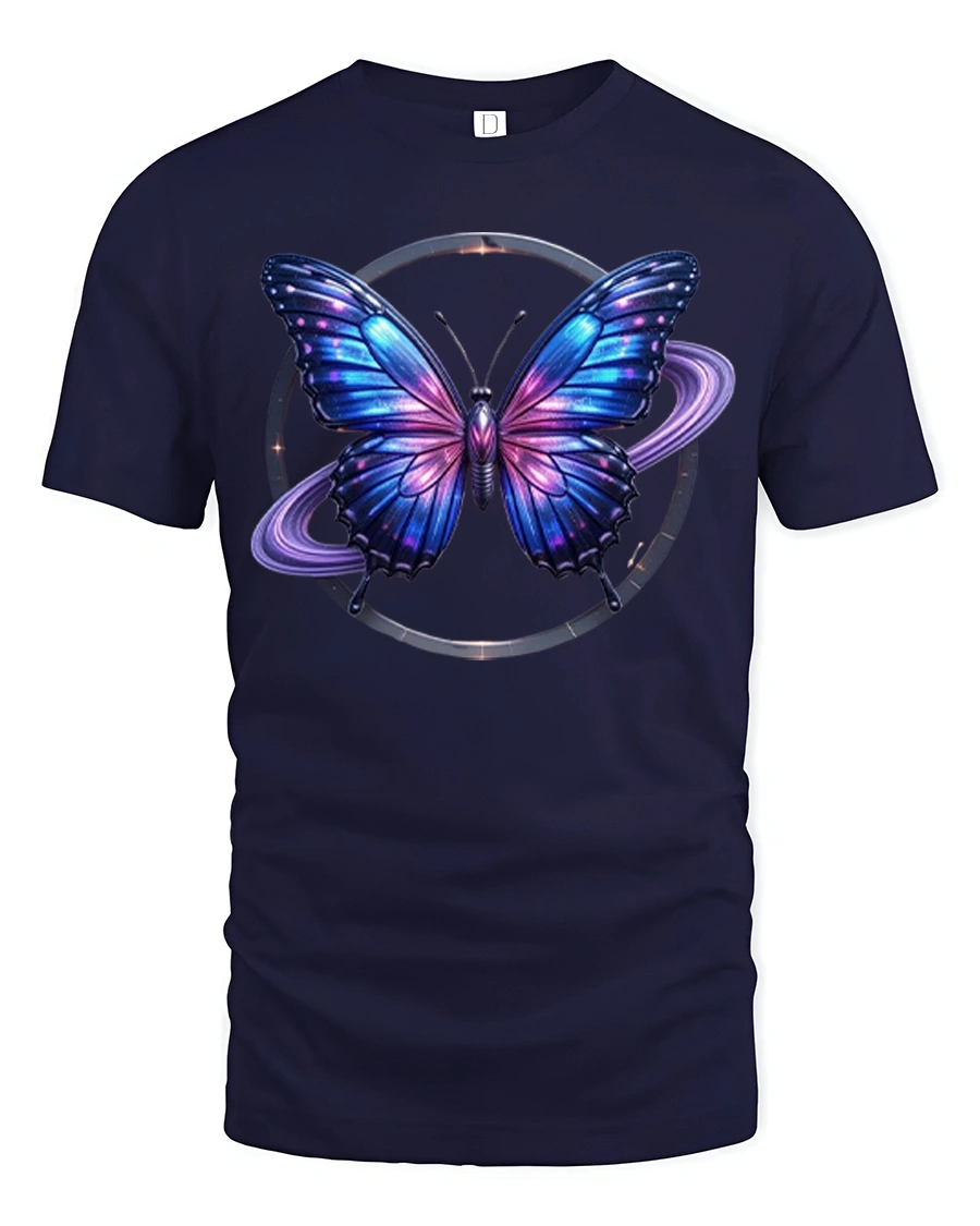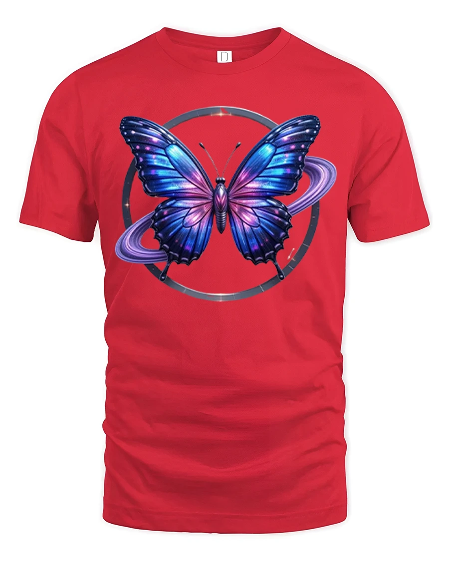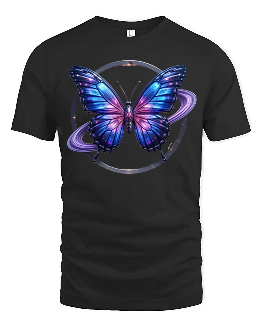 This graphic t shirt showcases a vibrant butterfly surrounded by glowing galaxy elements and celestial rings creating a sense of motion mystery and wonder.