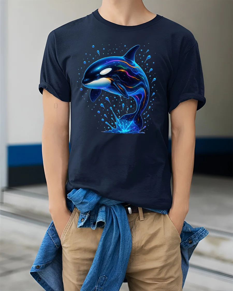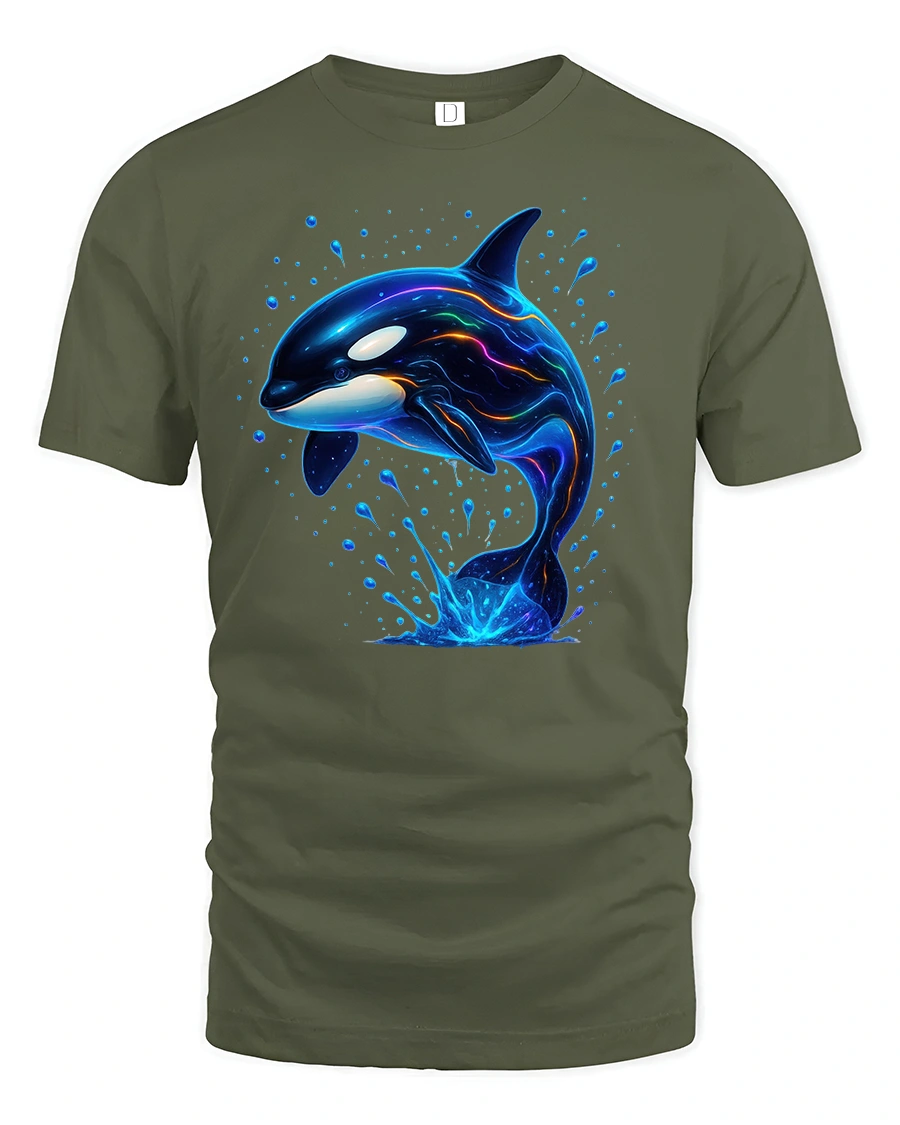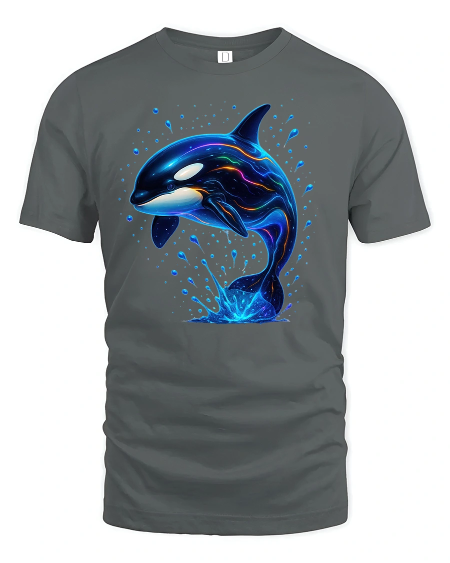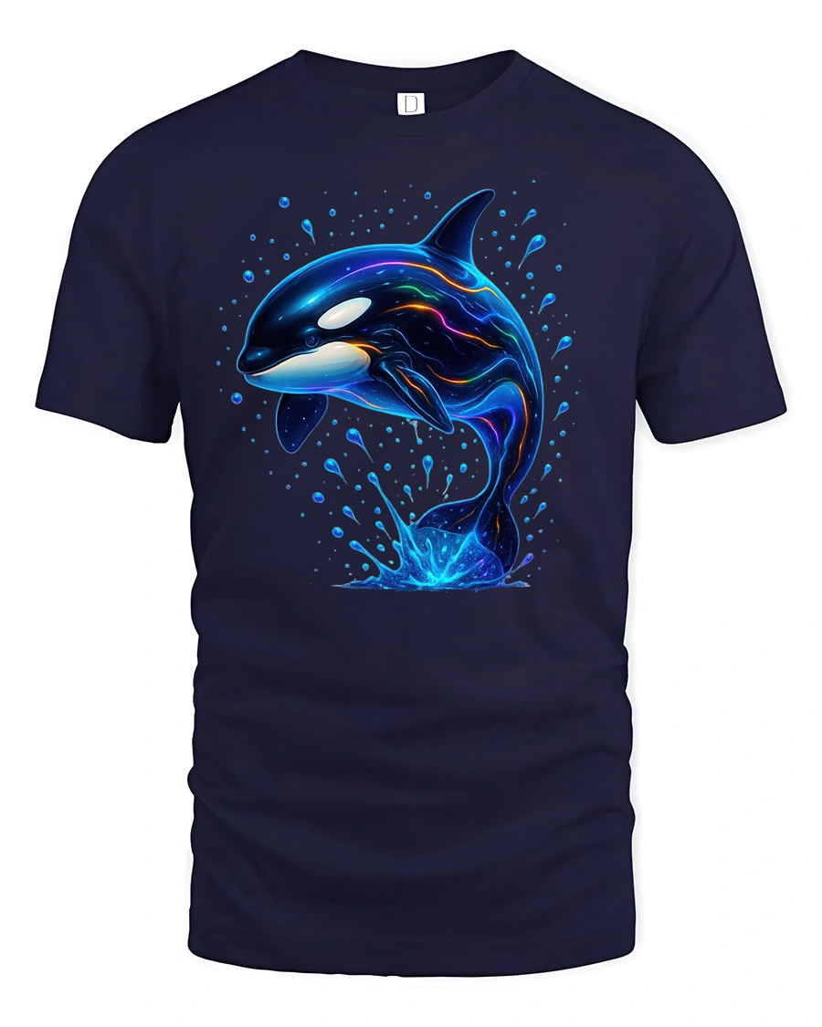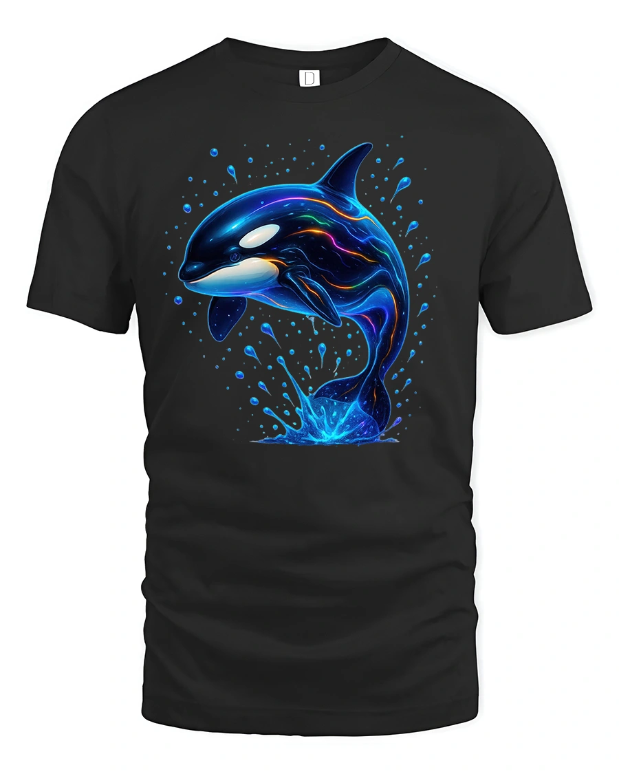 Featuring a vibrant orca leaping from a glowing splash surrounded by galaxy-like waves, this tee captures the magic of the ocean in every detail.