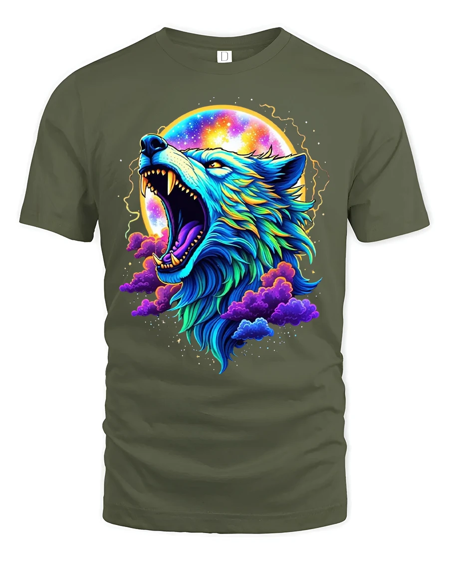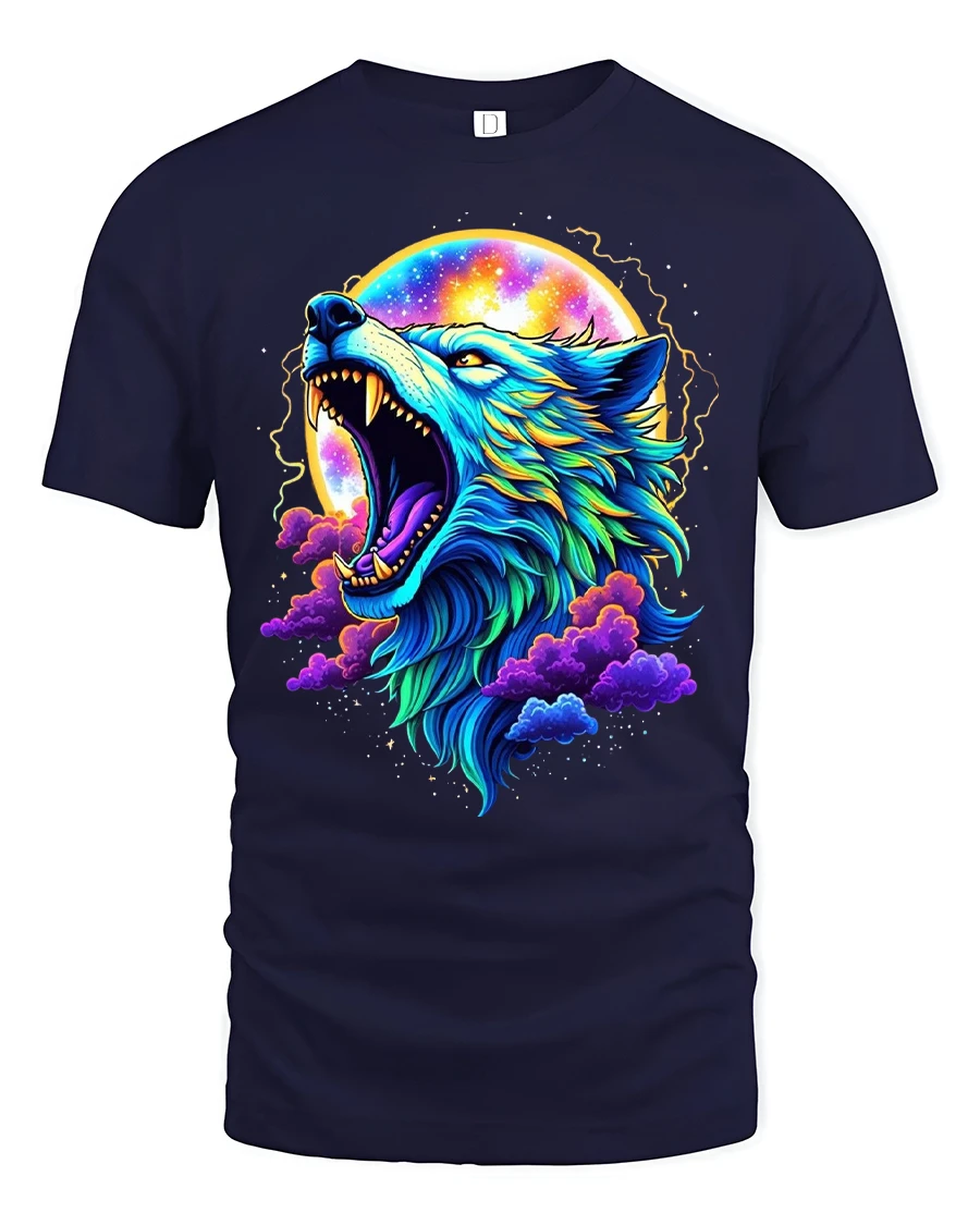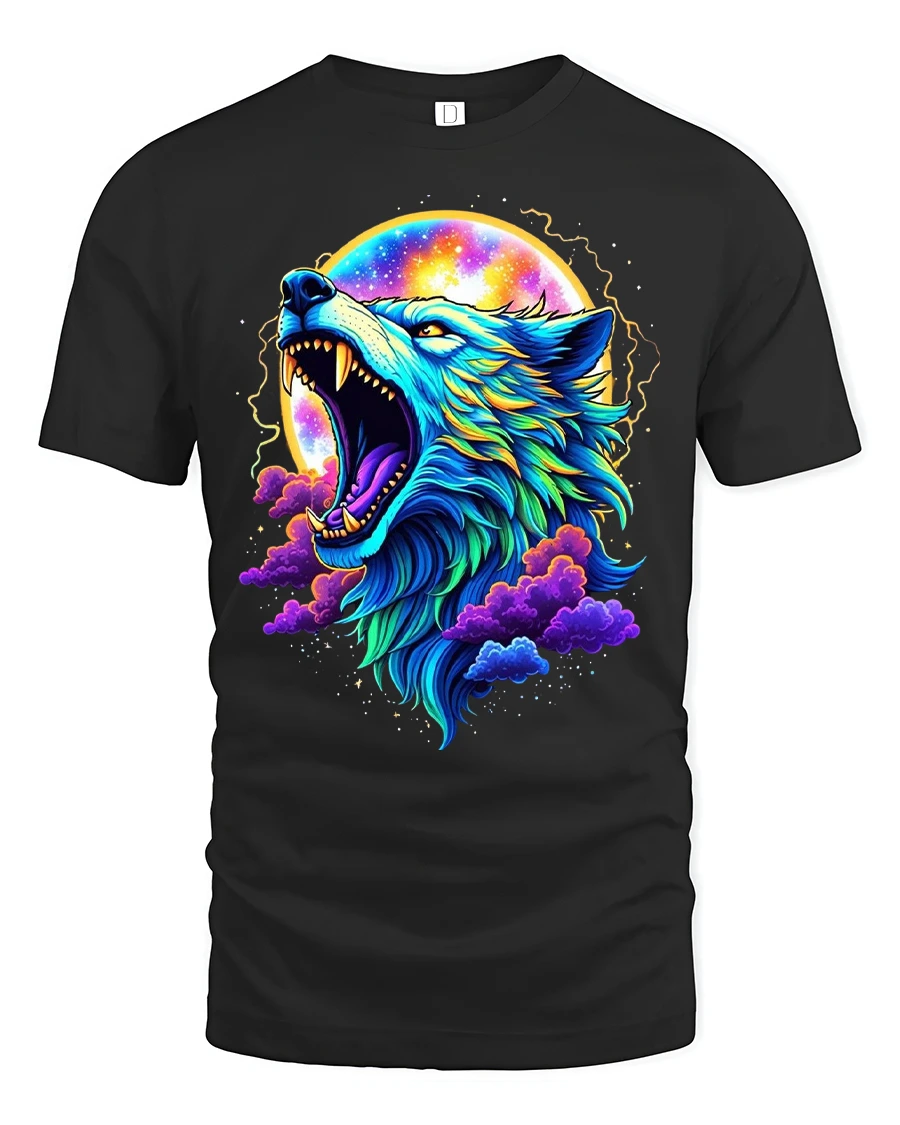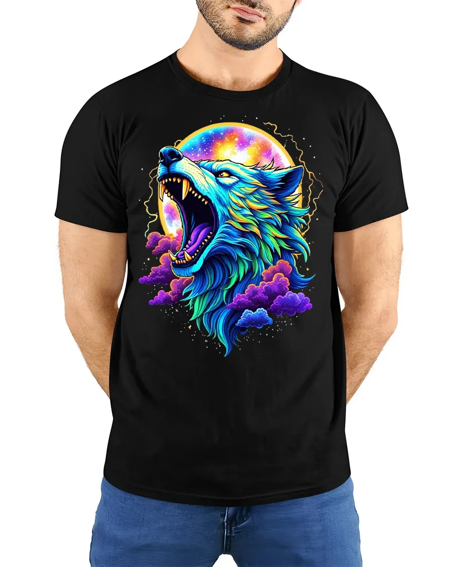 Cosmic Wolf Moon Art Graphic T Shirt Tee With Neon Colors showcases a fierce howling wolf surrounded by a glowing moon and vibrant cosmic clouds.