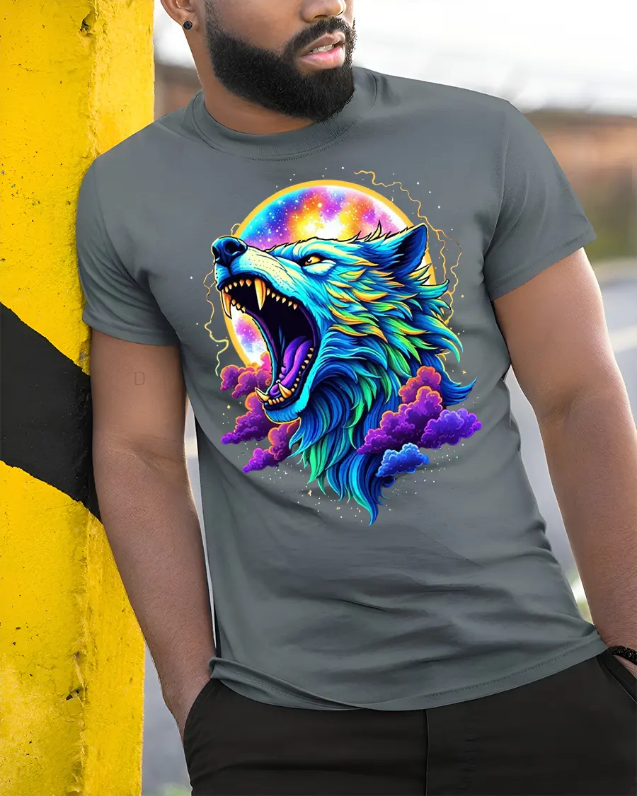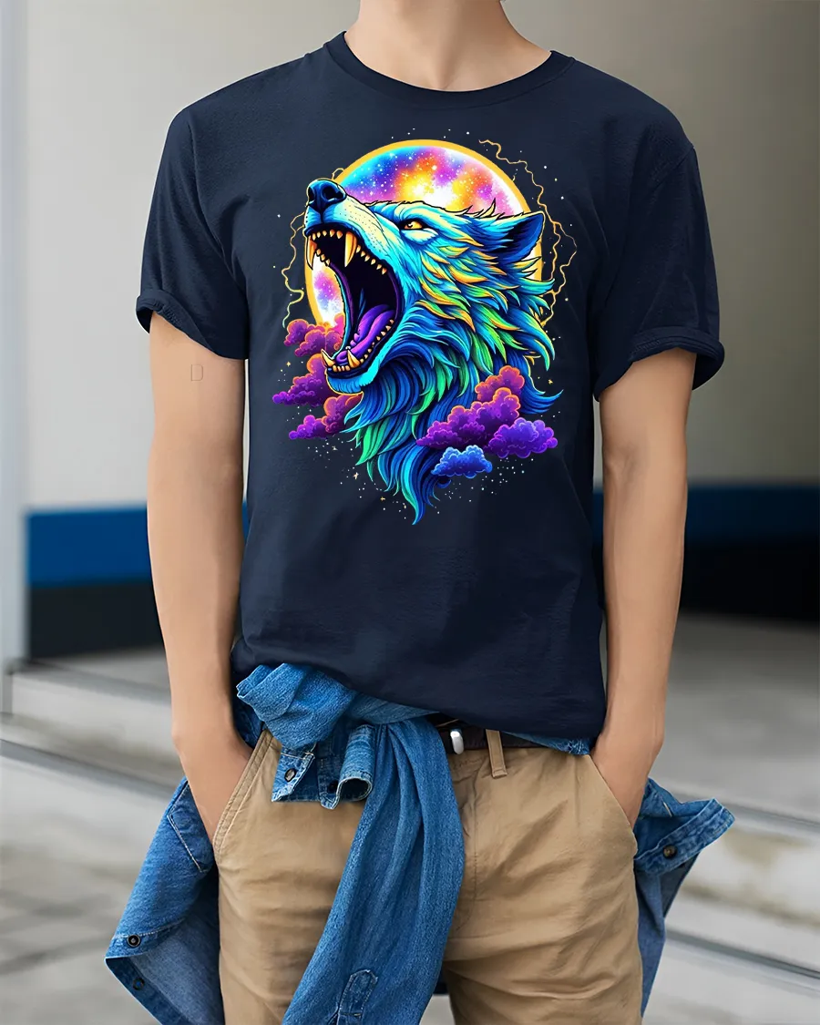 Cosmic Wolf Moon Art Graphic T Shirt Tee With Neon Colors is crafted to bring bold style into everyday wear.