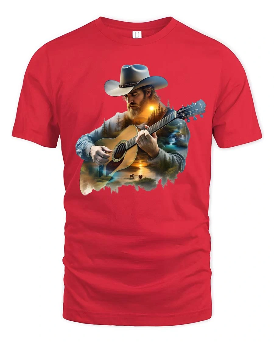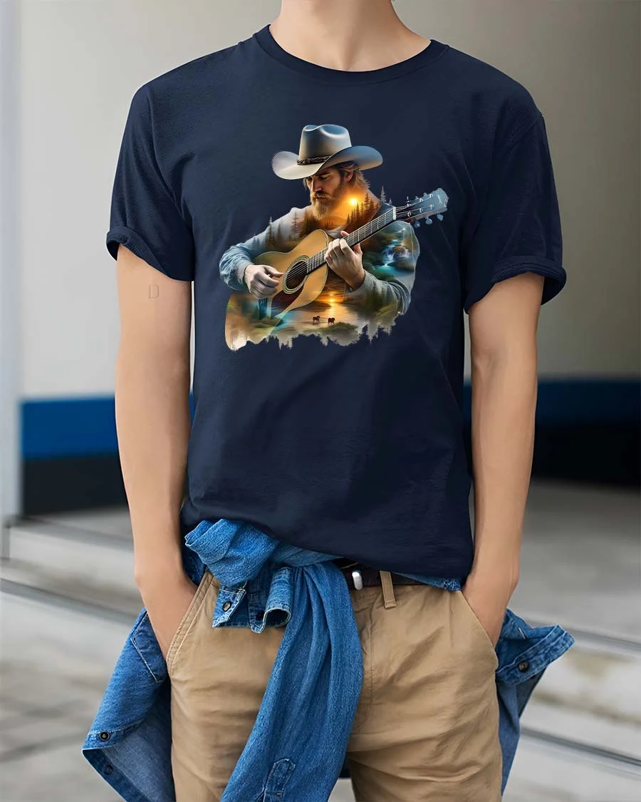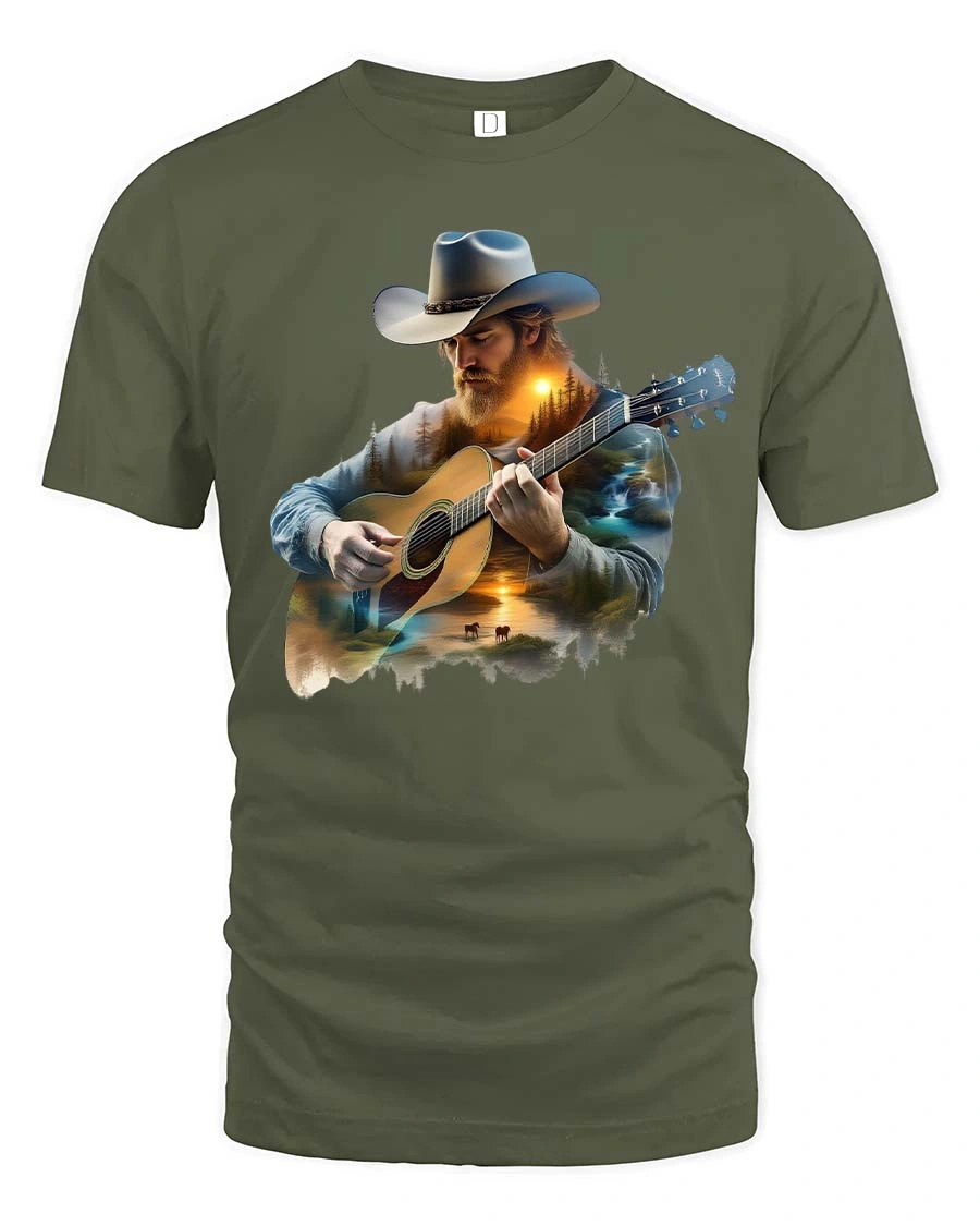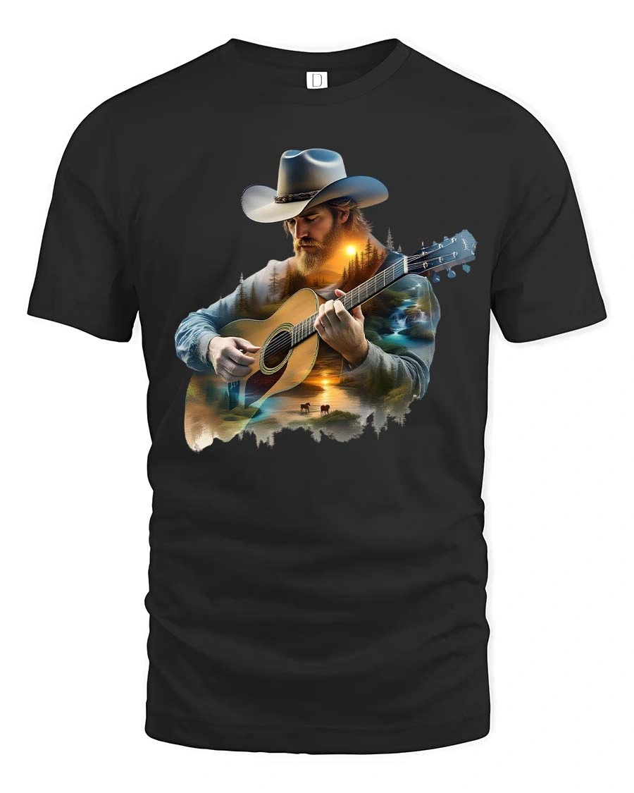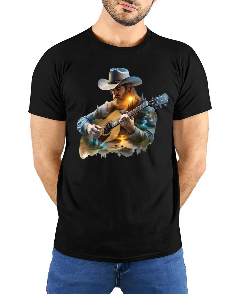 This Country Cowboy Playing Guitar Scenic Western Graphic T Shirt features a striking illustration of a rugged cowboy wearing a classic hat while playing an acoustic guitar.