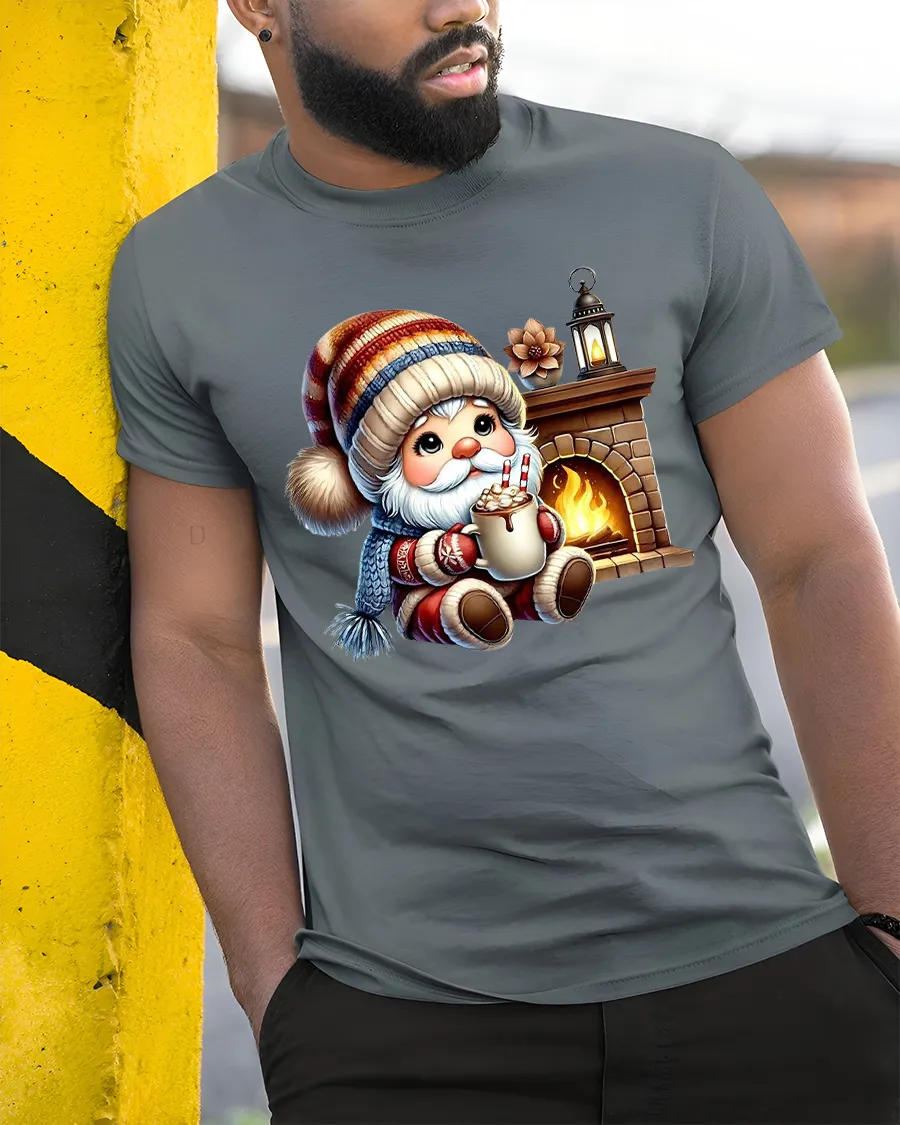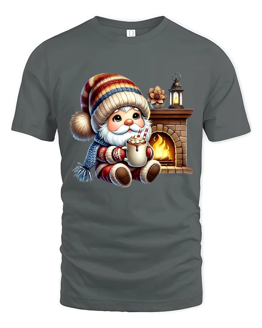 Cozy Winter Gnome Hot Cocoa Fireplace Cartoon Graphic Tee brings a heartwarming holiday mood to your everyday style.