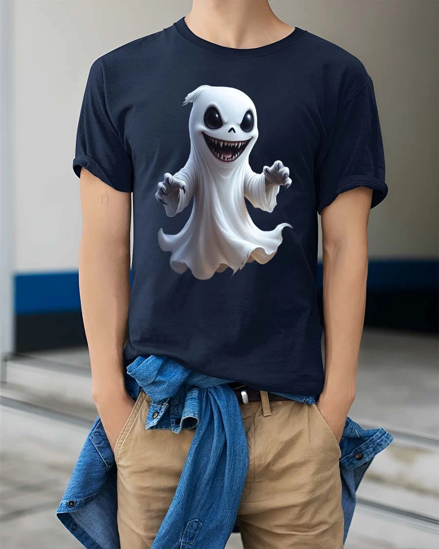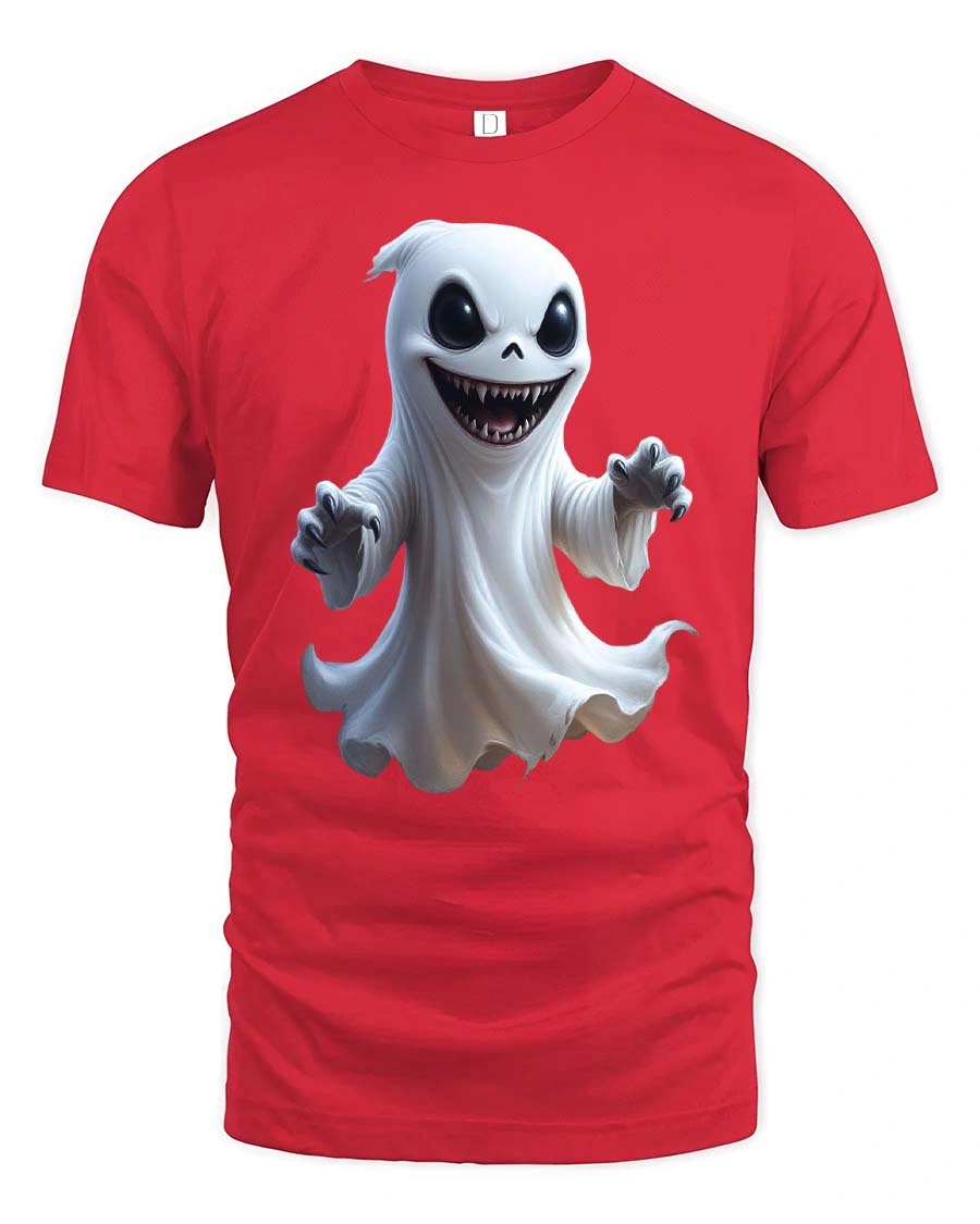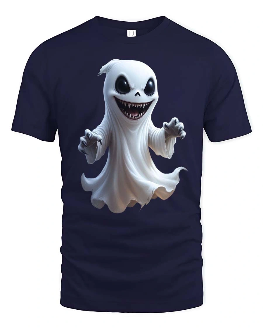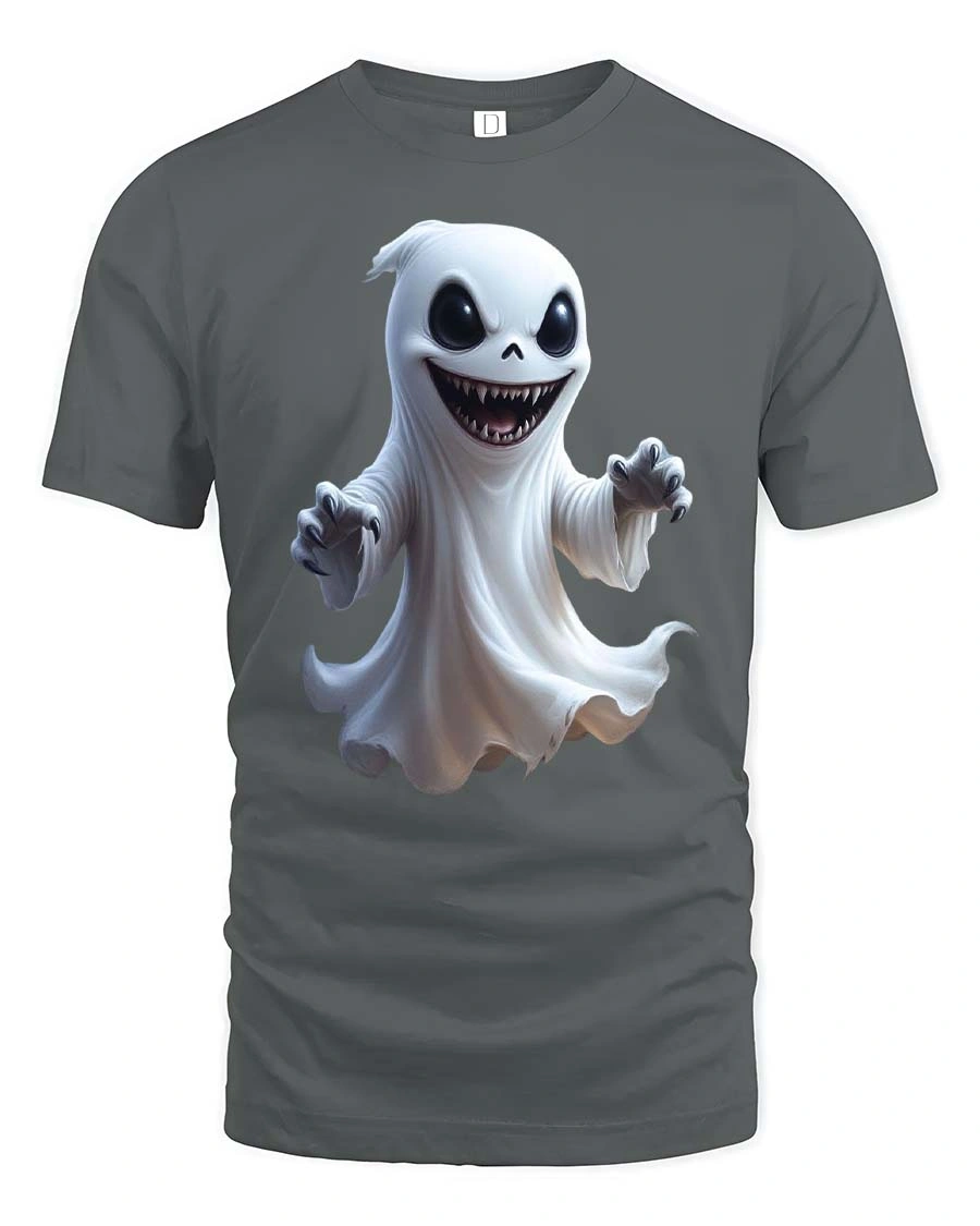 Add a playful spooky twist to your wardrobe with the Creepy Cute Smiling Ghost Cartoon Halloween Graphic T Shirt. This eye catching design features a mischievous little ghost floating with a wide grin, glowing dark eyes, and sharp spooky teeth. The cartoon style blends adorable charm with a creepy Halloween vibe, creating a fun graphic that instantly grabs attention and sparks conversation.