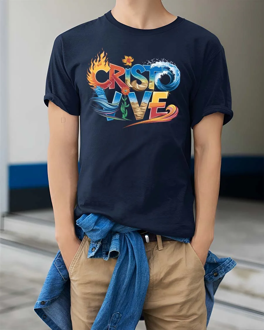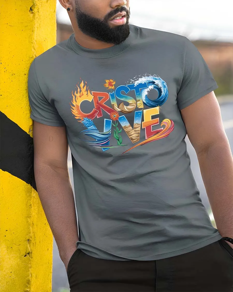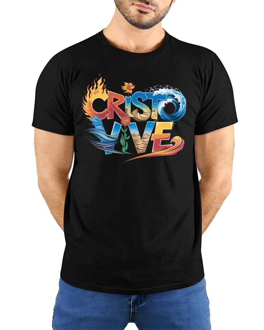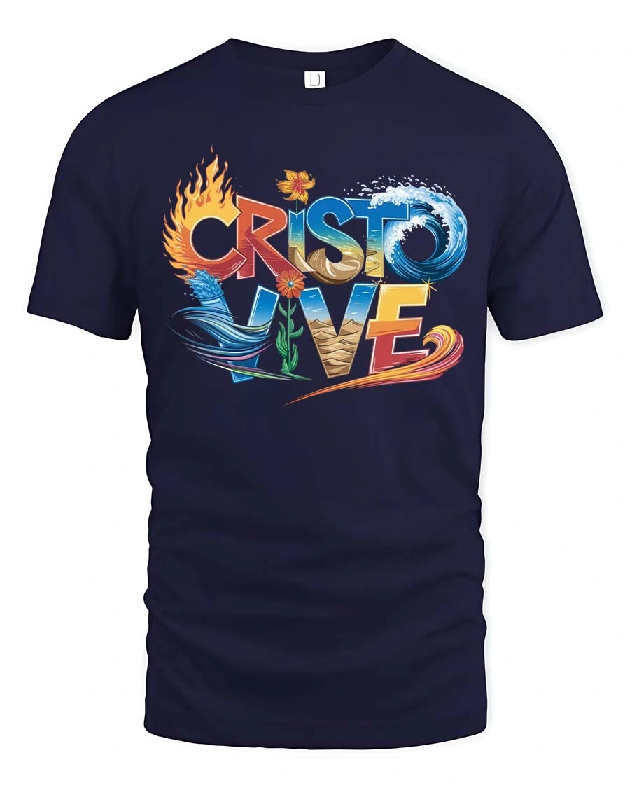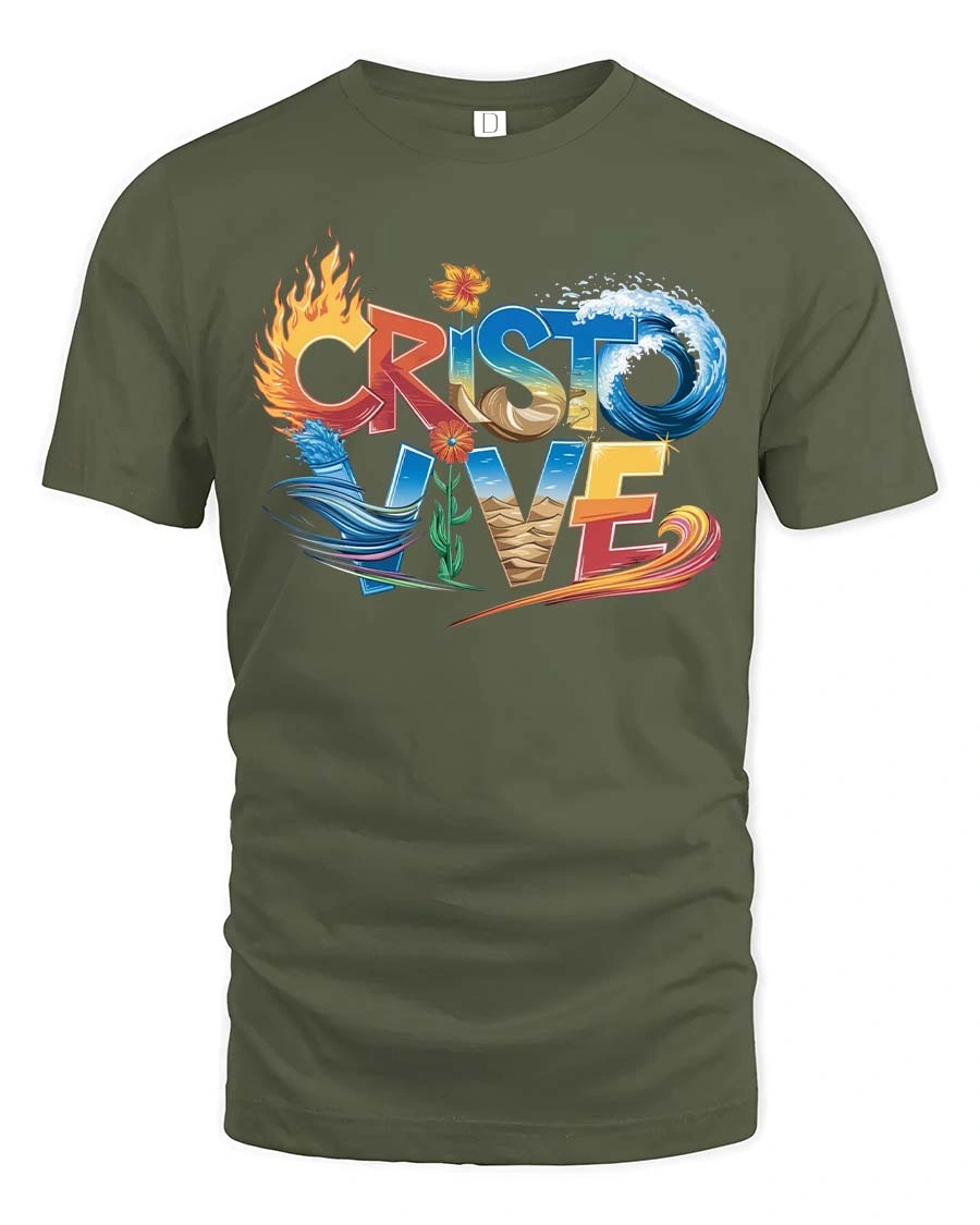 Cristo Vive T Shirt Christian Faith Fire Water Spirit Art expresses a powerful message of faith through vibrant symbolic elements.