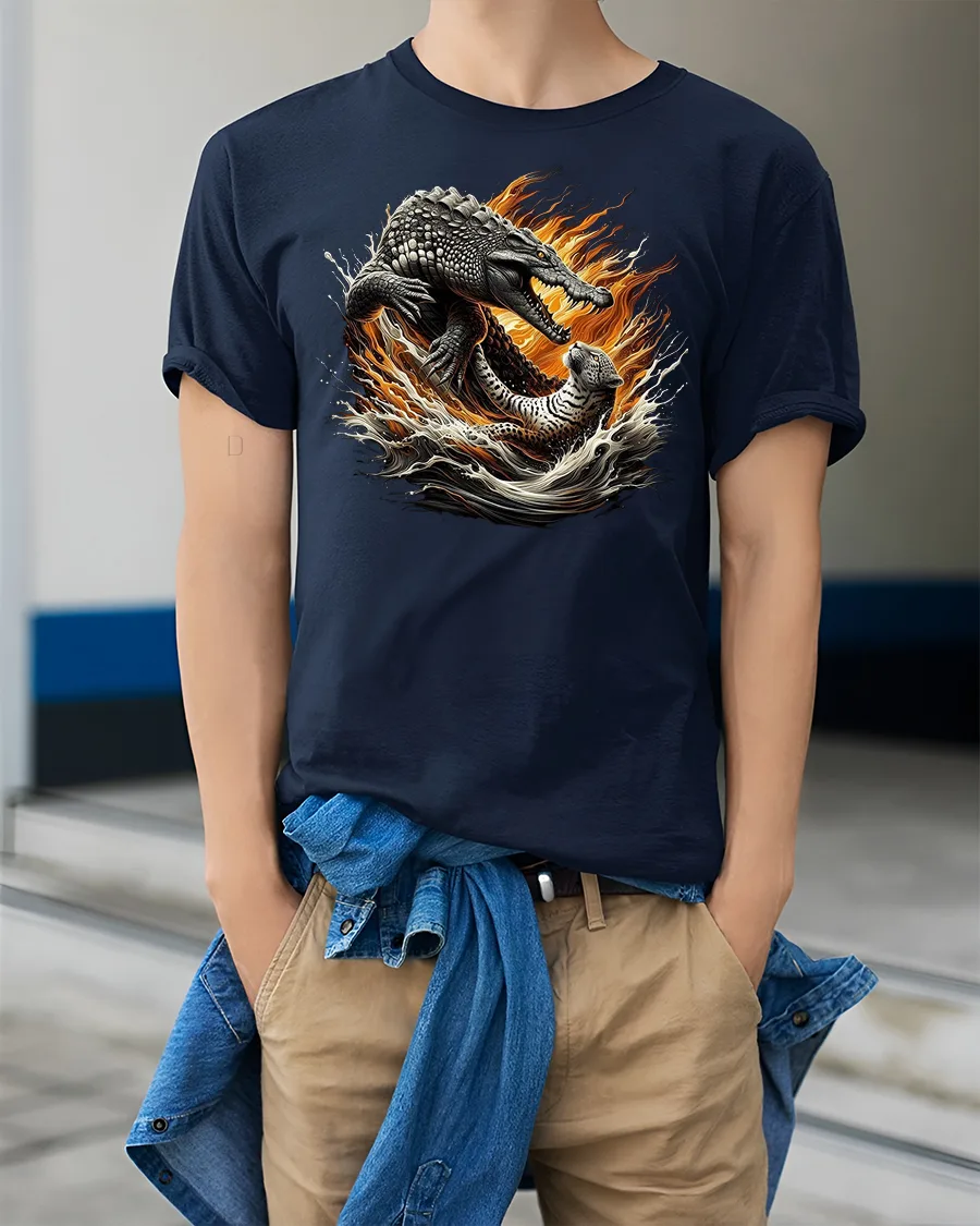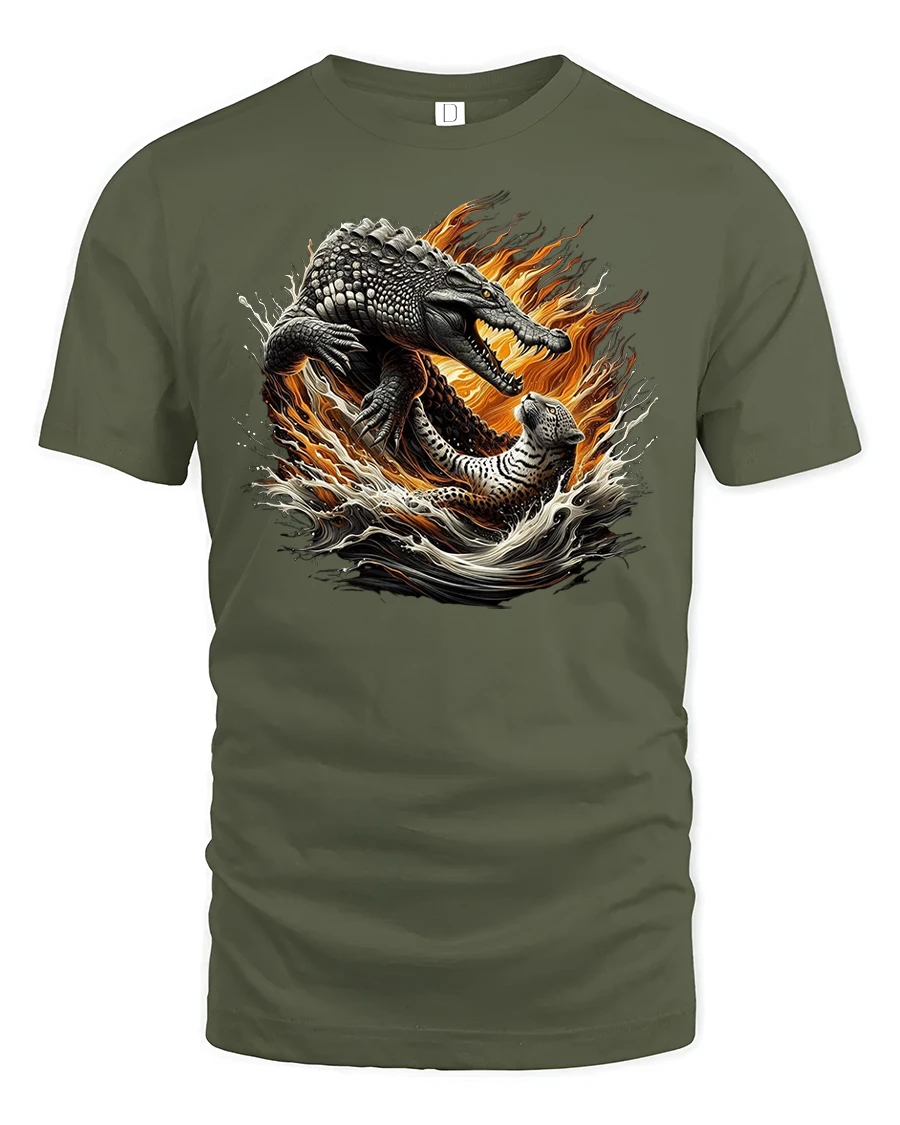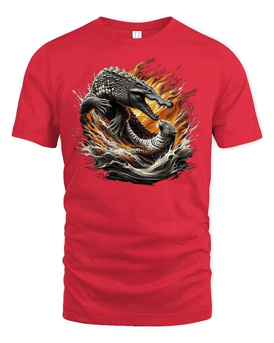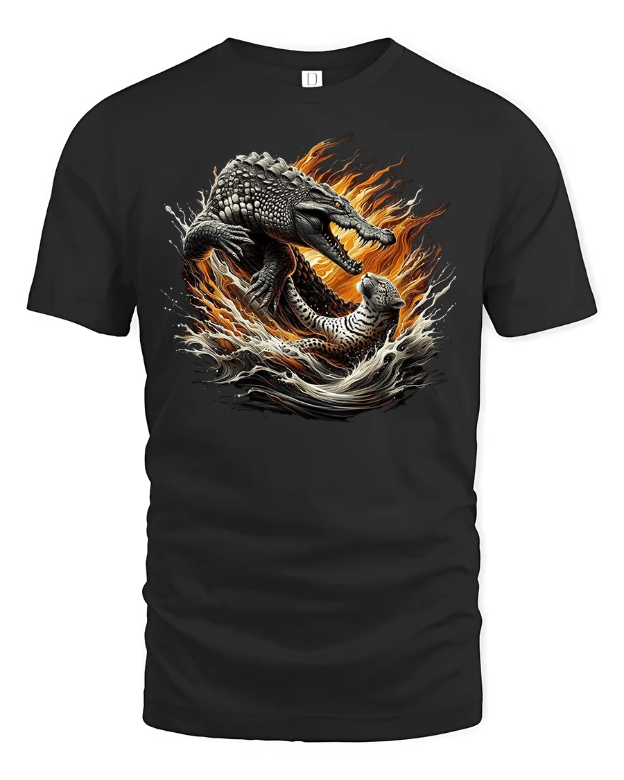 The Crocodile vs Leopard Wild Battle Graphic Print T-Shirt captures the raw power and intensity of nature’s fiercest predators. Featuring a crocodile locked in combat with a leopard, surrounded by fiery splashes and dramatic detail, this tee is designed for those who love bold, eye-catching artwork. The dynamic clash of two wild beasts makes this shirt stand out as a true statement piece.