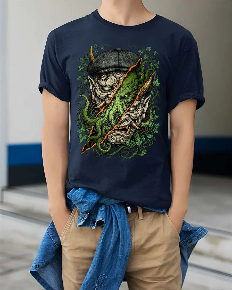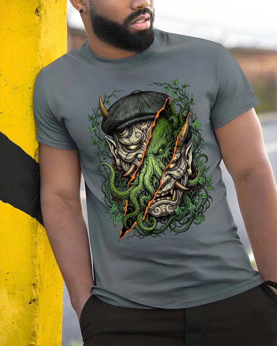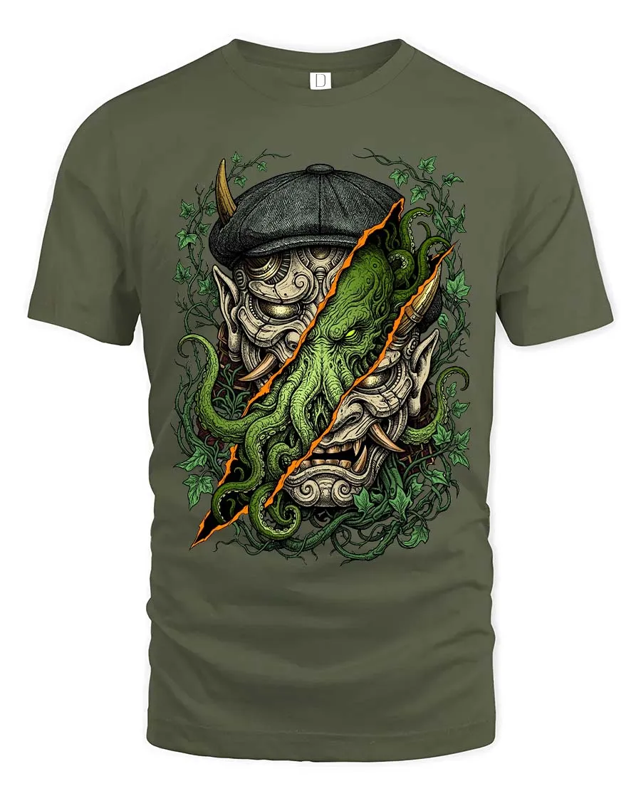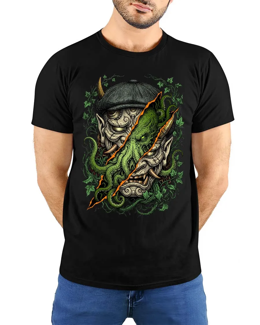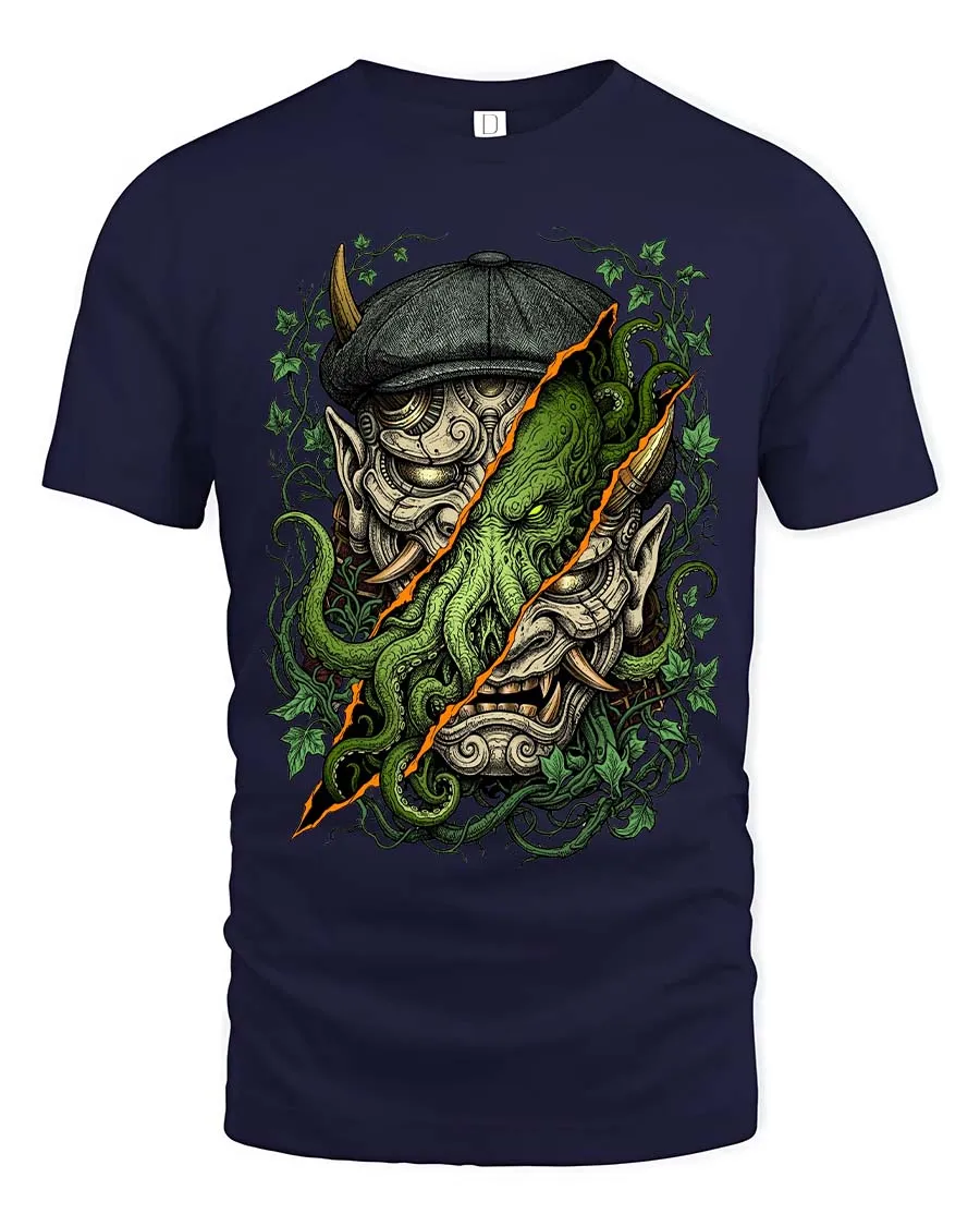 Cthulhu Skull Mask Graphic T Shirt Dark Horror Art Style delivers a bold fusion of dark fantasy and eerie artistic detail in a striking visual design.