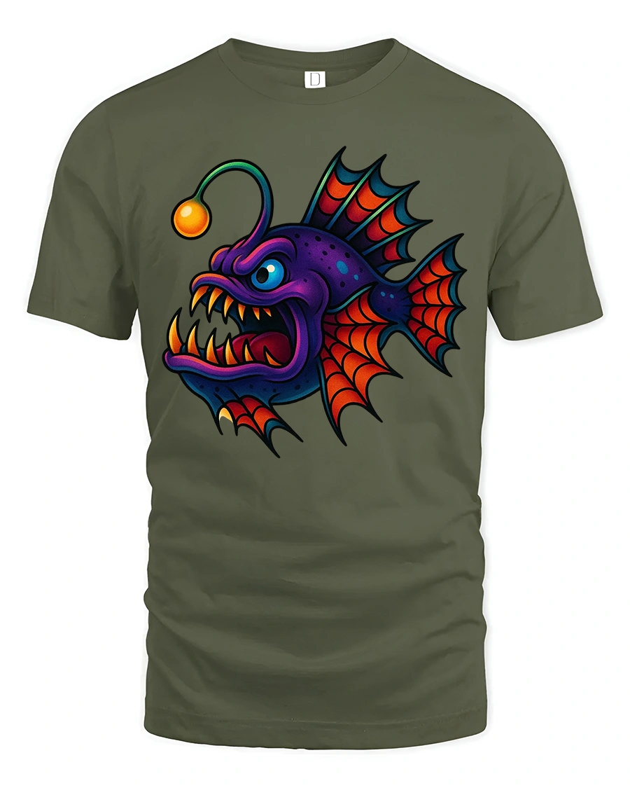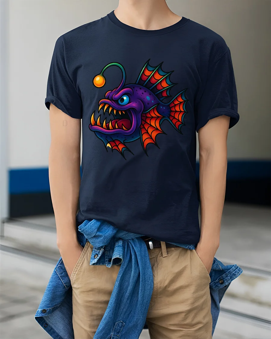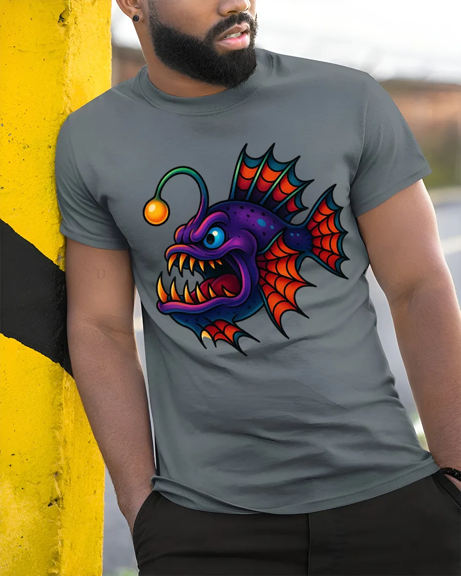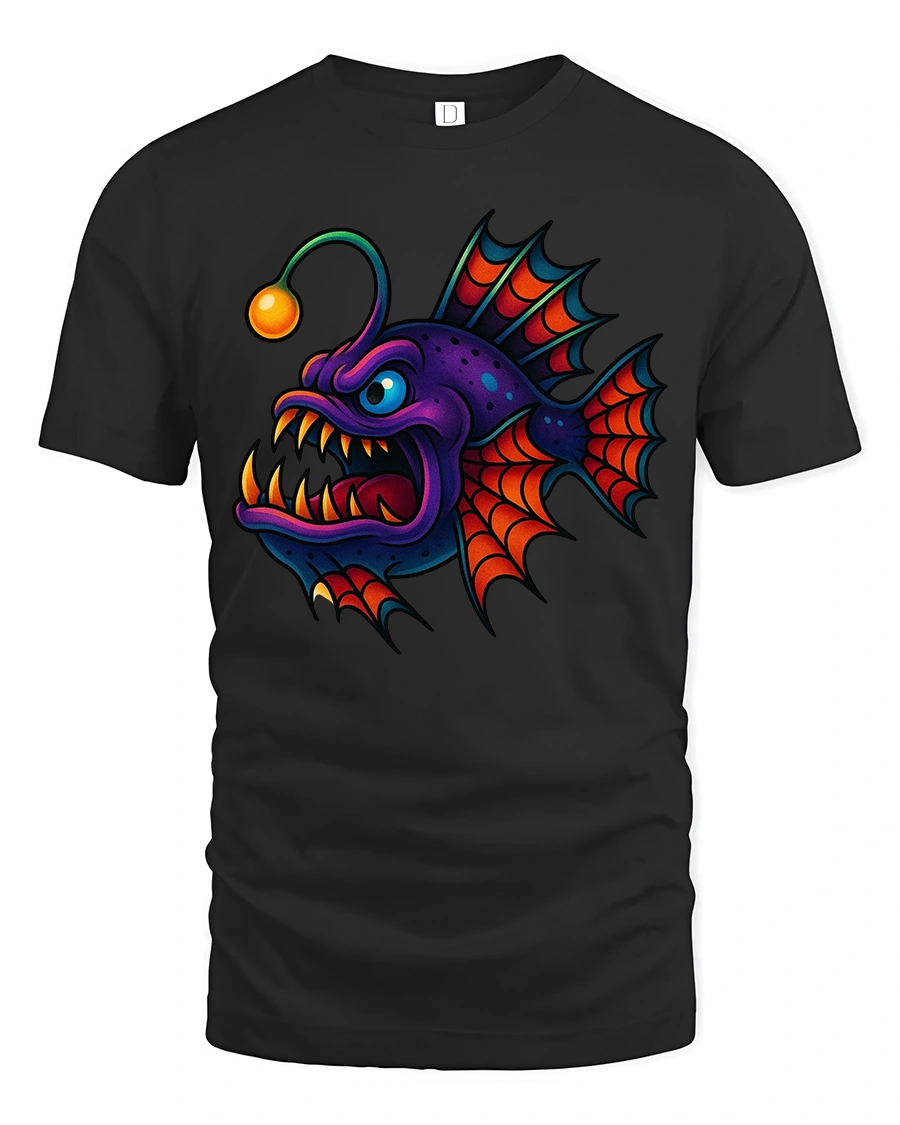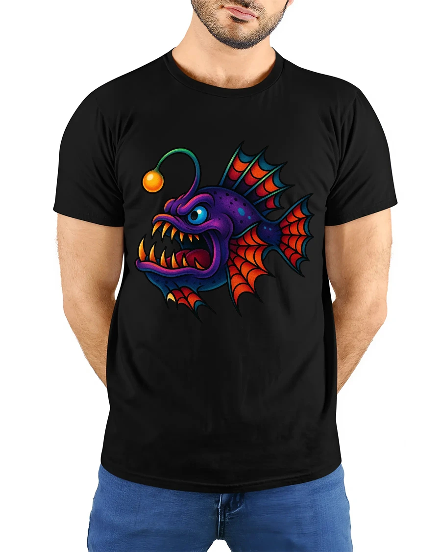 This tee features a colorful anglerfish monster with sharp teeth glowing lure and exaggerated cartoon expression that feels playful and fierce.