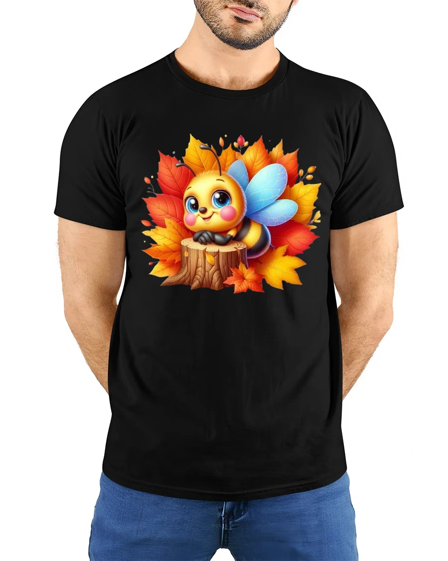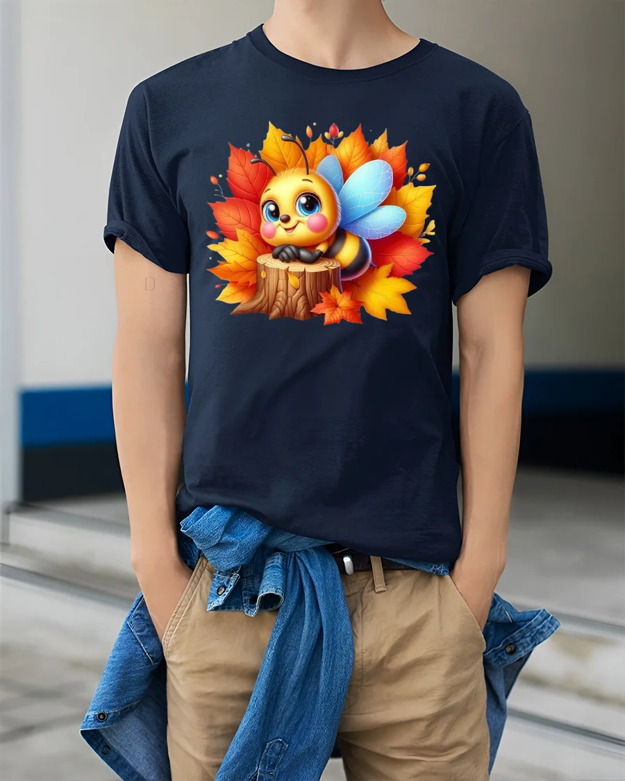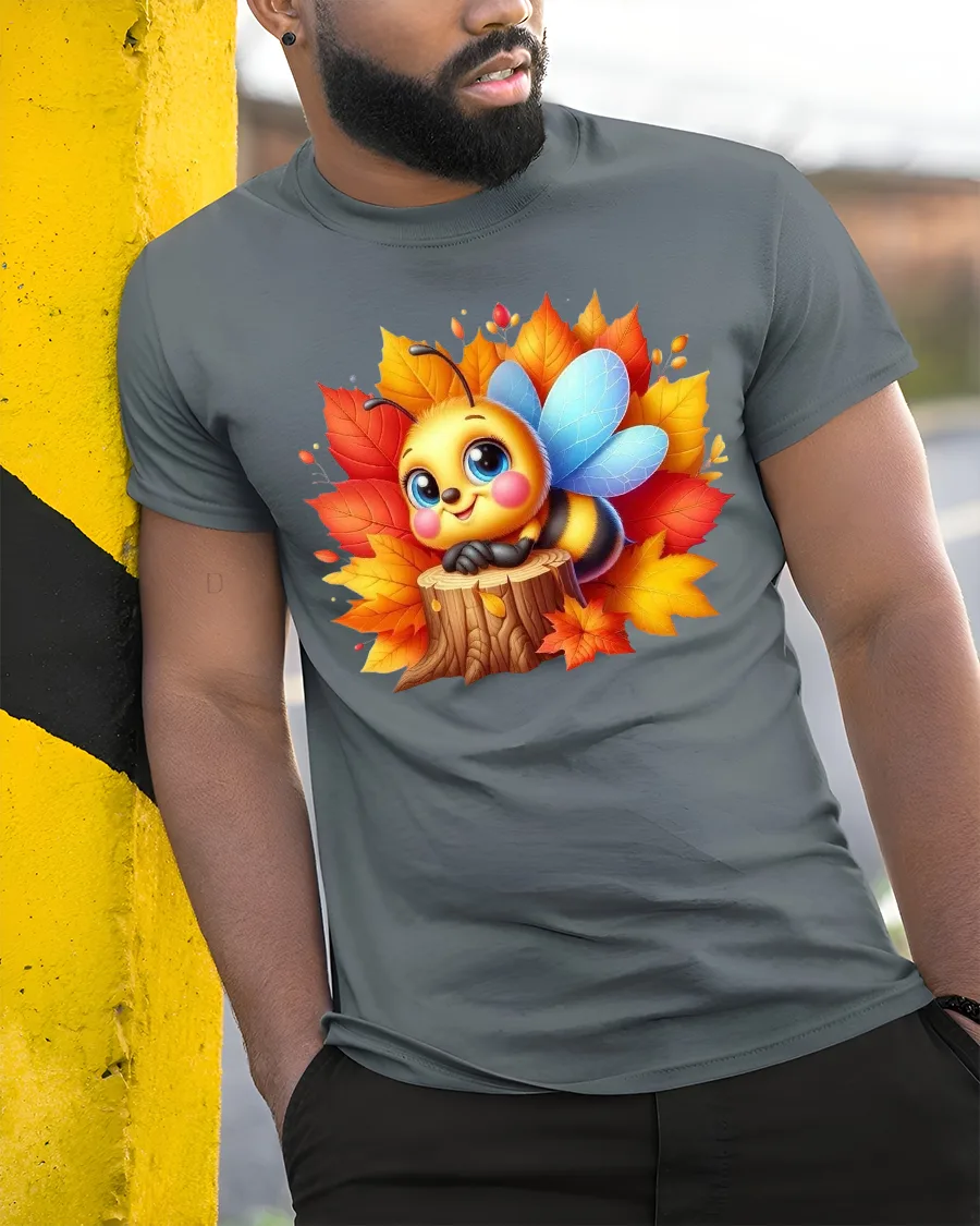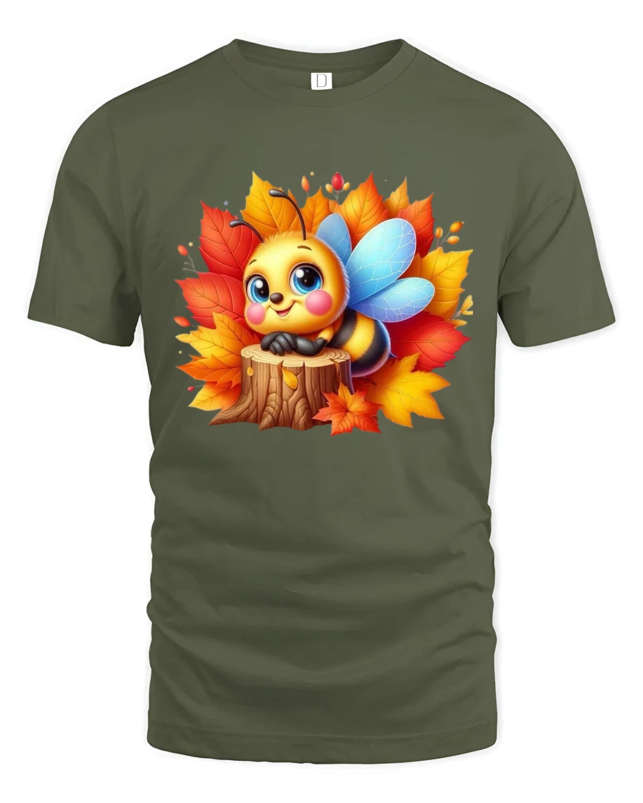 Cute Autumn Bee with Fall Leaves Graphic T-Shirt brings the warmth and charm of the fall season to your wardrobe. Featuring an adorable little bee resting on a tree stump surrounded by colorful autumn leaves, this cozy design perfectly captures the magic of harvest time. It’s ideal for bee lovers, nature enthusiasts, or anyone who adores cute and cheerful fall designs.