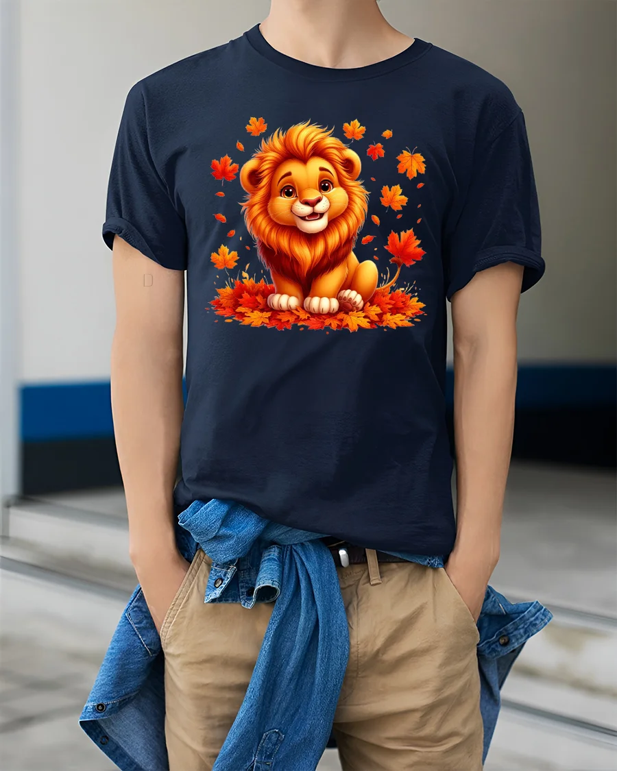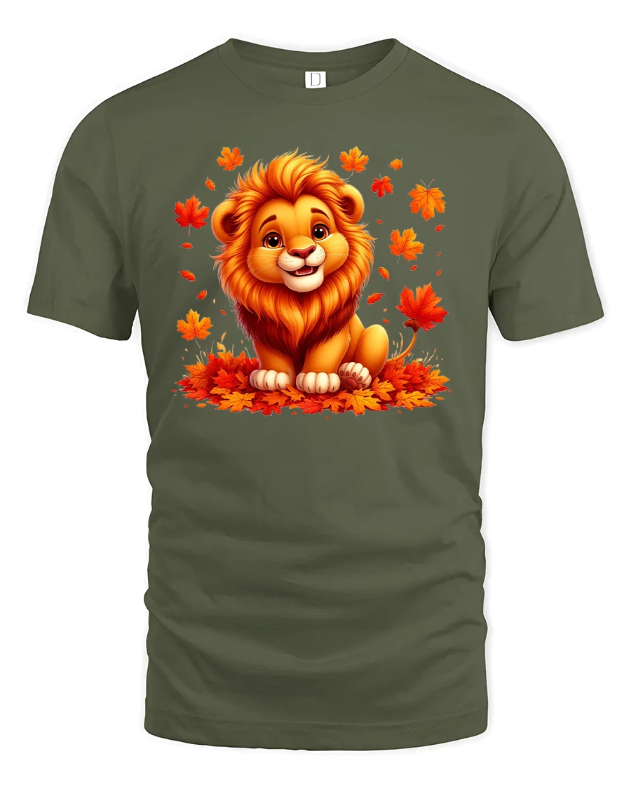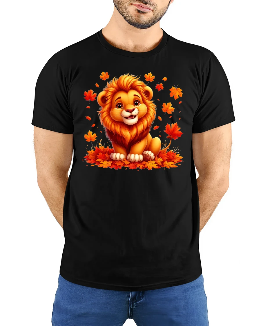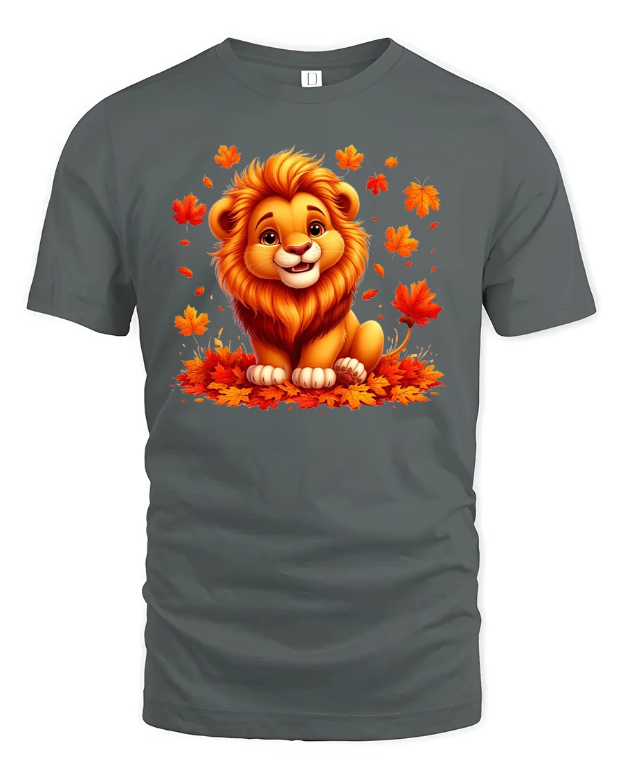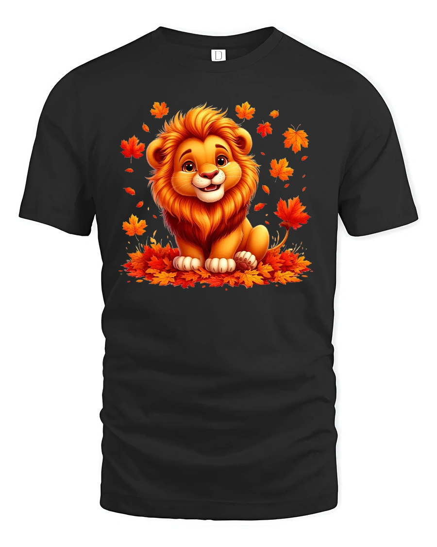 Cute Autumn Lion T-Shirt with Fall Leaves Print brings a touch of warmth, color, and cheer to your wardrobe.