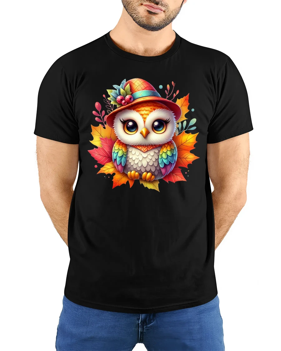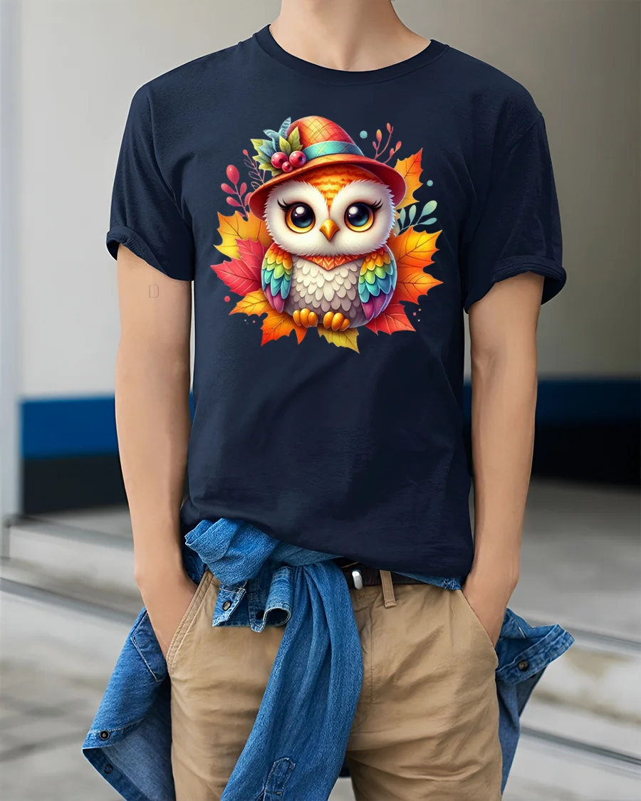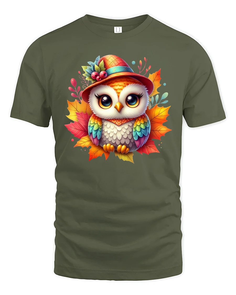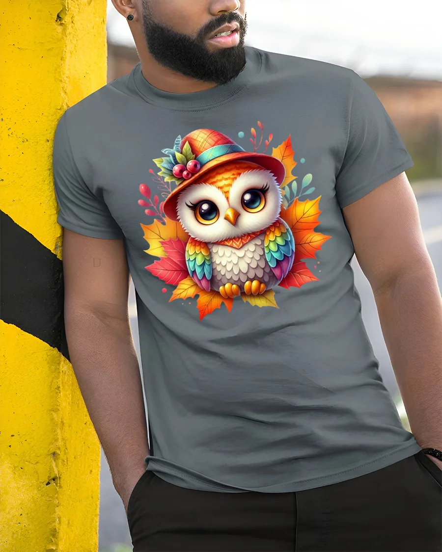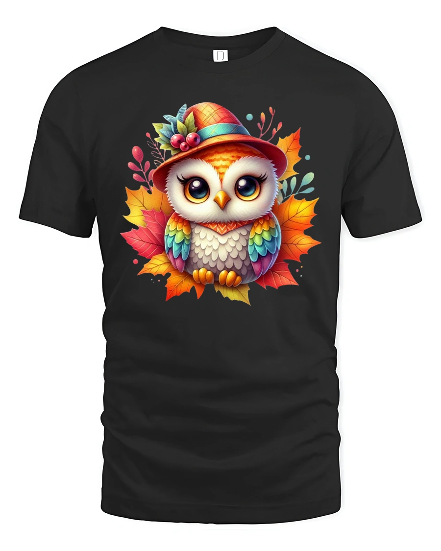 Featuring a bright-eyed owl dressed in a fall hat surrounded by colorful leaves, this tee is perfect for anyone who loves autumn, animals, or playful seasonal art.