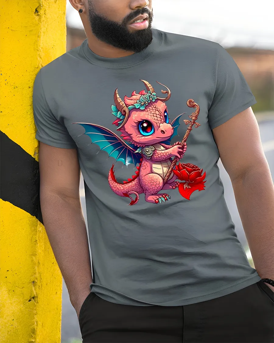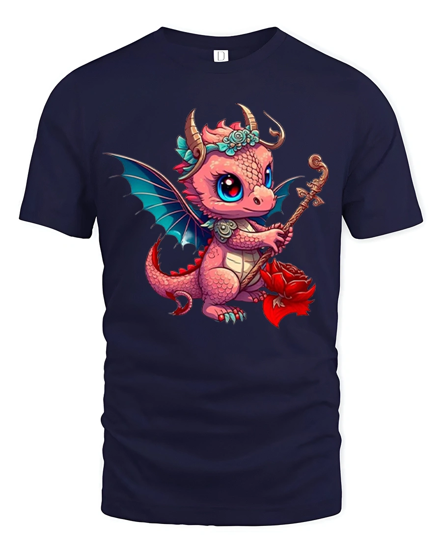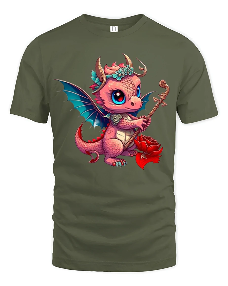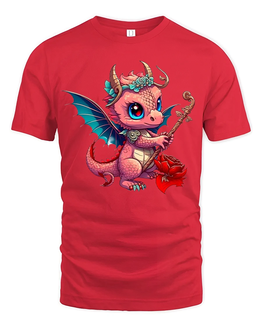 This graphic t shirt features an adorable baby dragon with big sparkling eyes tiny wings and a charming pose holding a magical staff and flower that instantly captures hearts.